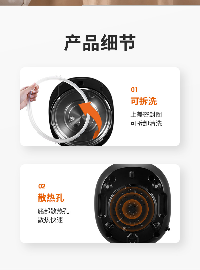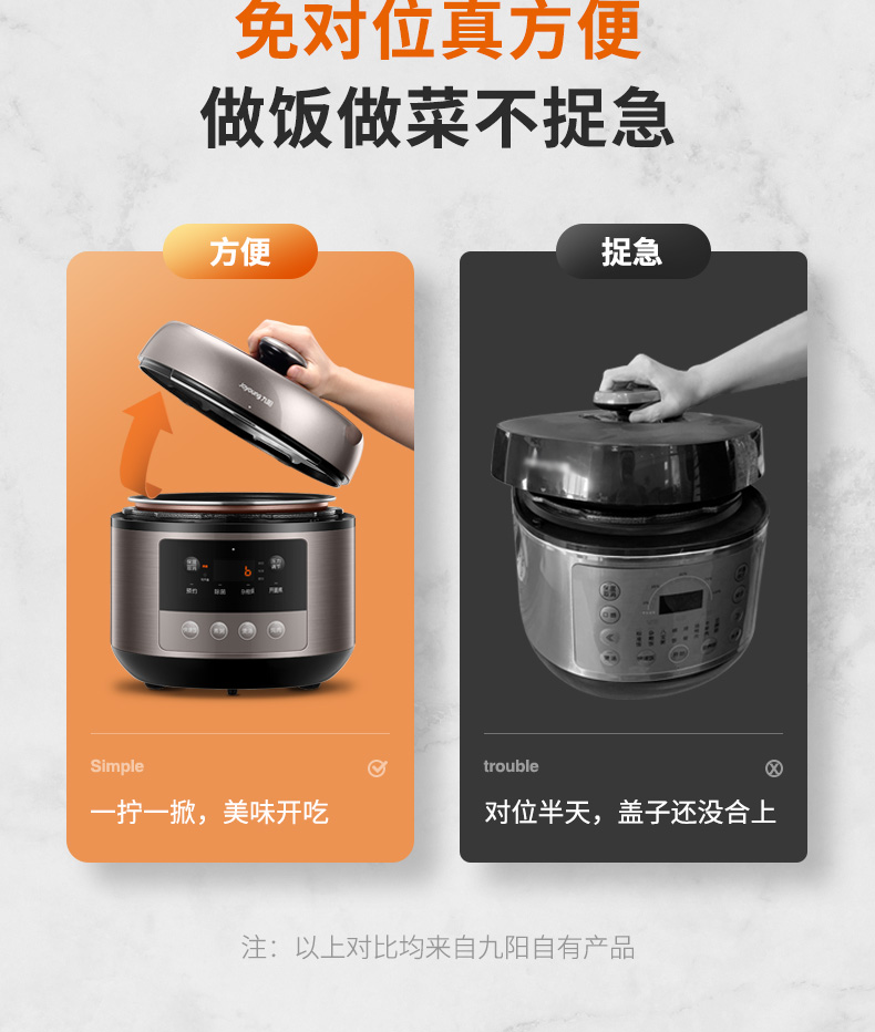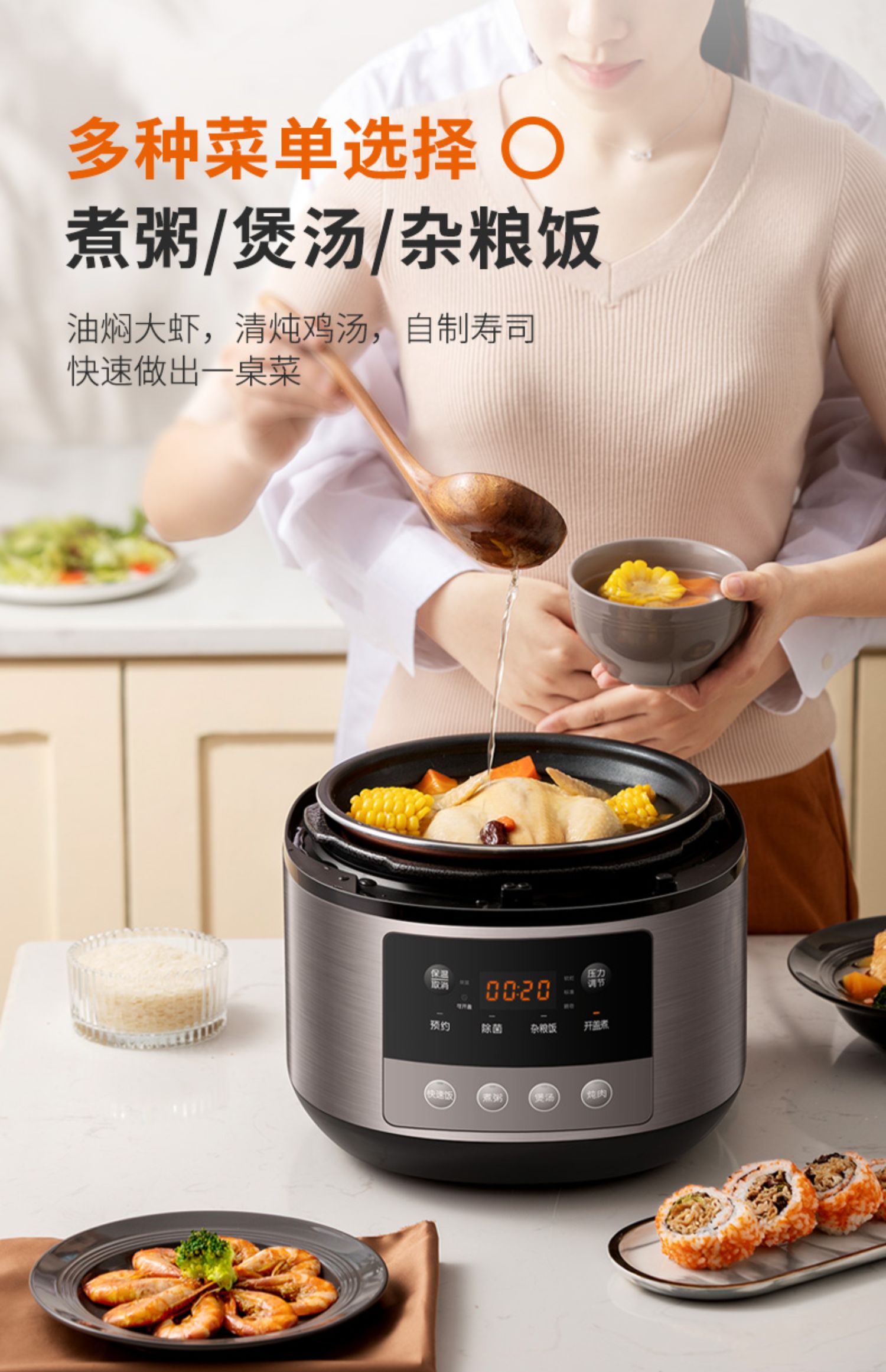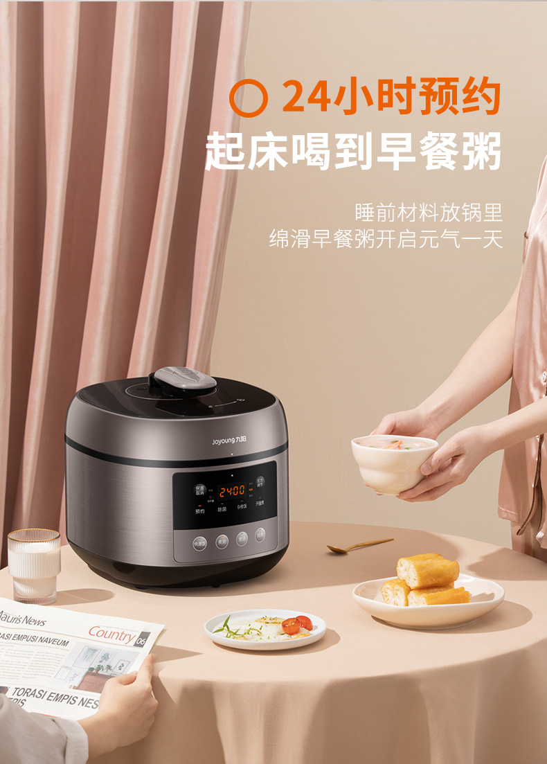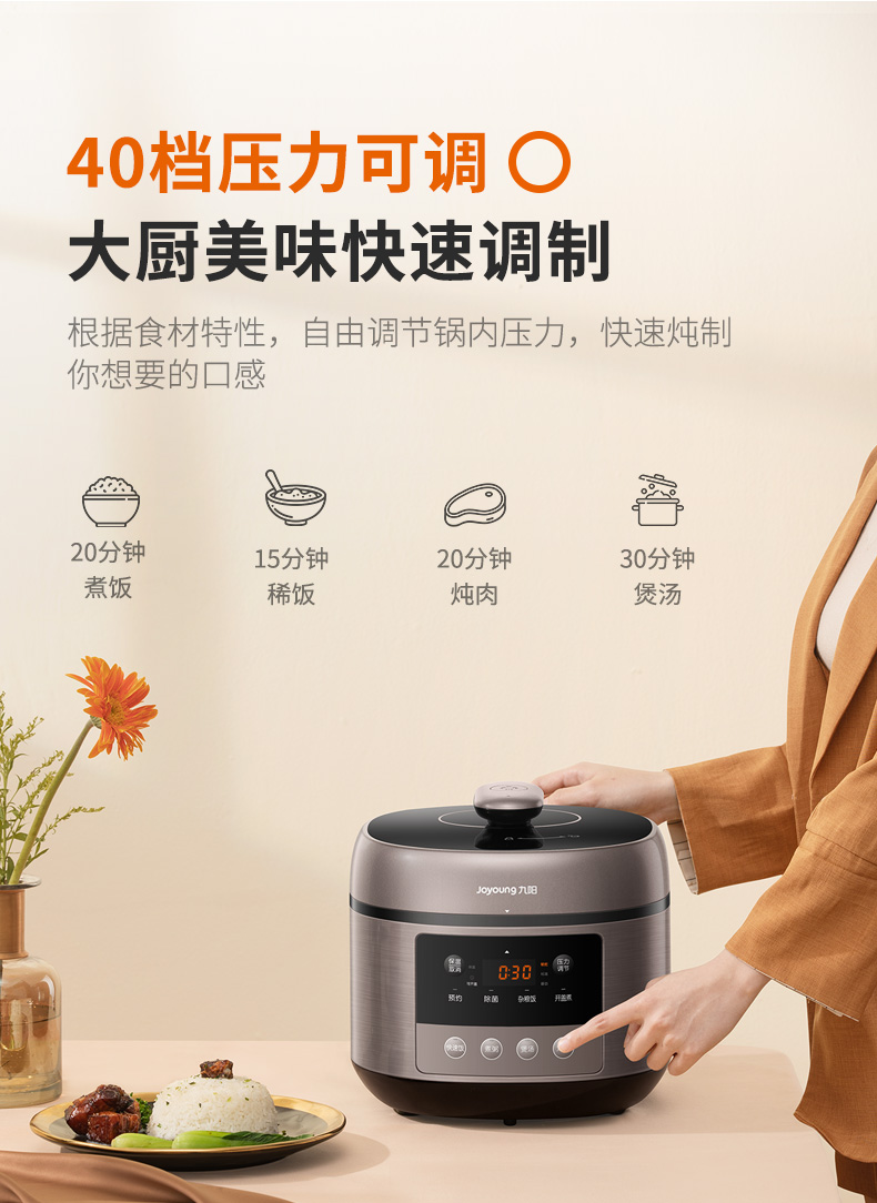 球釜双胆,九阳6L大容量电压力锅,时尚方煲造型,一机双胆,多重安全防护,智能界面操控,24H智能预约,10大功能菜单,更有轻养云食谱,智能实时菜单,美味轻松选择,煲煮炖闷吃你想吃的