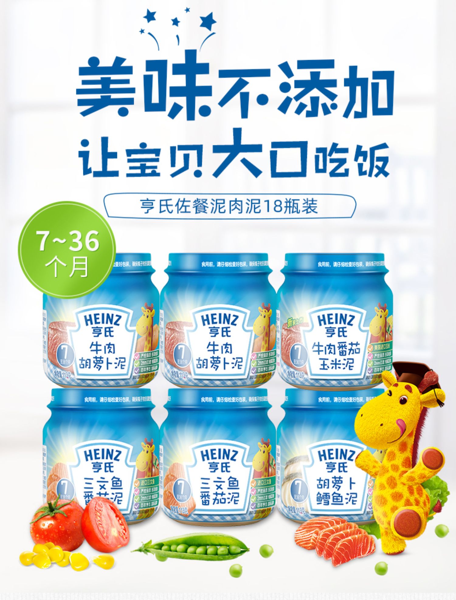 【足足18瓶呢!百年亨氏旗舰店】健康食材,科学配比,两种口感工艺,也能让宝宝每天吃到新鲜美味,便利包装,随时承地都能享用,妈妈们不再费心,国际营养师推荐~