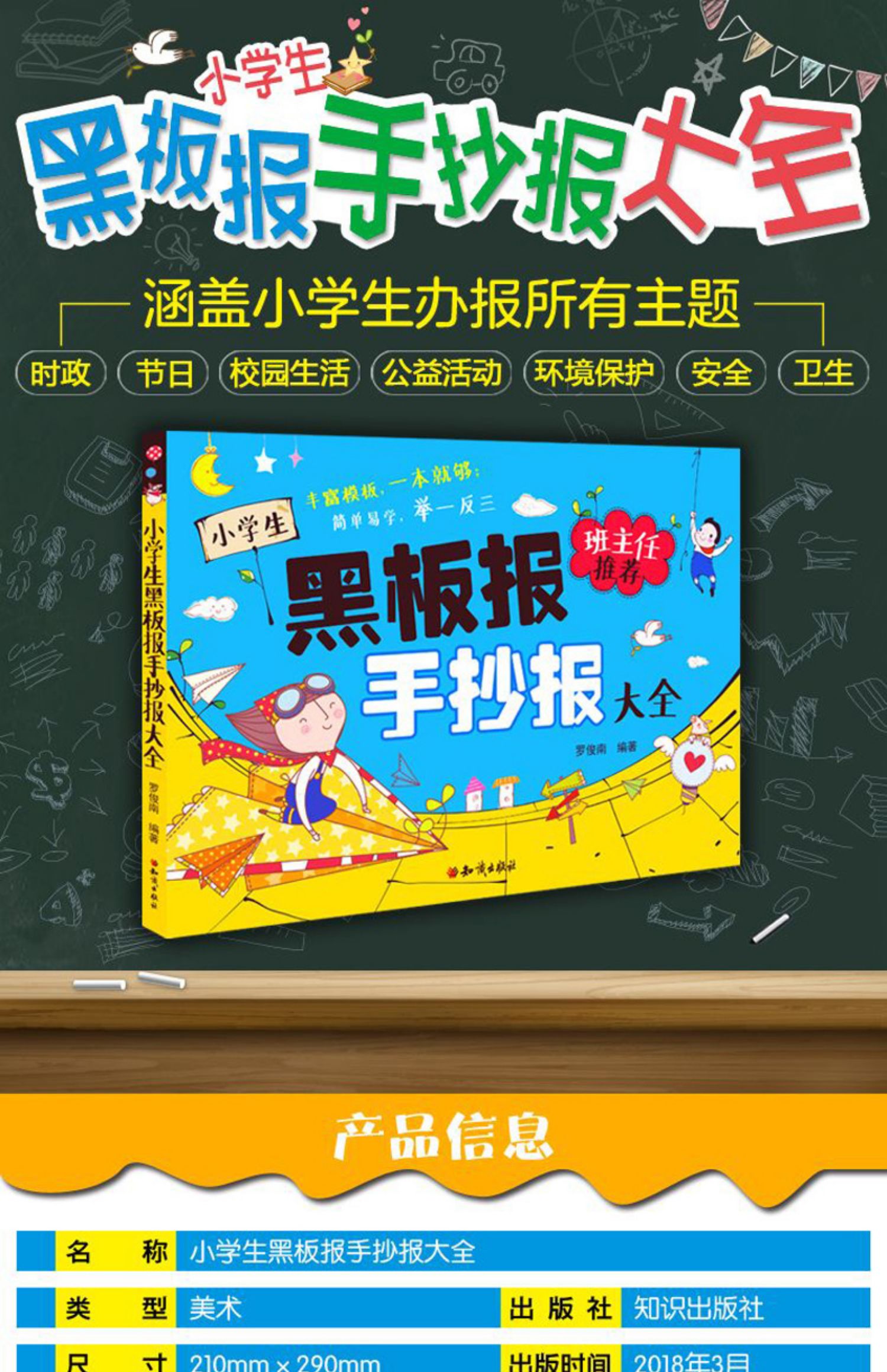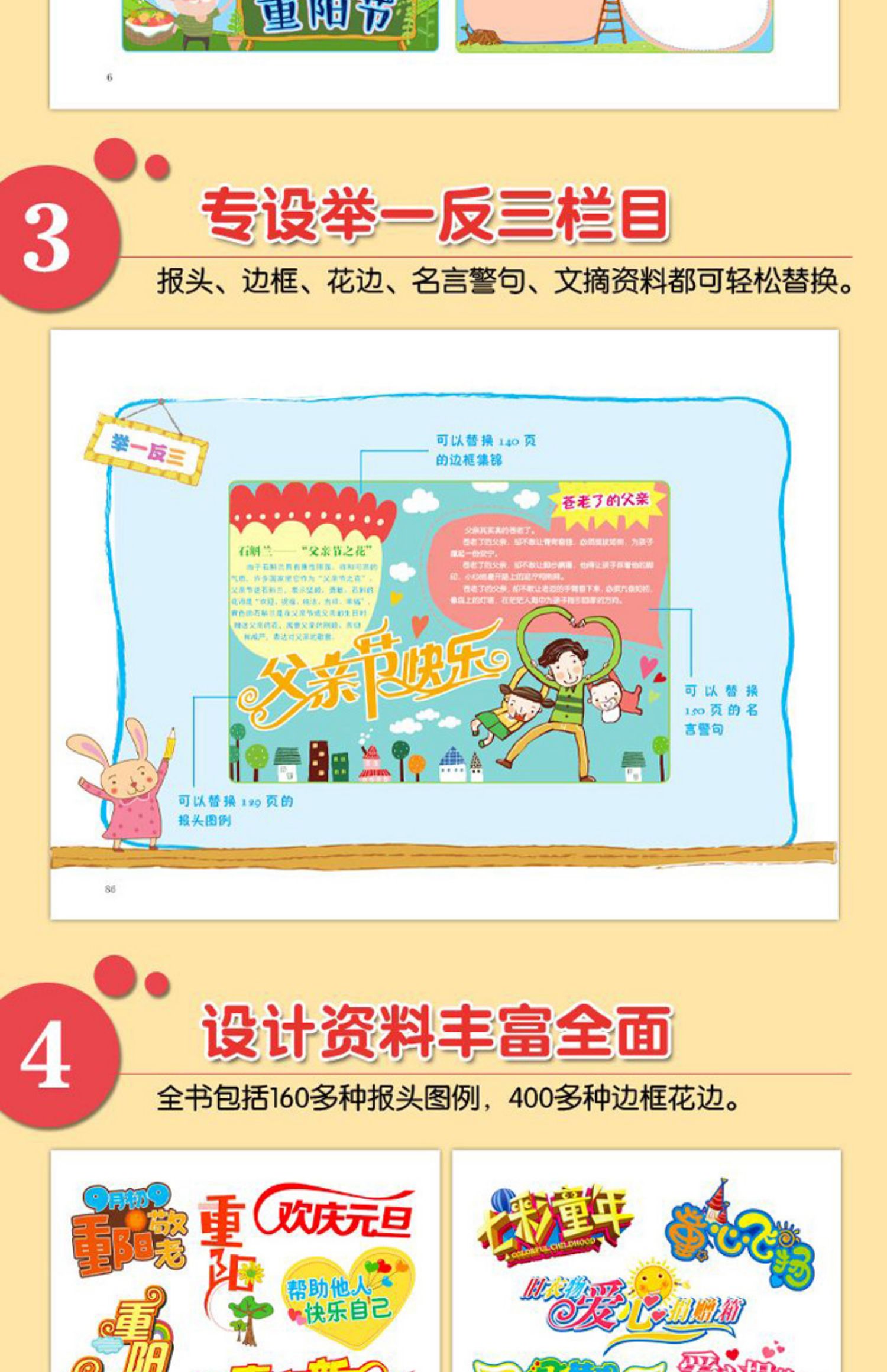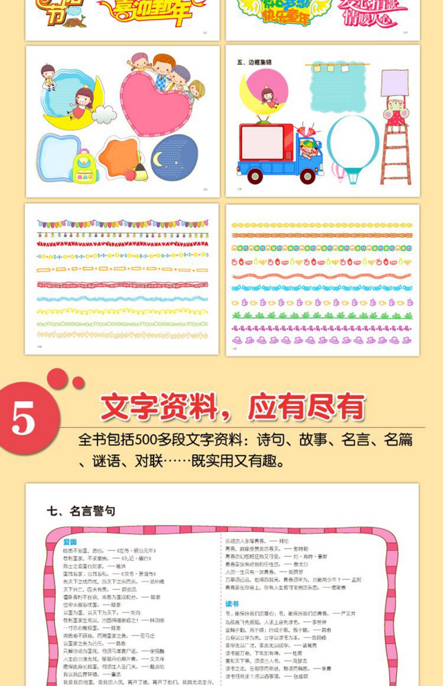 【涵盖小学生办报所有主题】160种报头图例,80个设计模板,400种边框花边,500段文字资料。黑板板轻松搞定,与众不同。