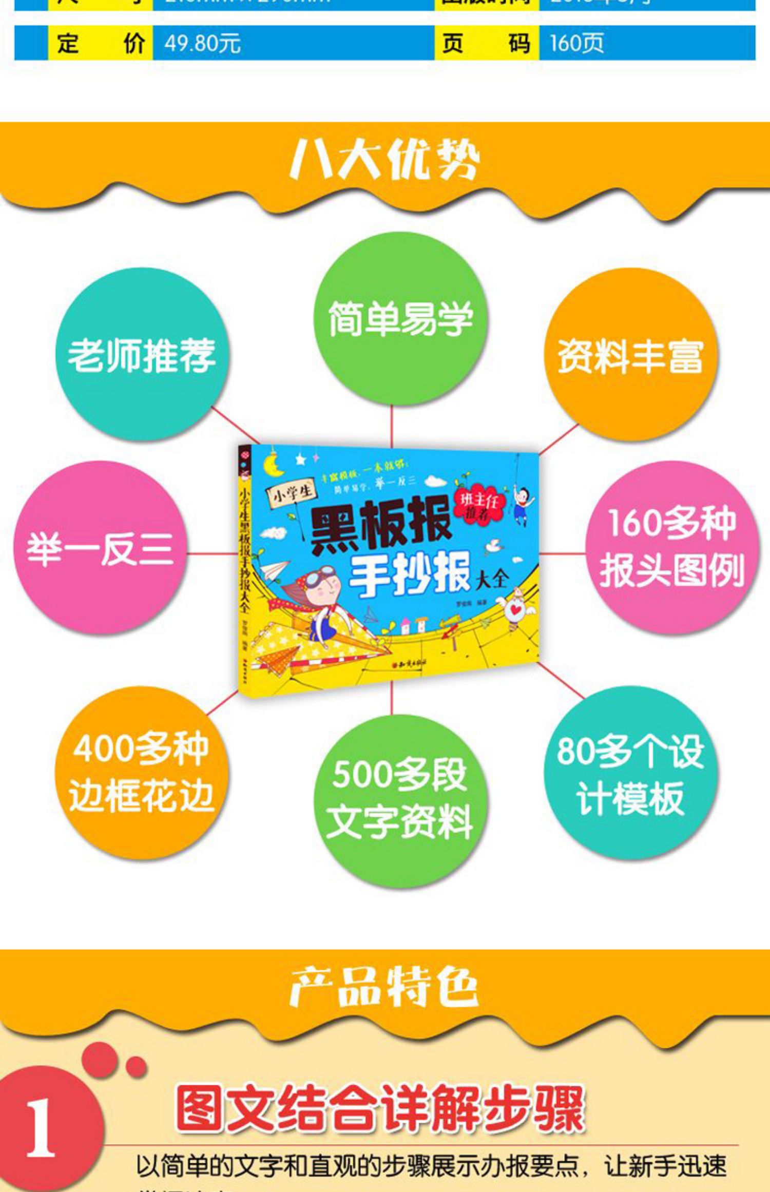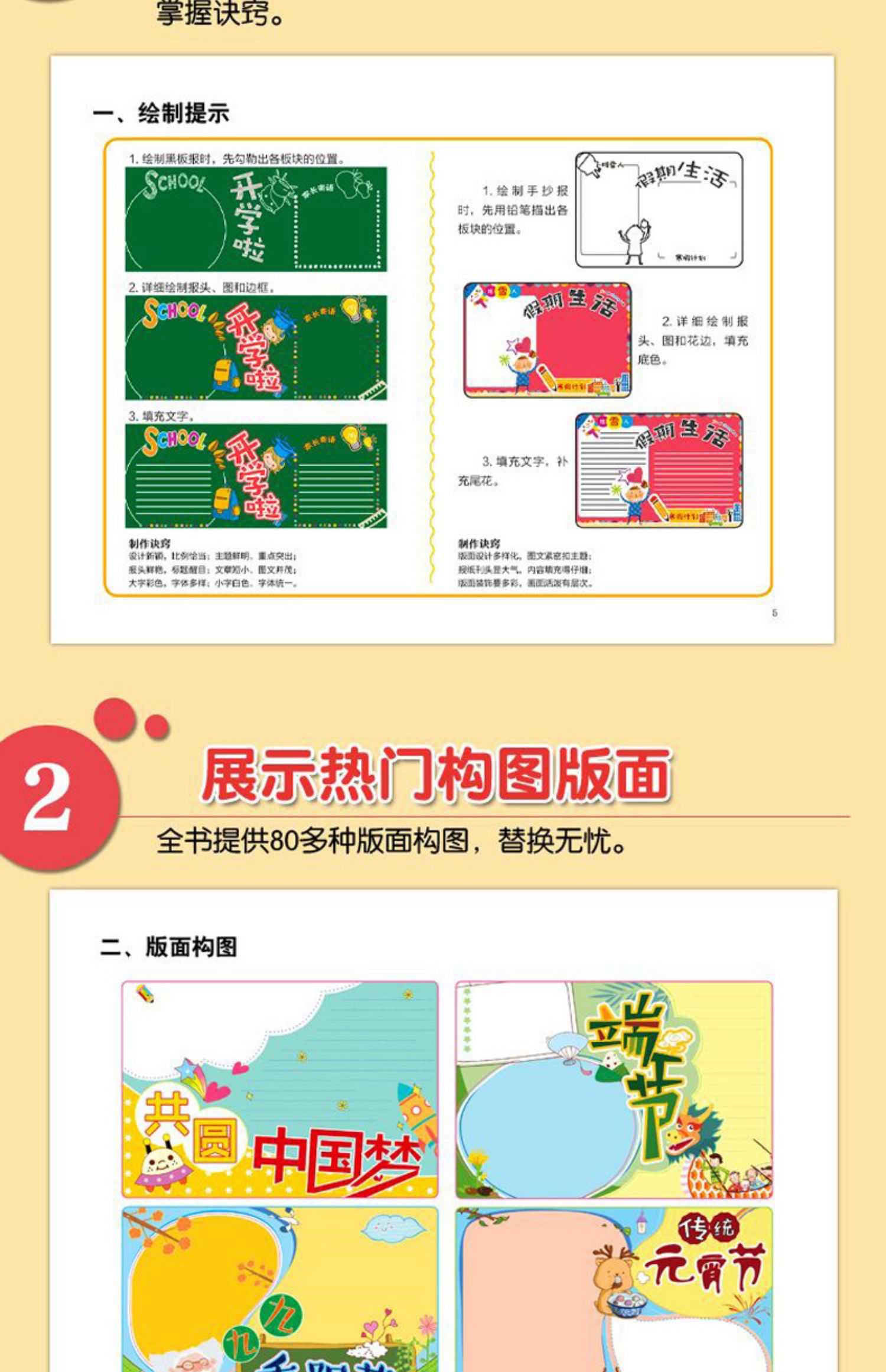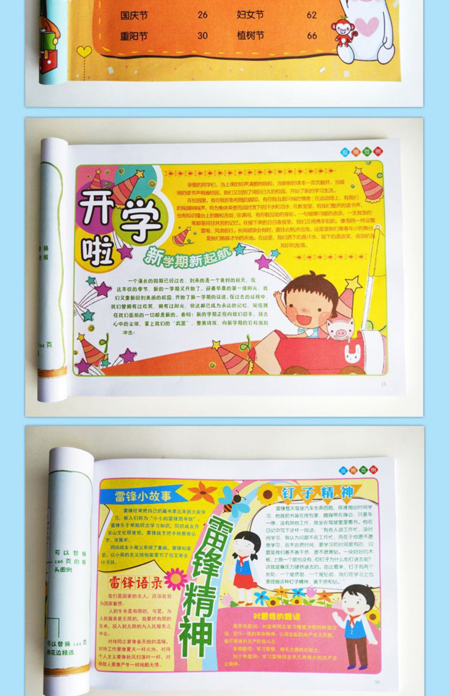 【涵盖小学生办报所有主题】160种报头图例,80个设计模板,400种边框花边,500段文字资料。黑板板轻松搞定,与众不同。