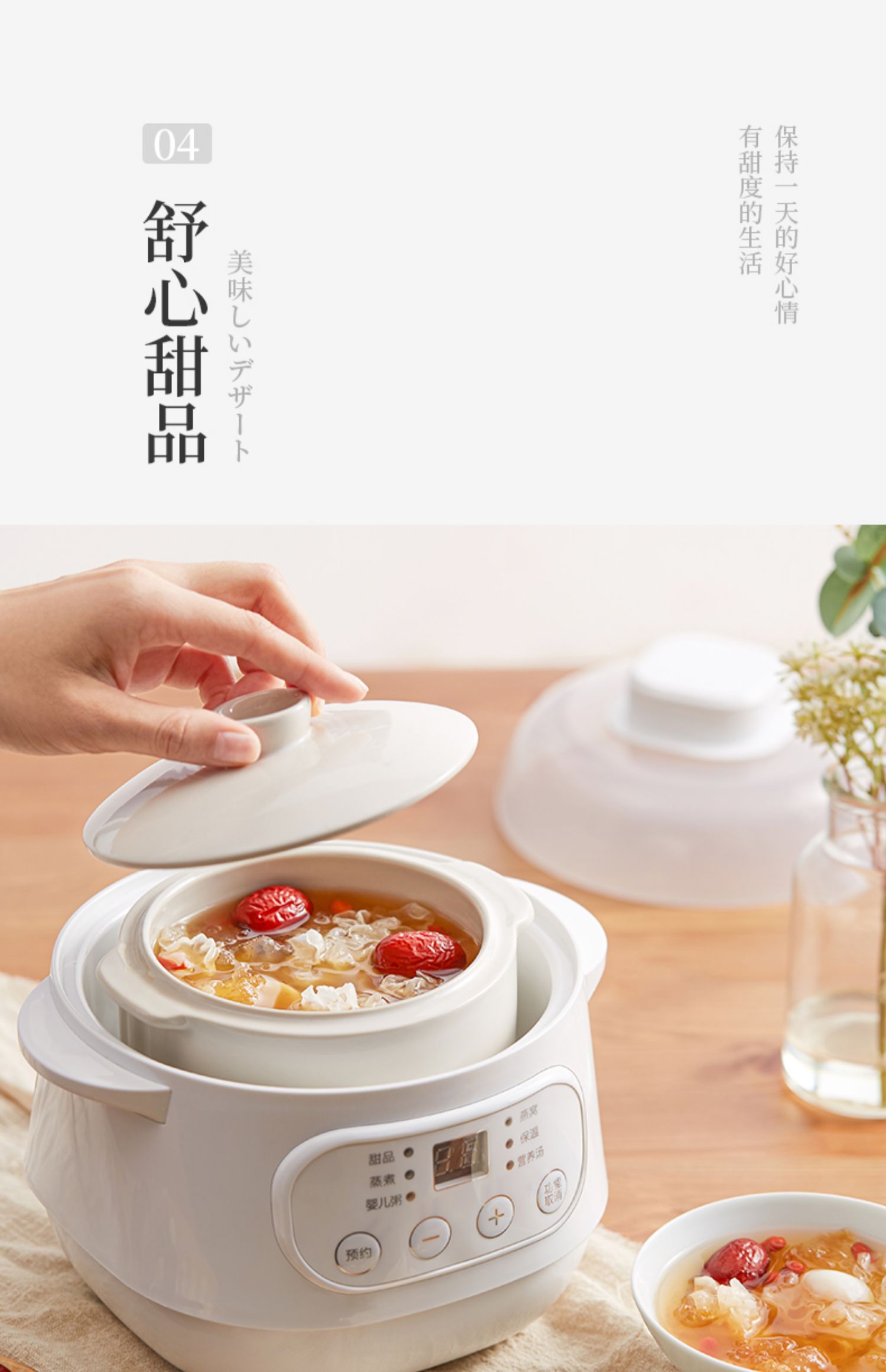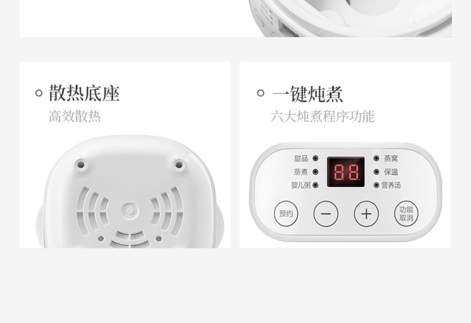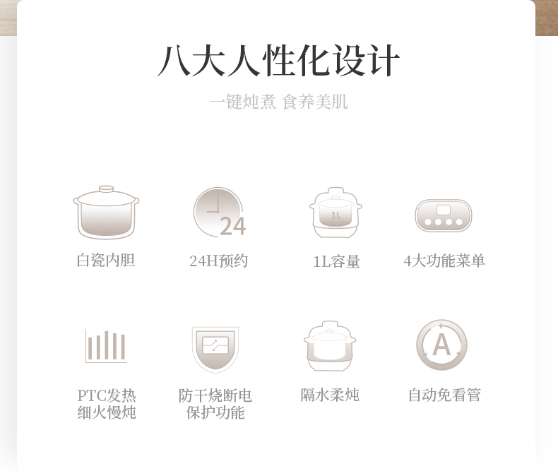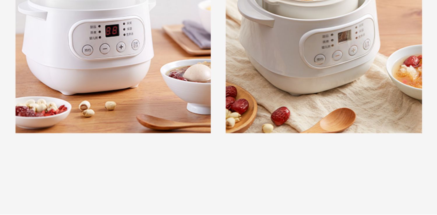 全自动电炖陶瓷锅,精选陶瓷内胆,3C质量认证,全国联保,温火细熬,安心不溢锅,静音运作,隔水慢炖,6大预设预约功能,打开生活便捷方式~