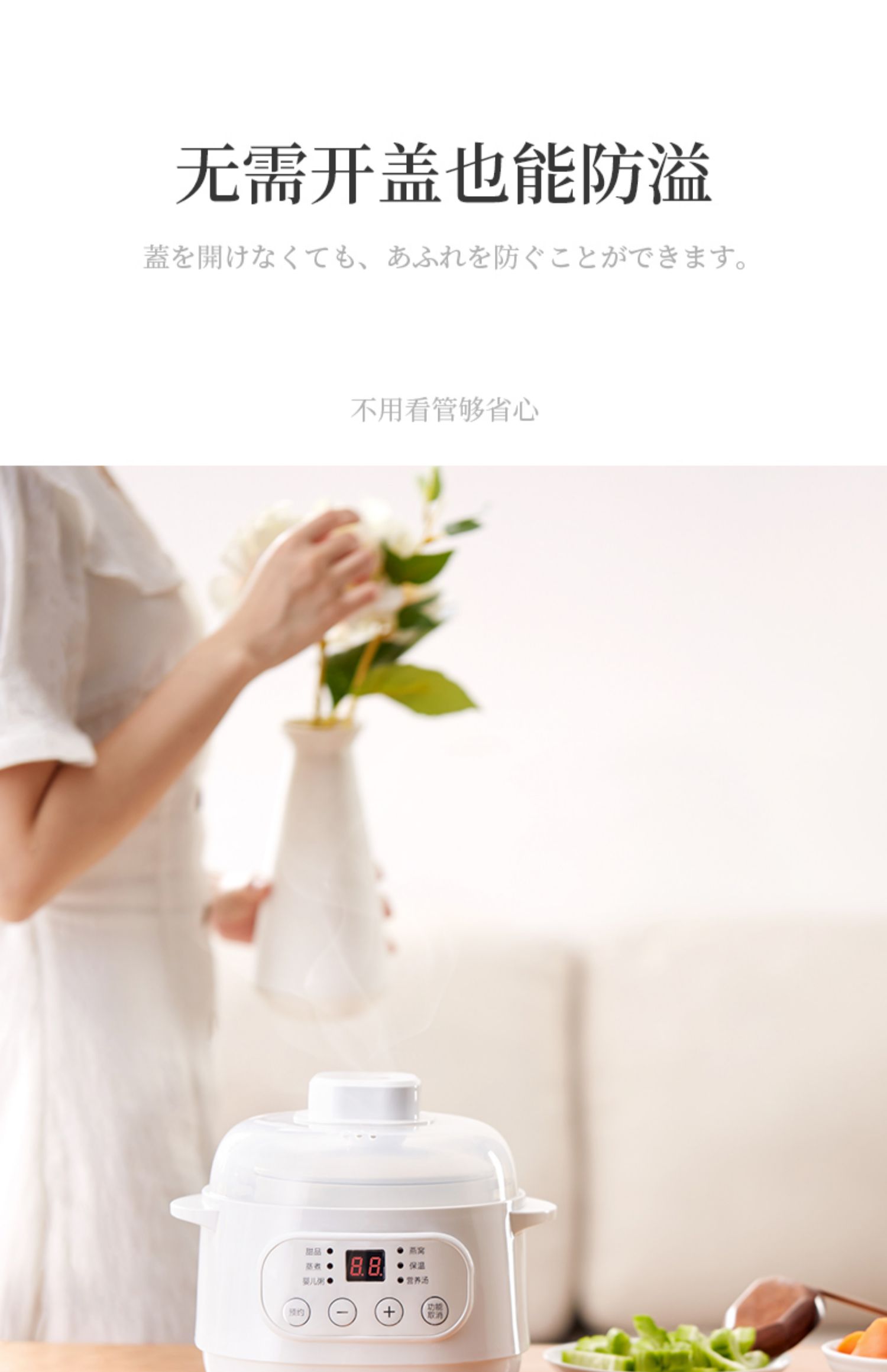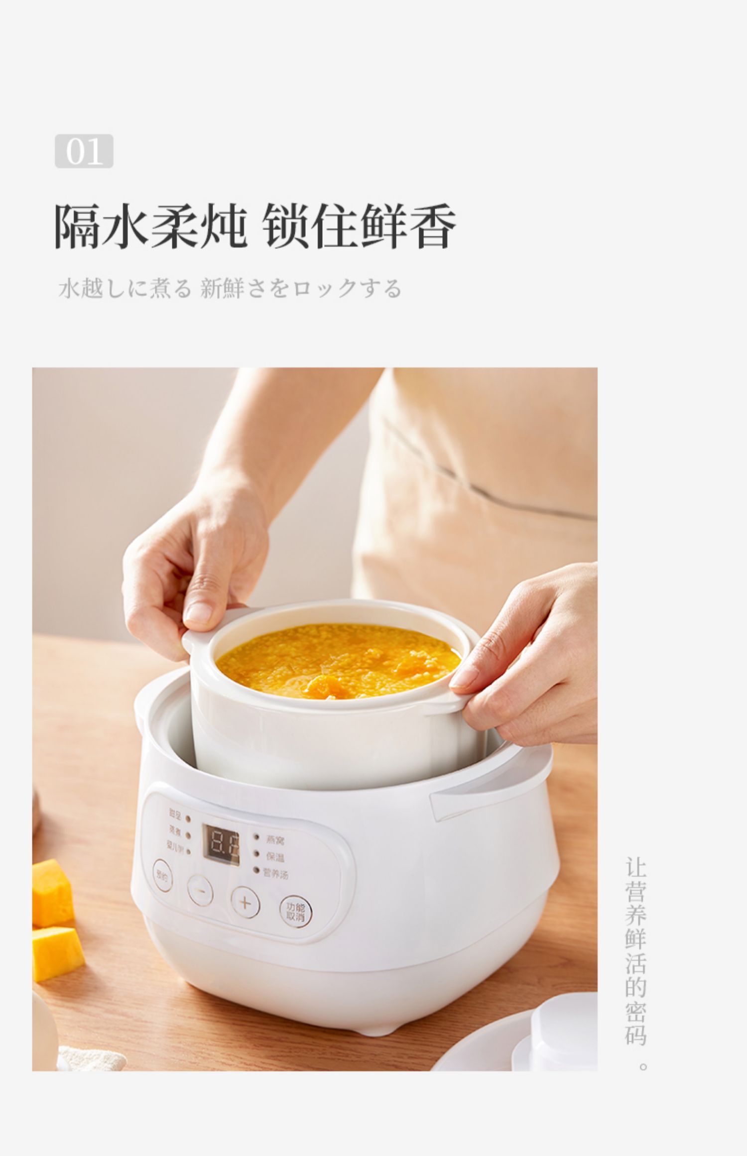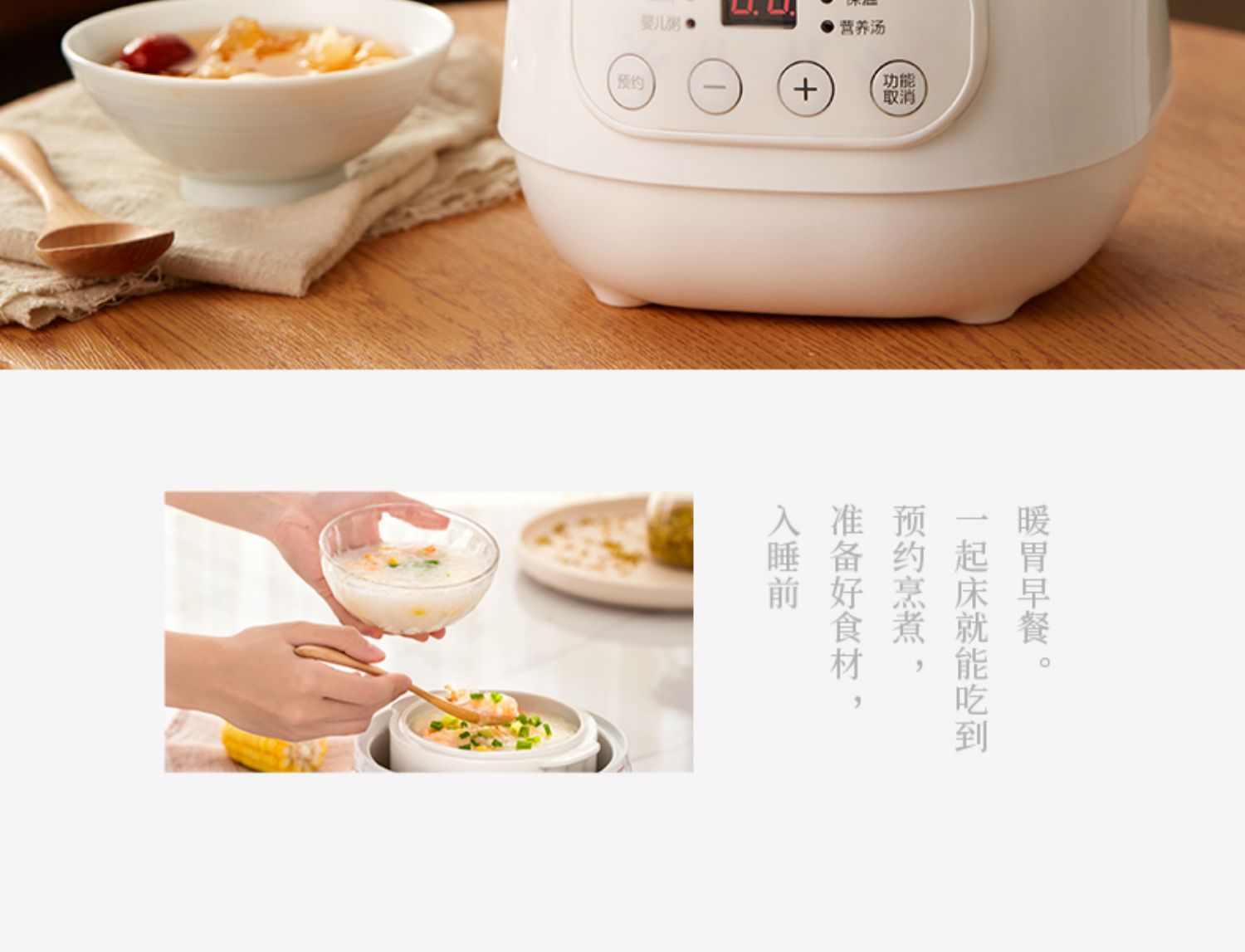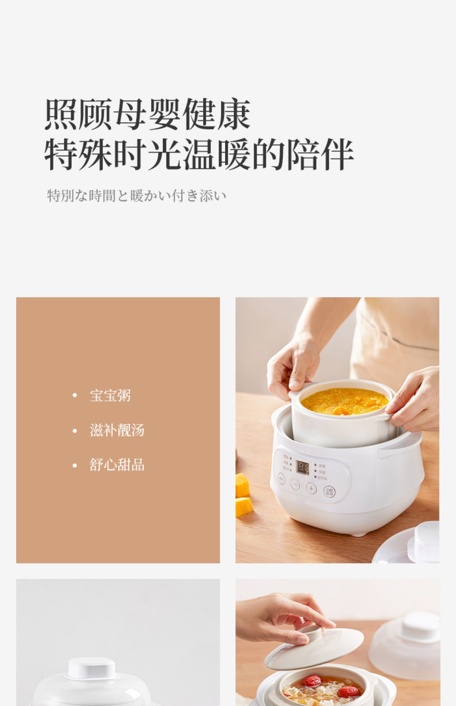 全自动电炖陶瓷锅,精选陶瓷内胆,3C质量认证,全国联保,温火细熬,安心不溢锅,静音运作,隔水慢炖,6大预设预约功能,打开生活便捷方式~