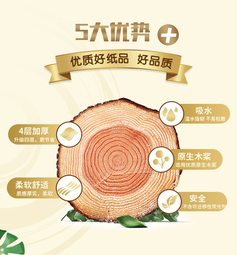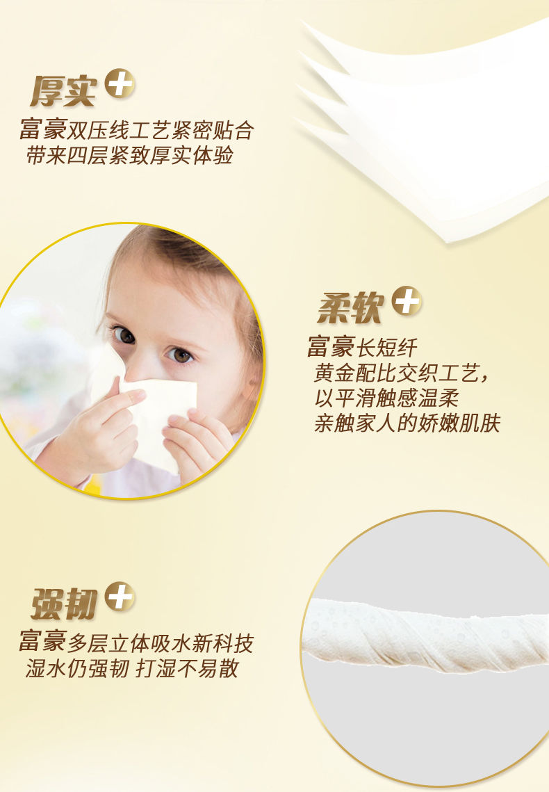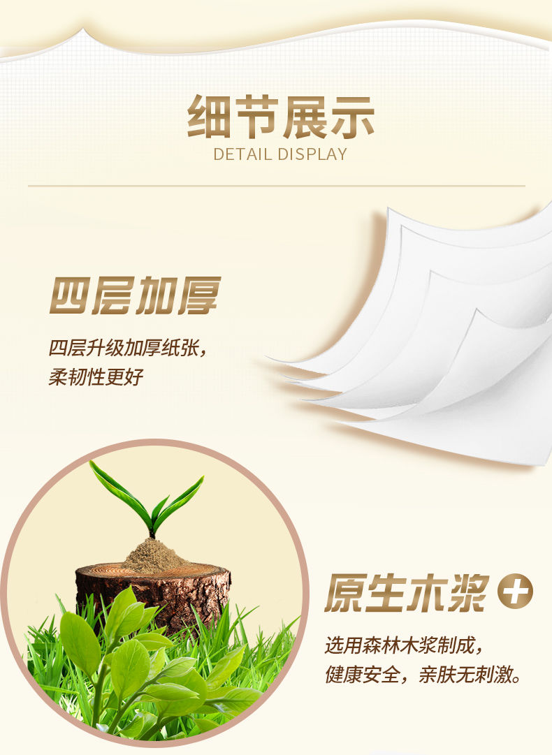 品质精心制造,天然原材料,纯净卫生!4层纸质厚实更强韧,湿水也可以使用,独特压纹,紧致结实不易散,加大克重,家用经济实惠!【赠运费险】