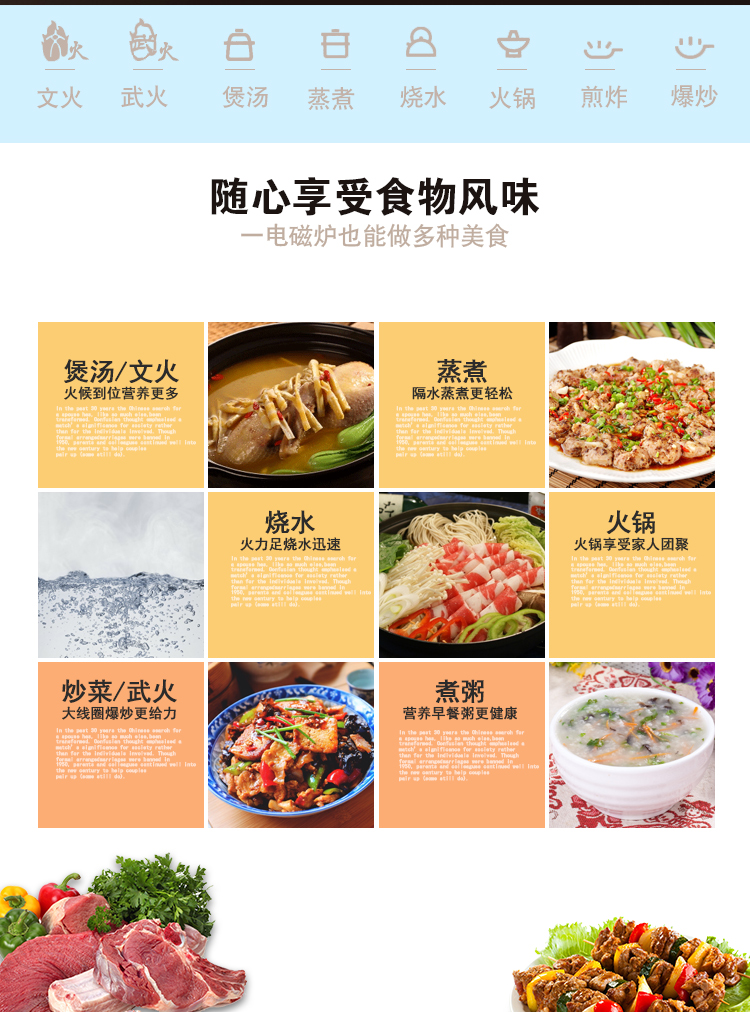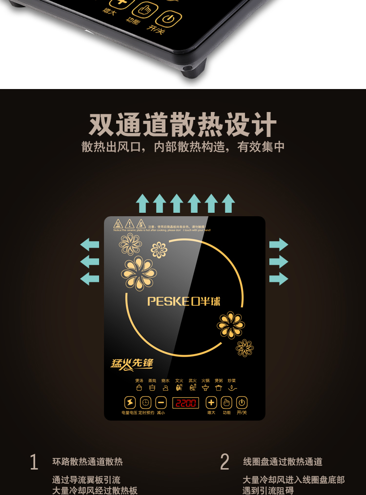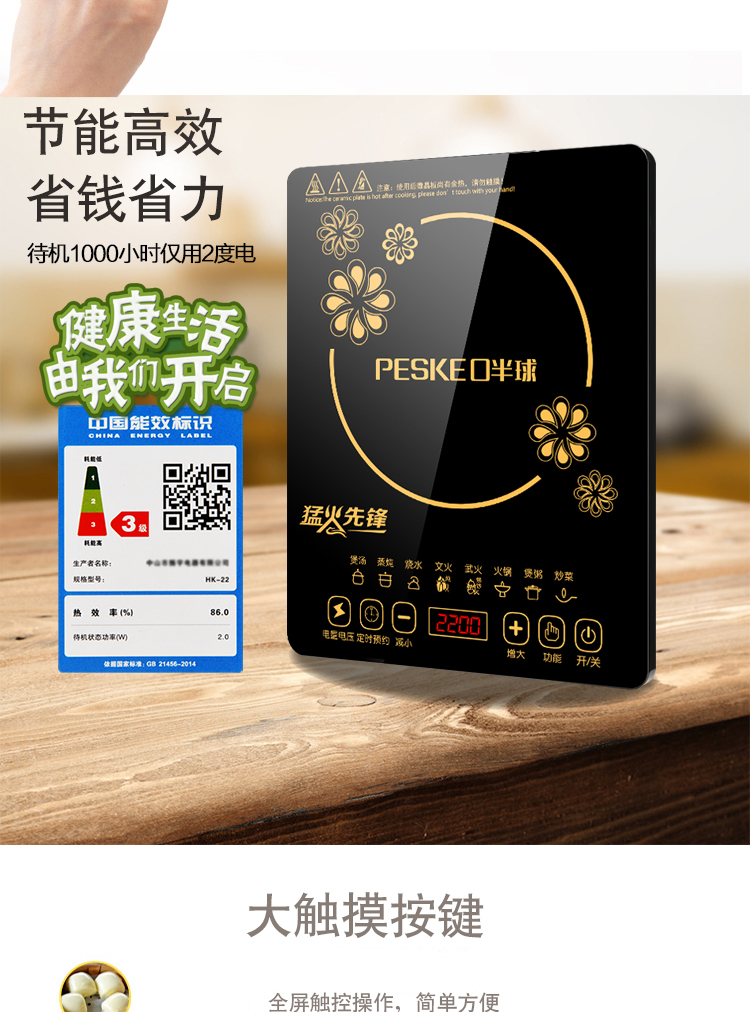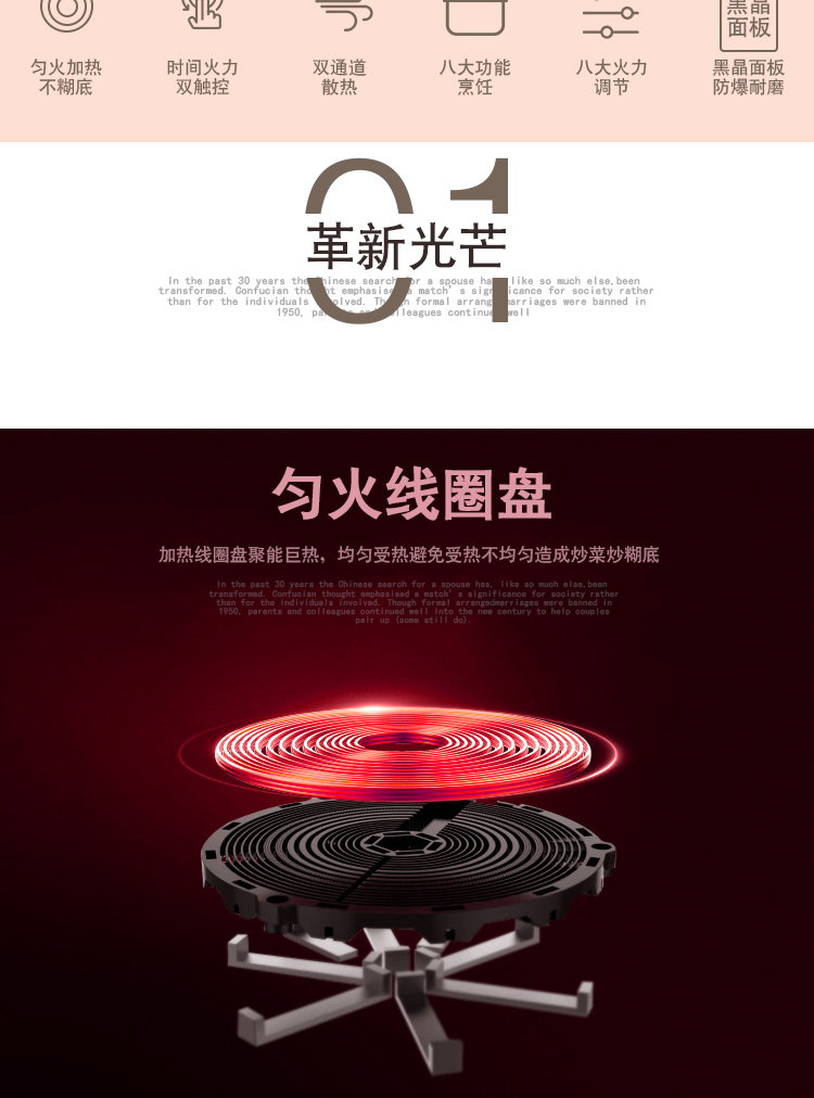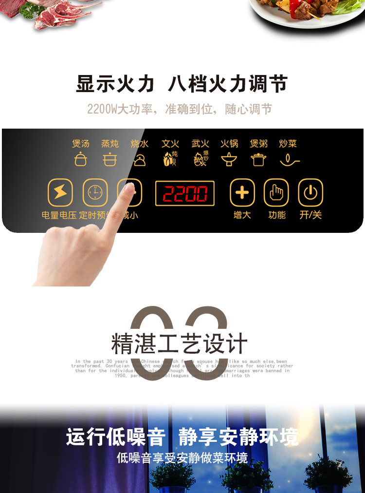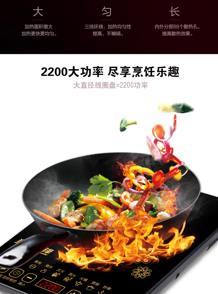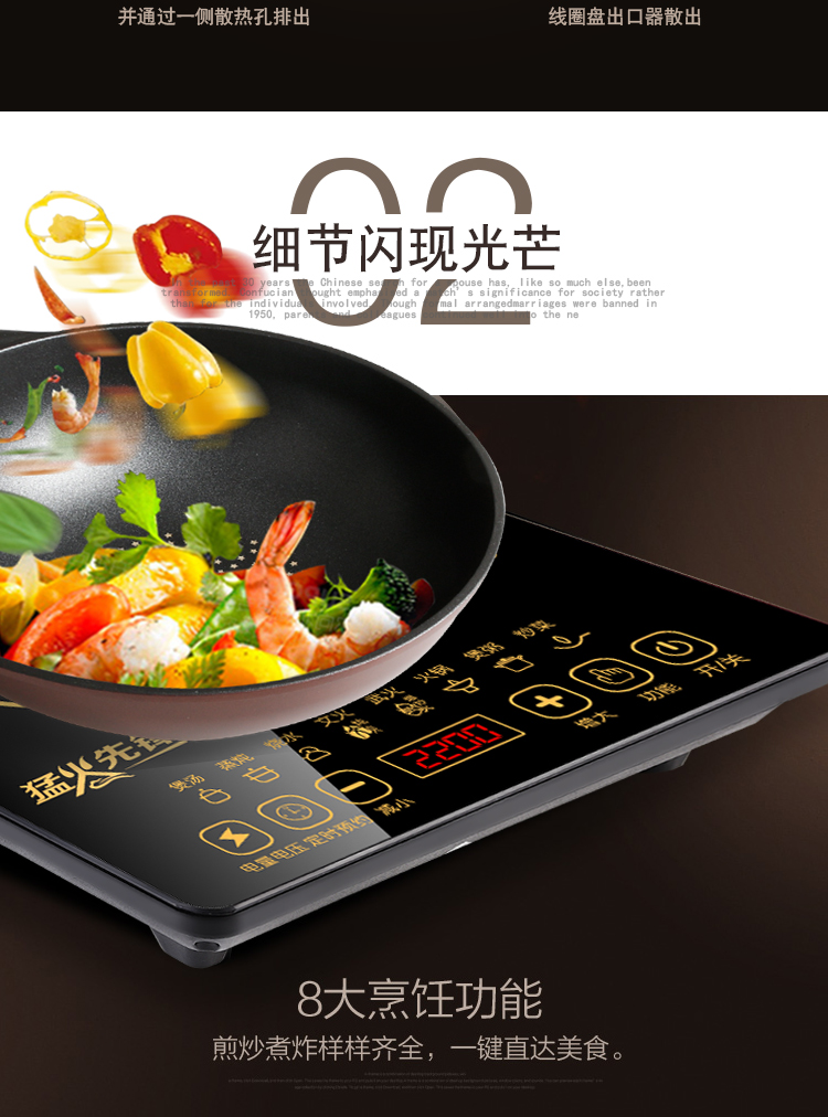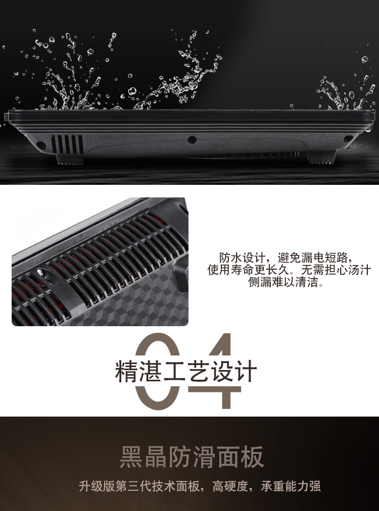 高颜值电池炉,均匀爆炒大火力,8大美食功能,高效黑晶面板,多项防水技术,半球触摸防水,开启美食盛宴