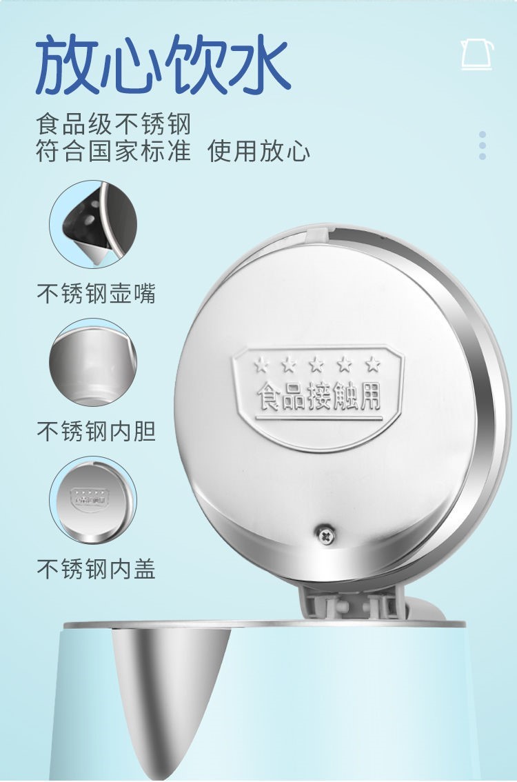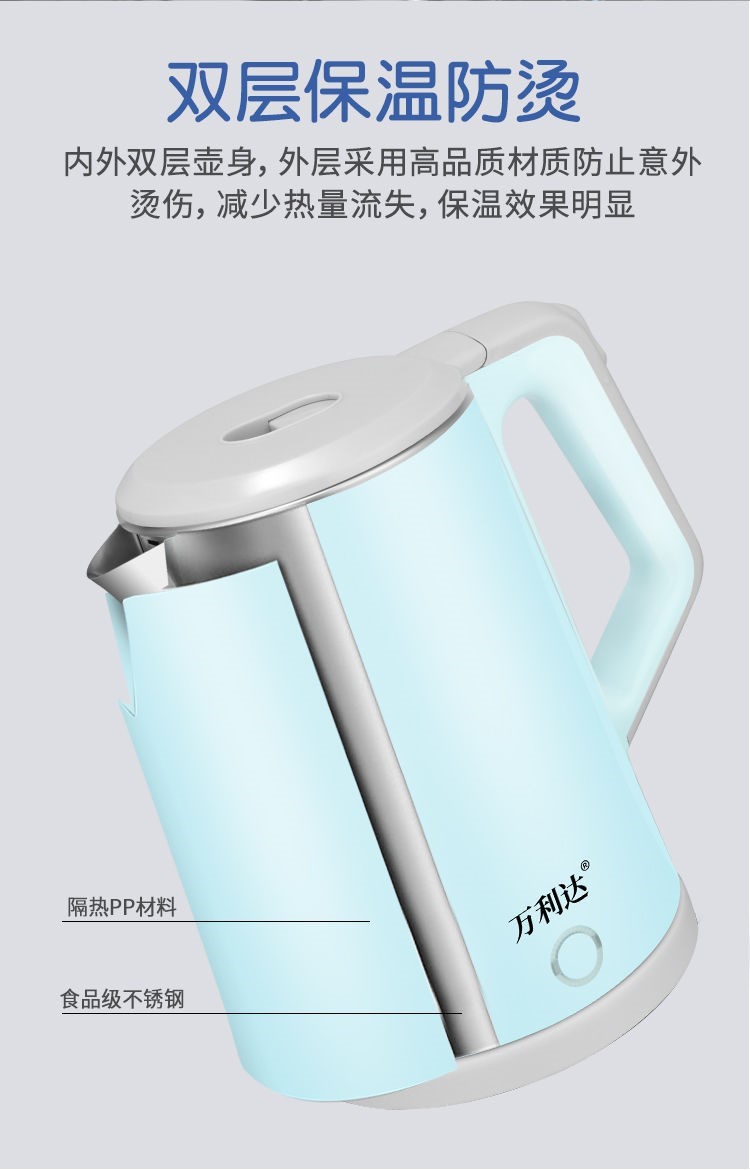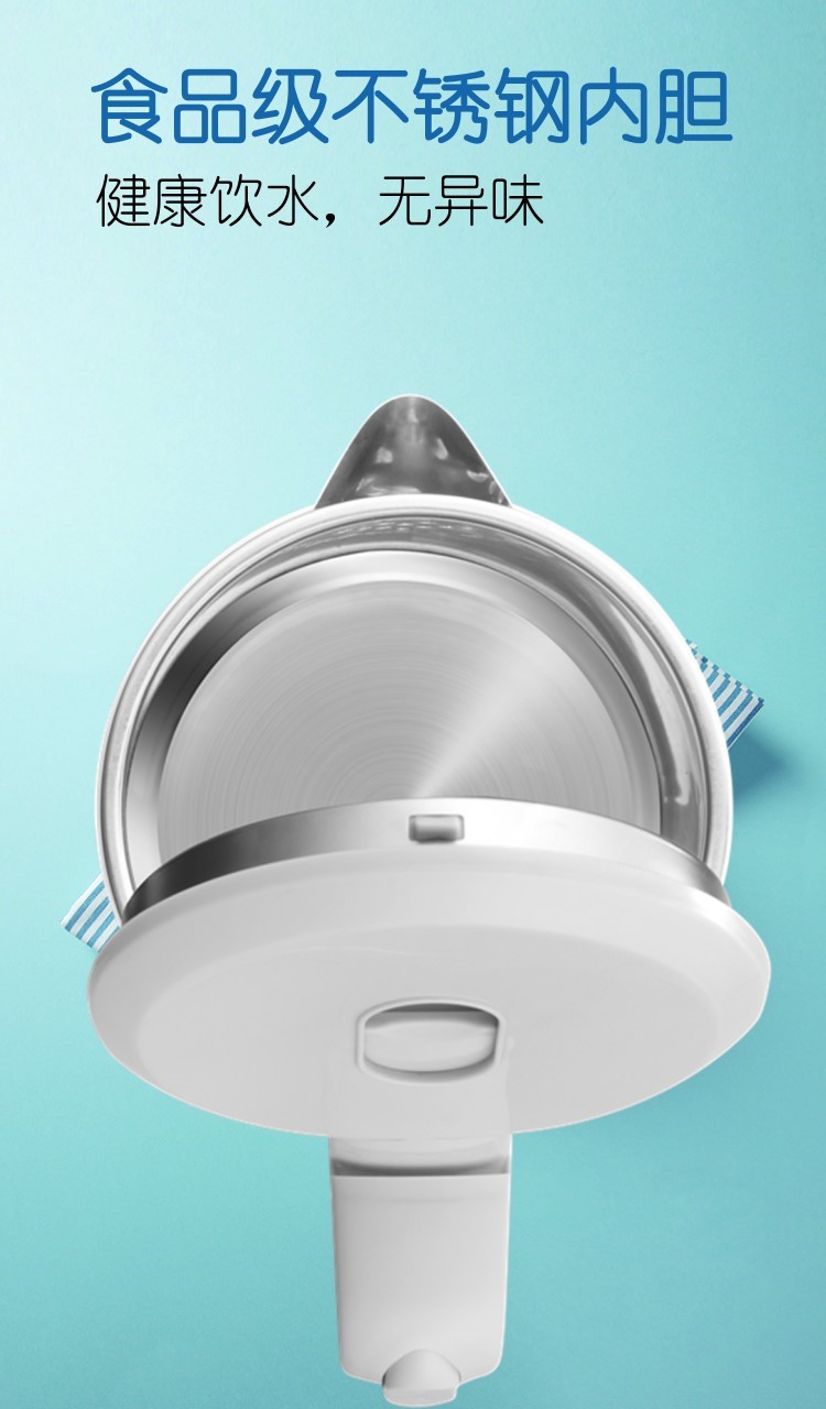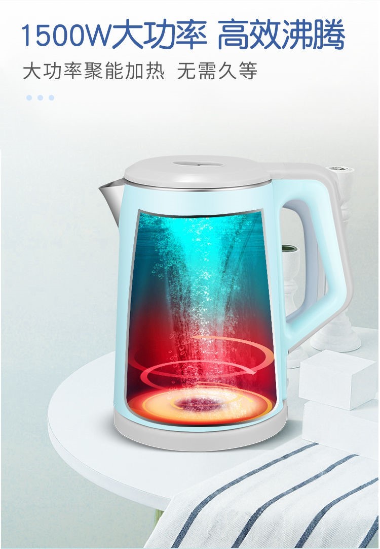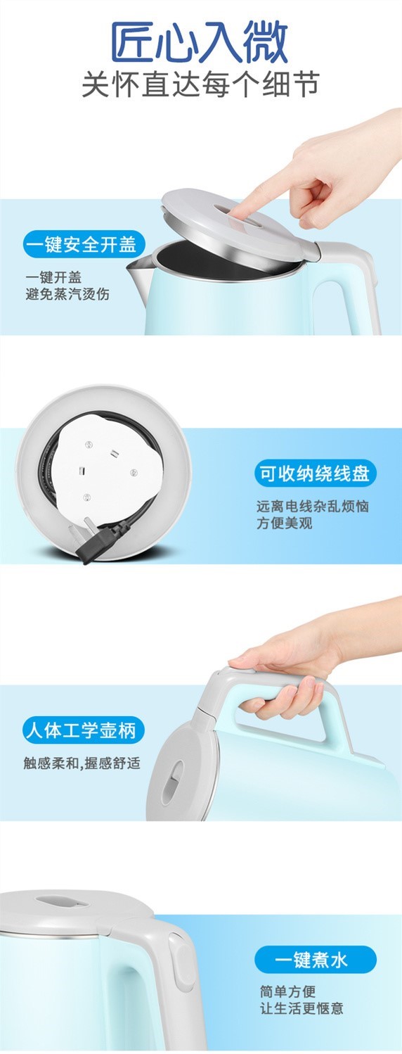 精巧机型,简约时尚,双层防烫电水壶,无缝内胆,易清洗,大功率聚能一体式发热,快速沸腾,呵护健康,安心饮水,安全耐用拒绝半生水!