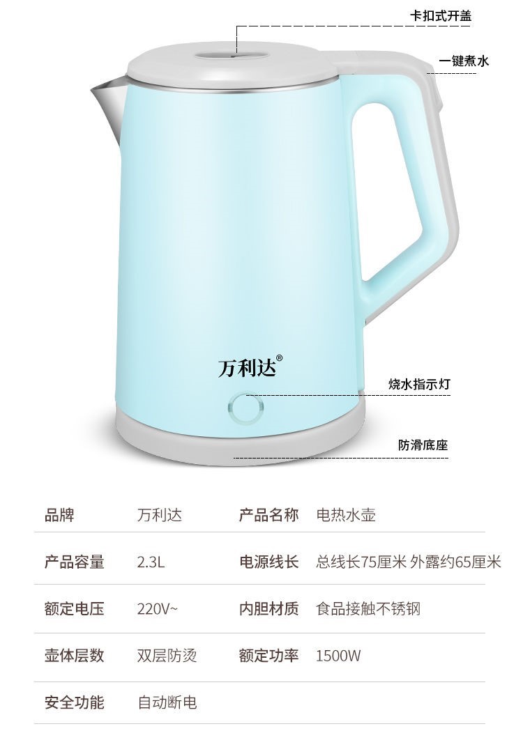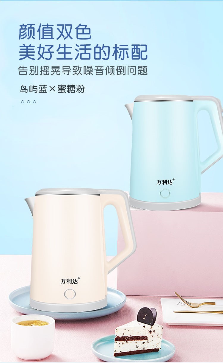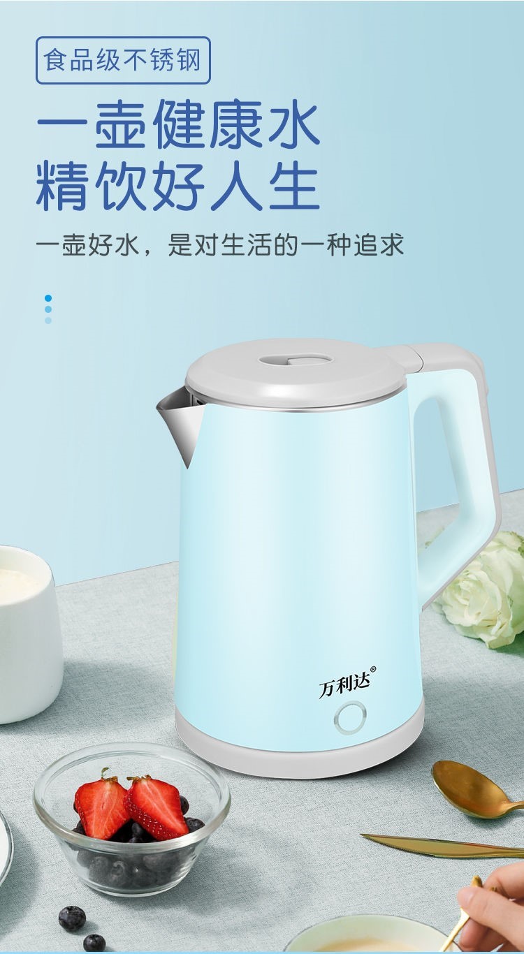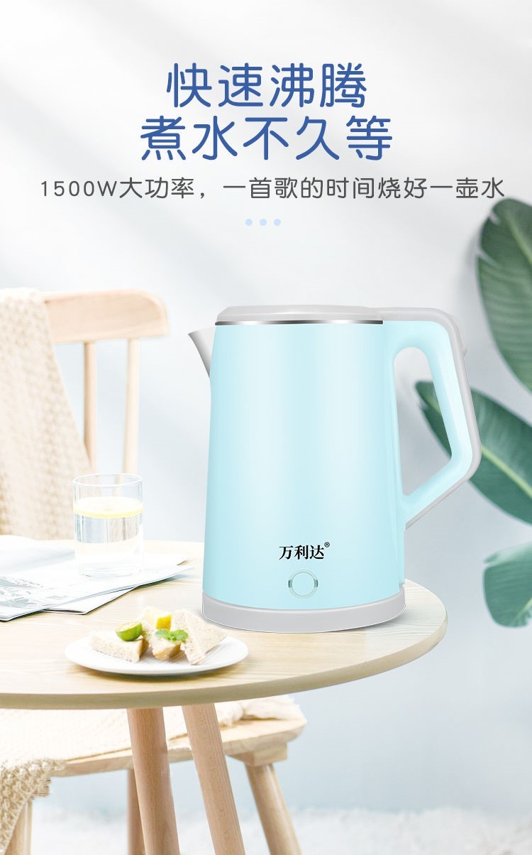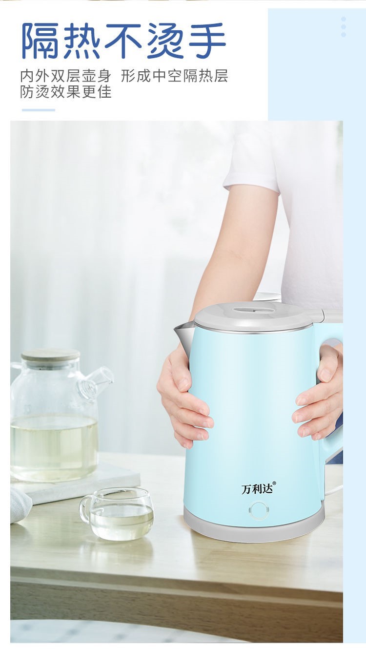 精巧机型,简约时尚,双层防烫电水壶,无缝内胆,易清洗,大功率聚能一体式发热,快速沸腾,呵护健康,安心饮水,安全耐用拒绝半生水!
