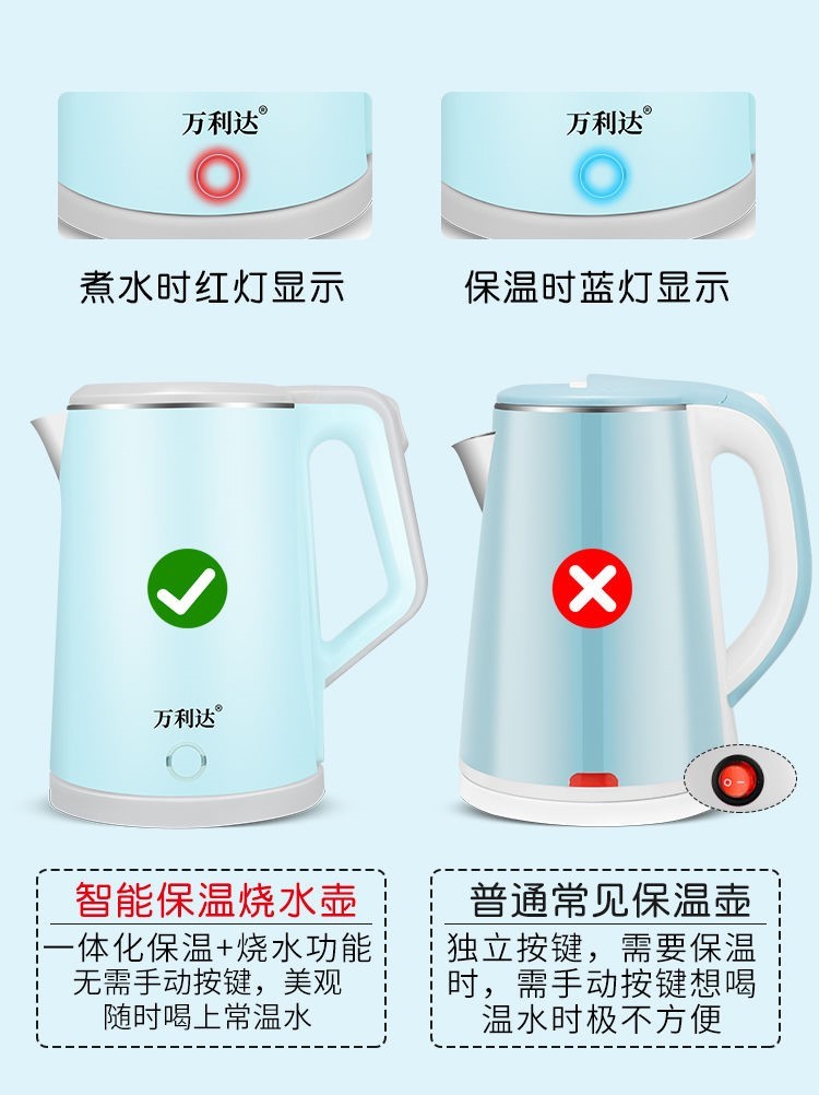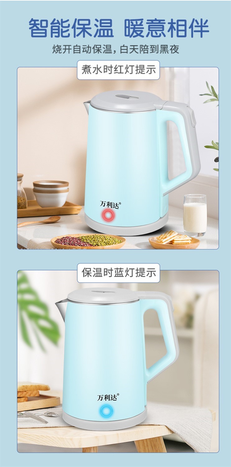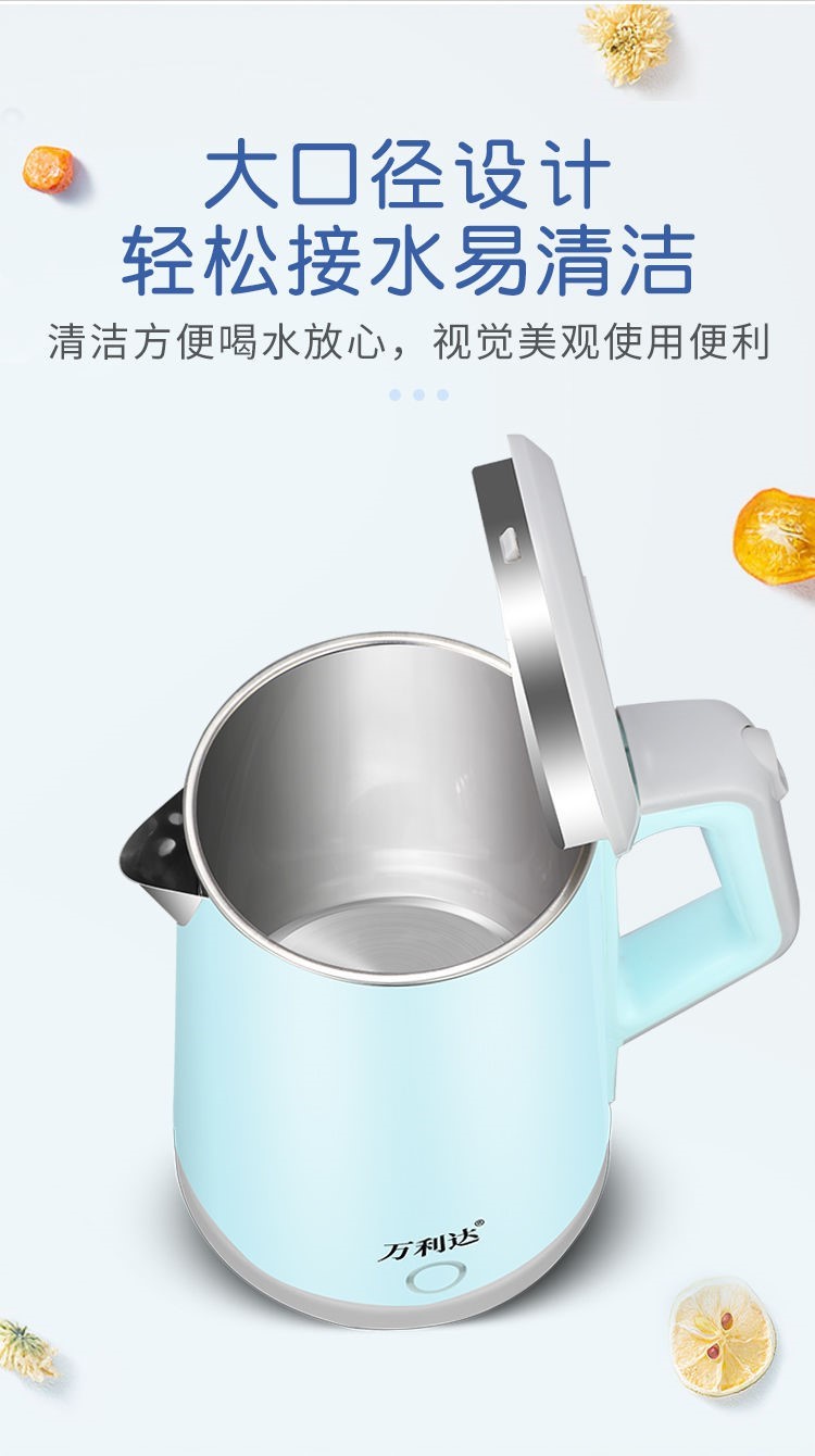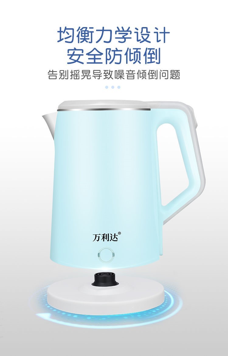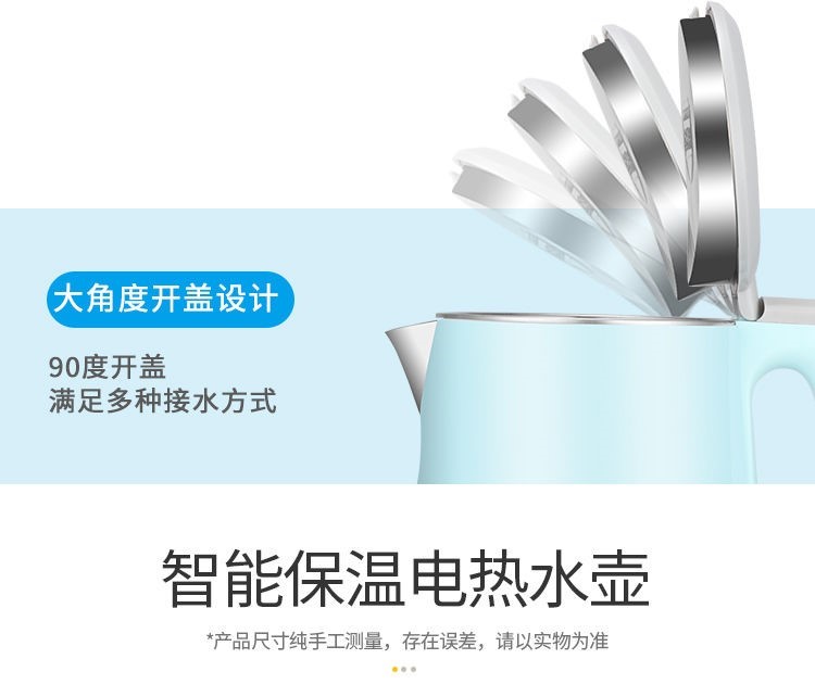 精巧机型,简约时尚,双层防烫电水壶,无缝内胆,易清洗,大功率聚能一体式发热,快速沸腾,呵护健康,安心饮水,安全耐用拒绝半生水!