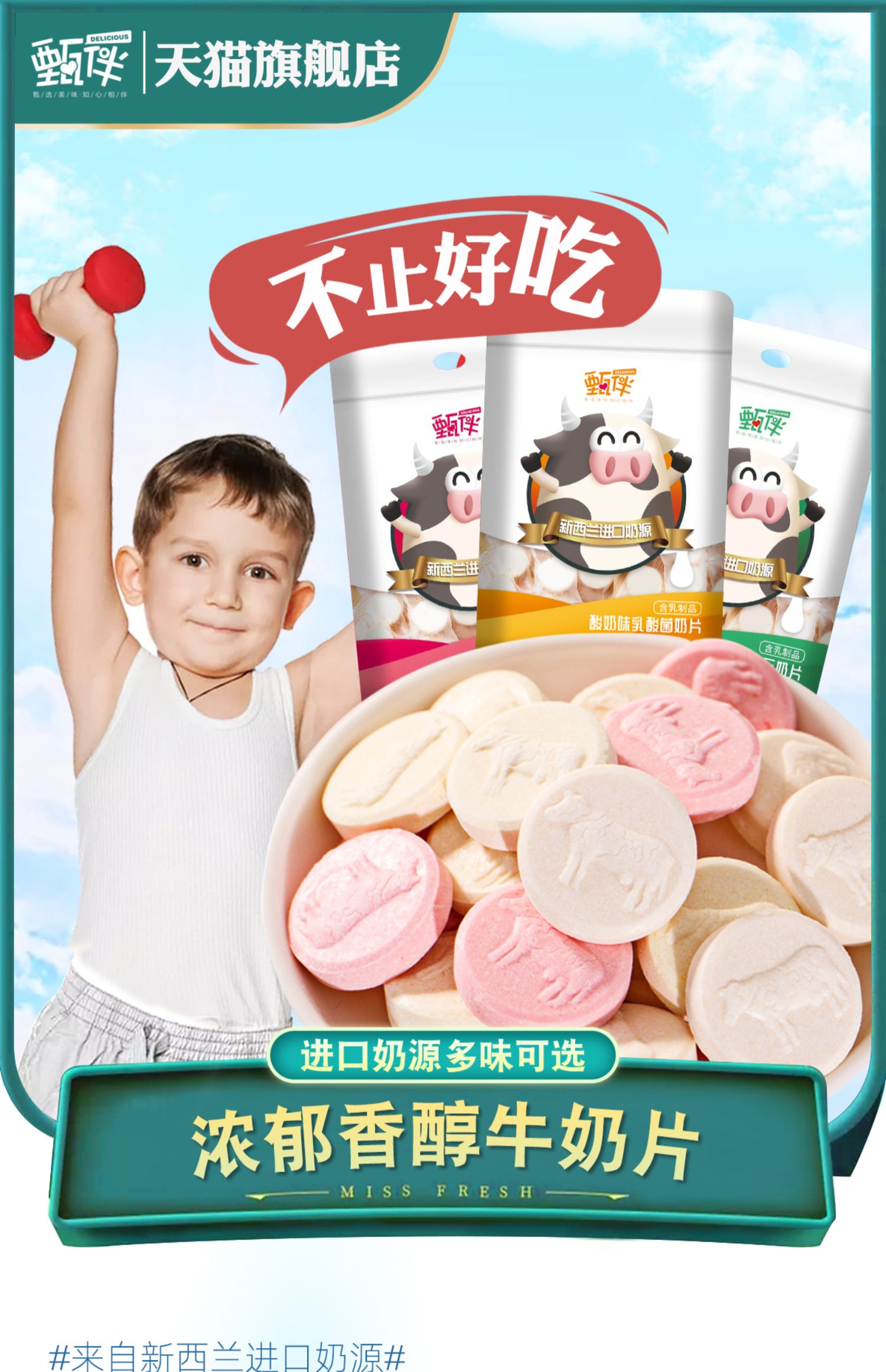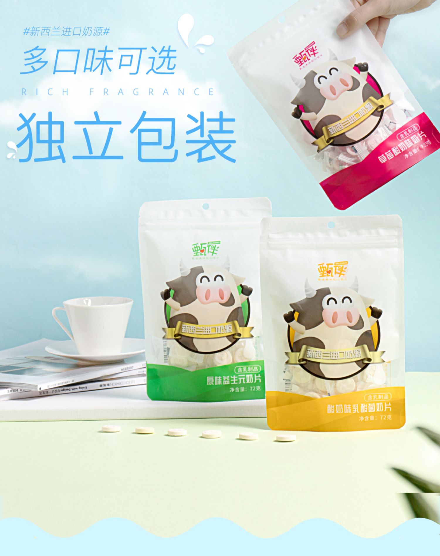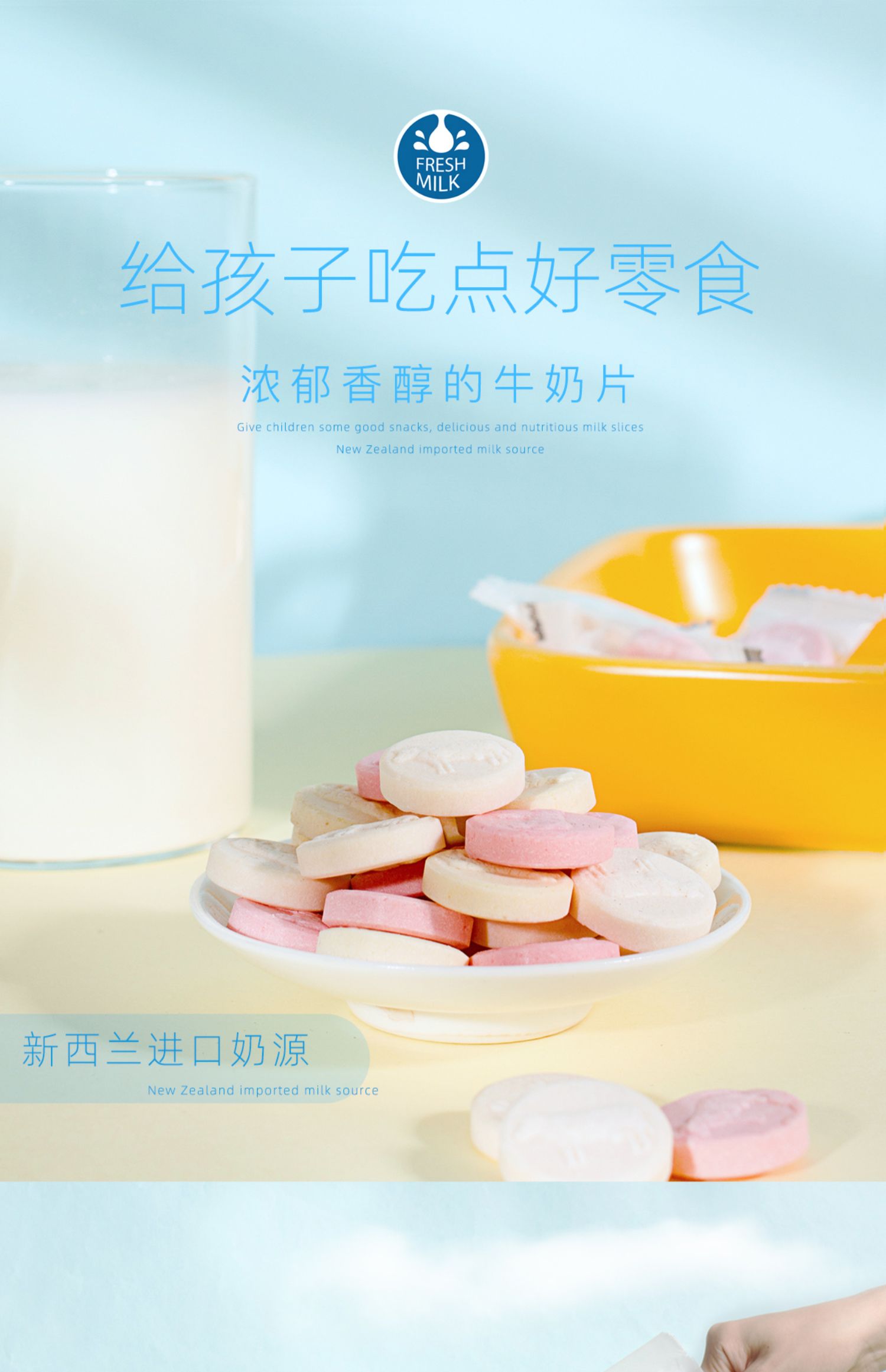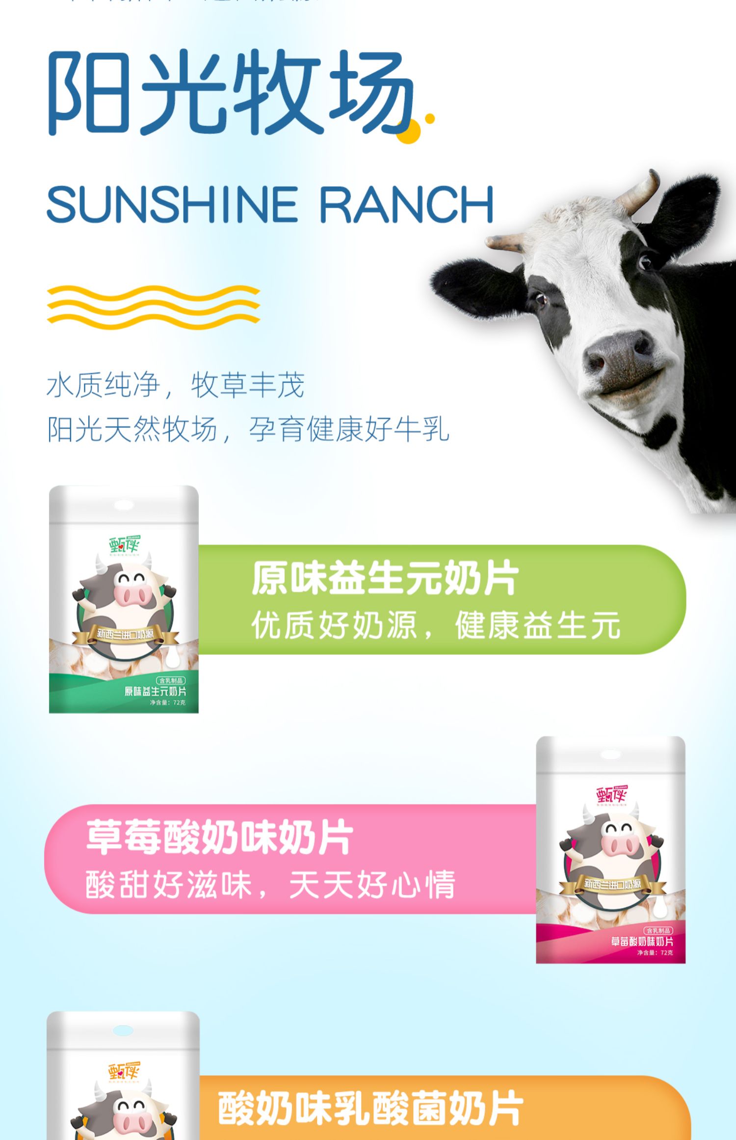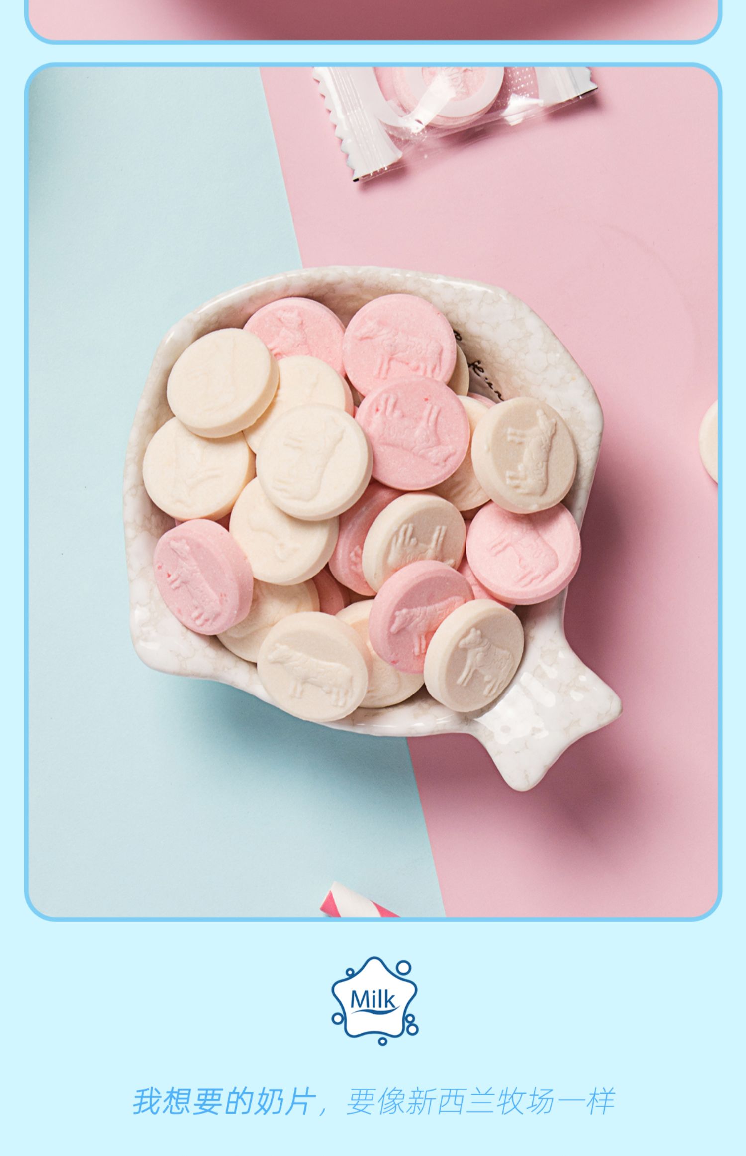 浓郁香醇牛奶片!阳光天然牧场,孕育健康好牛乳,优质好奶源,健康益生元,天天好心情。我想要的奶片,要像新西兰牧场一样,一口爱上这个滋味!【七天无理由退换】