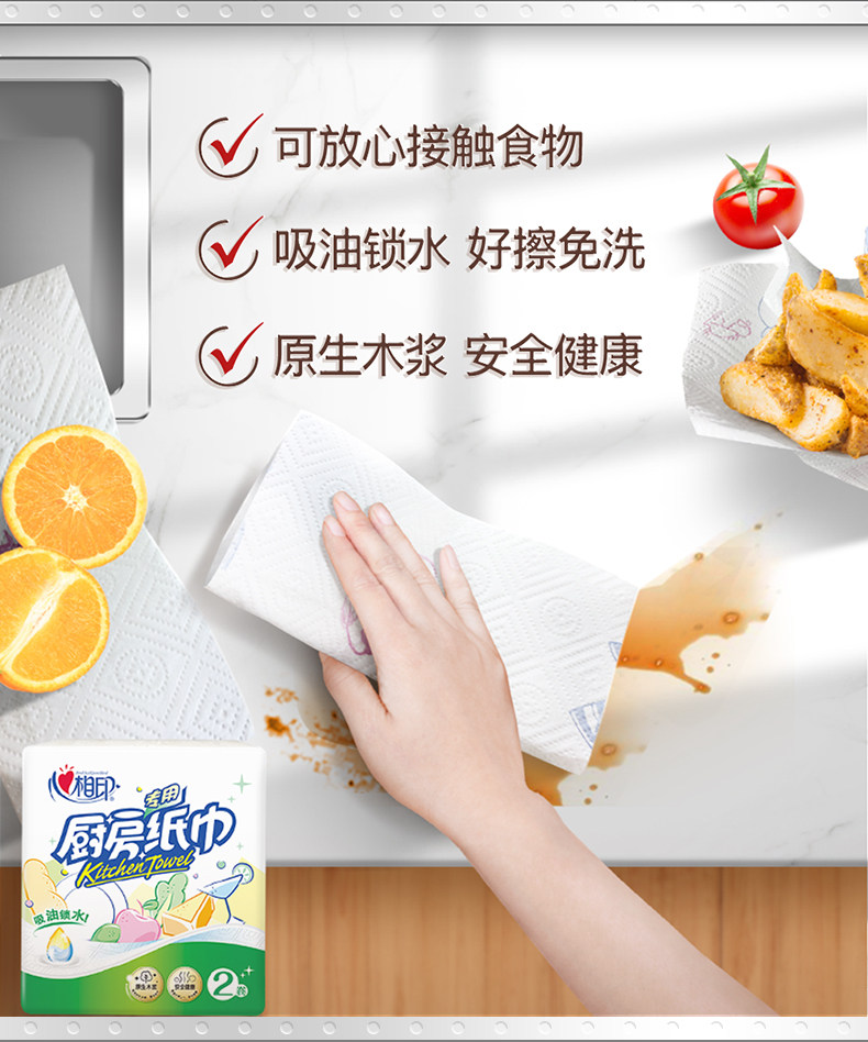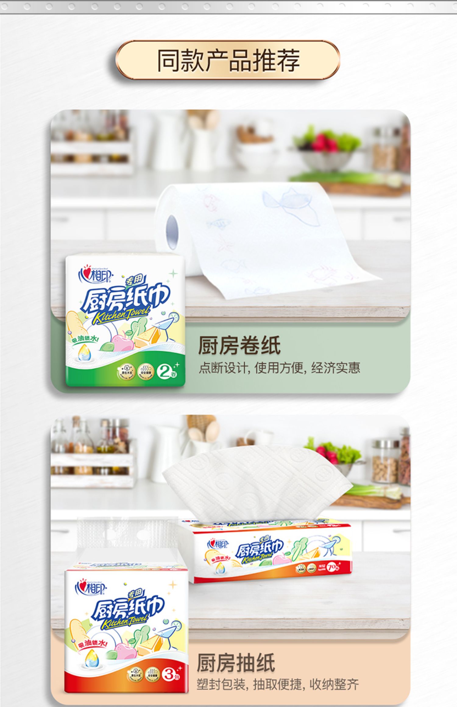 心相印厨房抽纸,吸油锁水抽纸,85抽每包组合装共9包,吸油吸水好擦免洗,3D立体导流,吸力如同大海绵,秒速吸收,湿用不易破,干用不粘屑,黄金配比高密度,一纸两用,清洁不耗时。