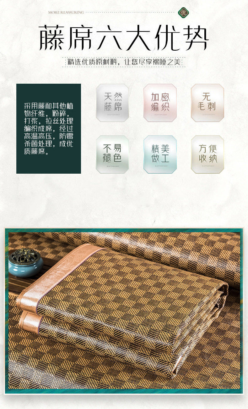 藤席凉席三件套,高品质,做工非常好,没瑕疵,无毛刺,透气性好,躺上冰而不凉,可折叠!很光滑,夏天备着,睡眠都变好了~【七天无理由退换】