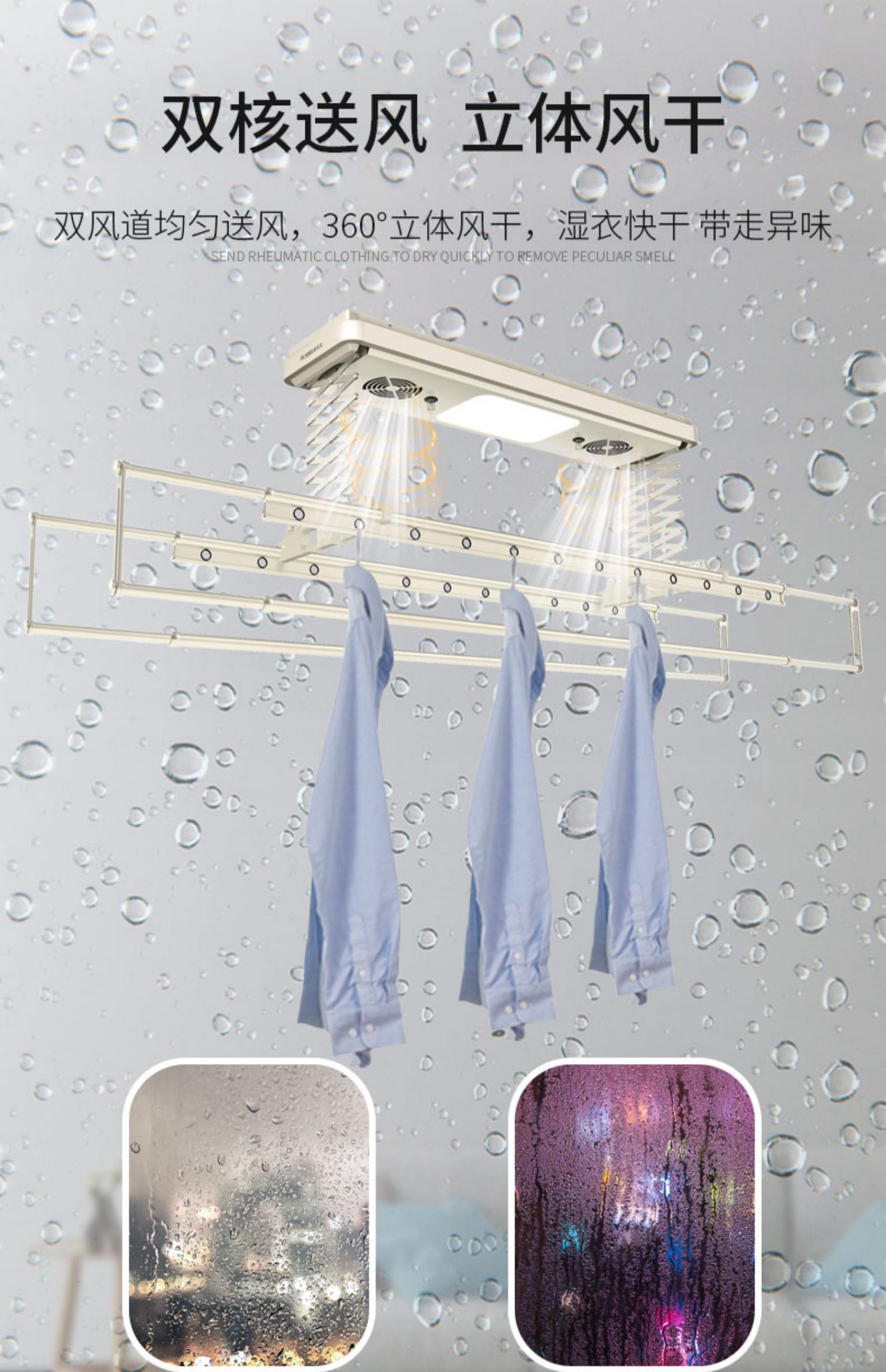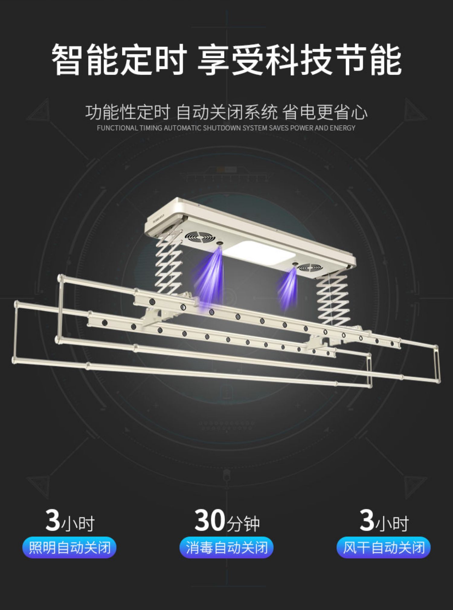 好太太智能晾衣机,净紫外线双灯消毒深层杀菌保卫家人健康,双风道均匀送风,360°立体风干,湿衣快干带走异味平板LED大屏均匀光色,节能自然防炫光智能功能性定时,自动关闭系统,省电更省心简。