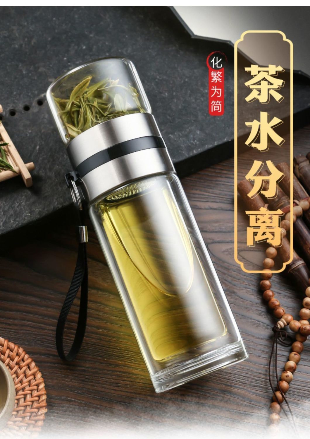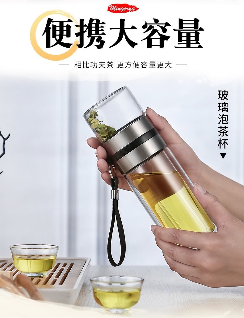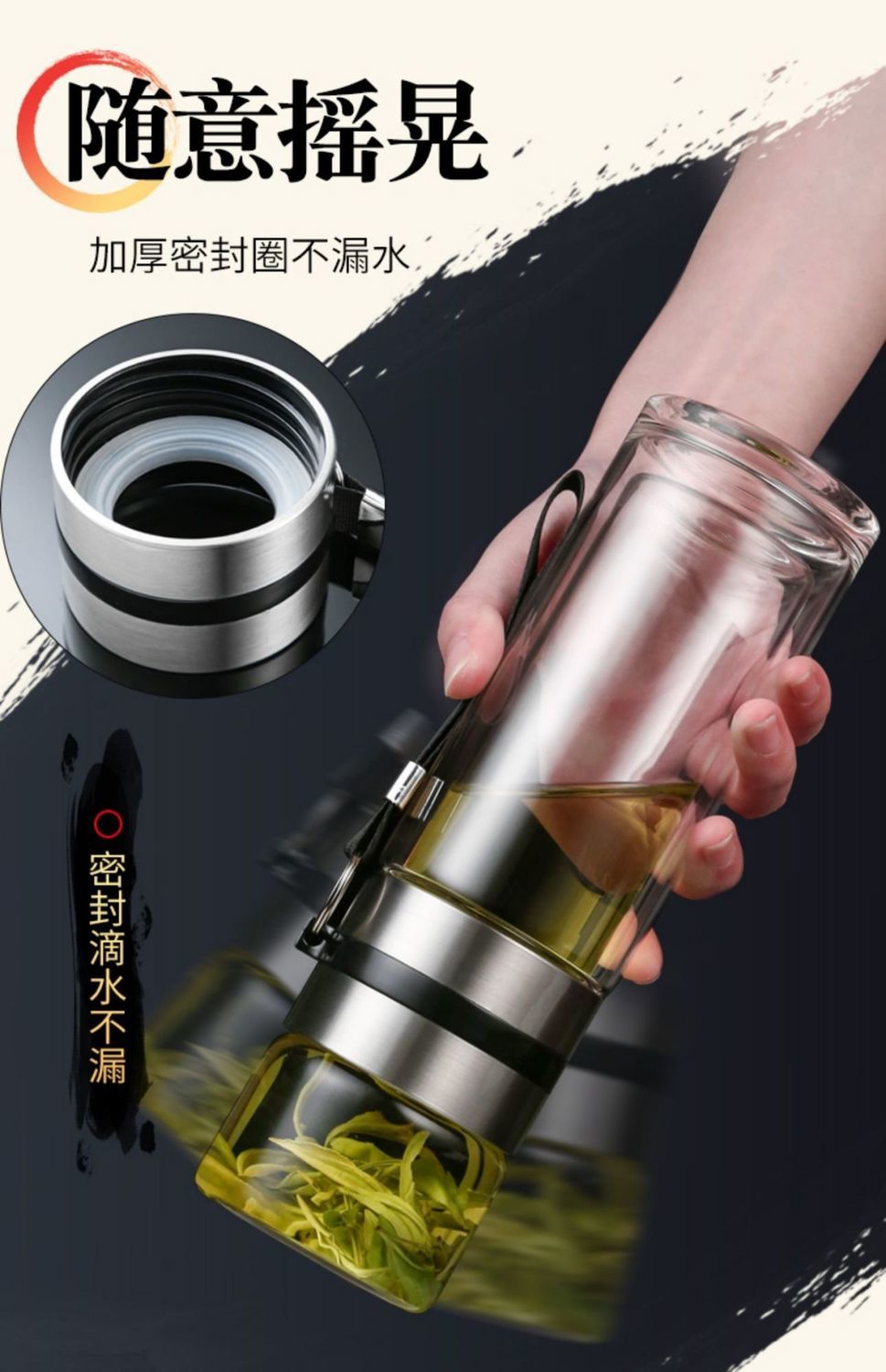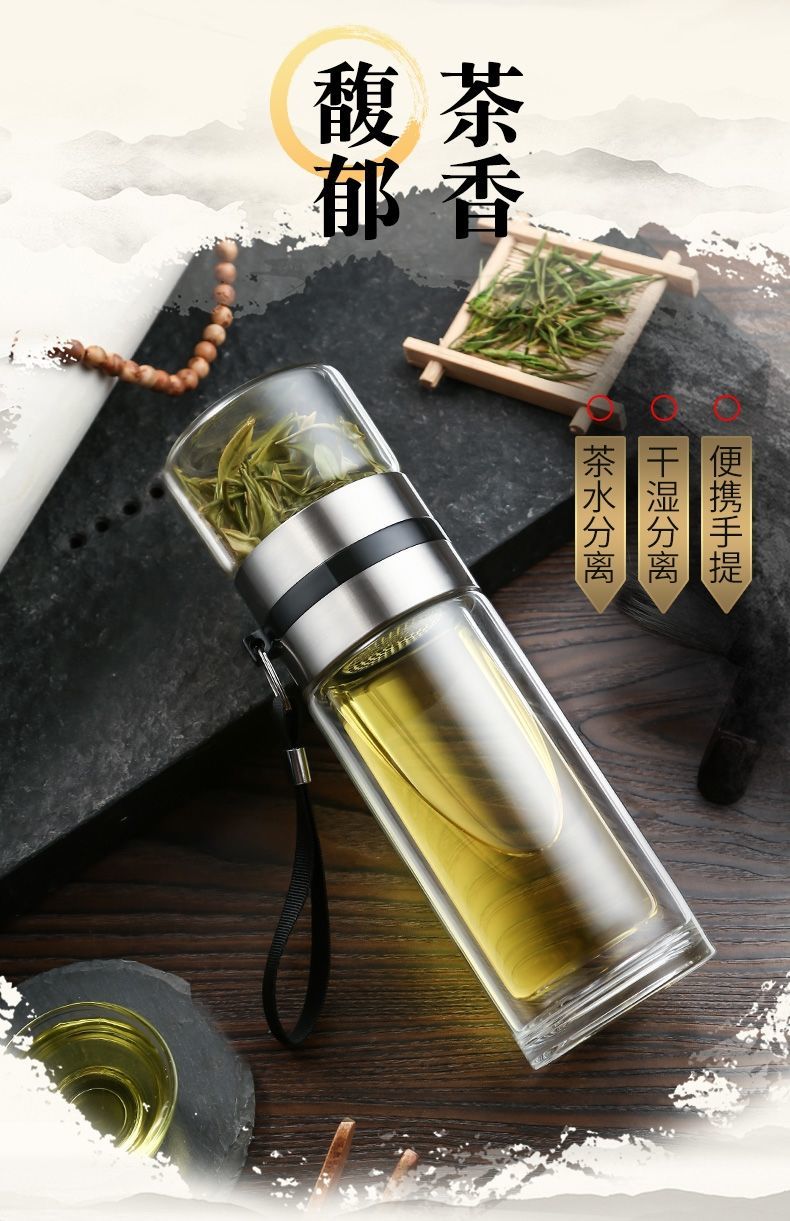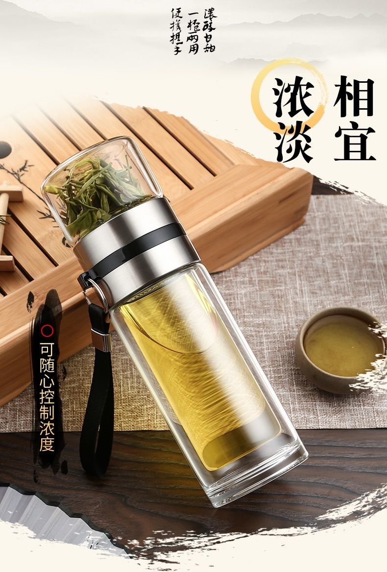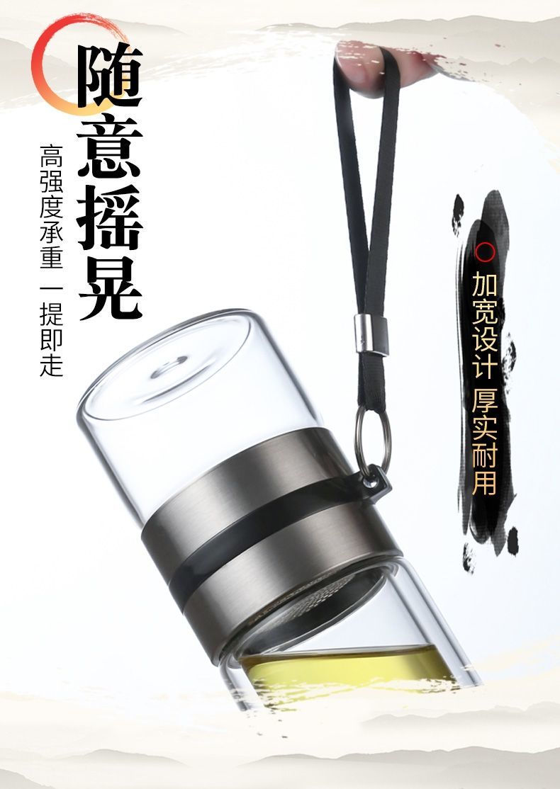 双层加厚防烫玻璃杯,茶水分离泡茶杯,浓淡自控,一杯两用,360°密封防漏,人性化提绳,承重力强,不断裂,行走的功夫茶具,一杯好茶暖心相伴!