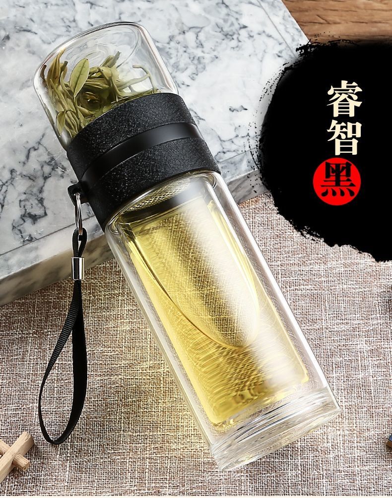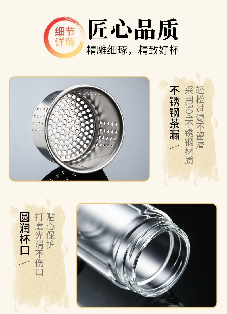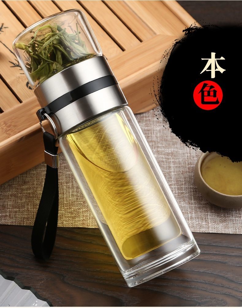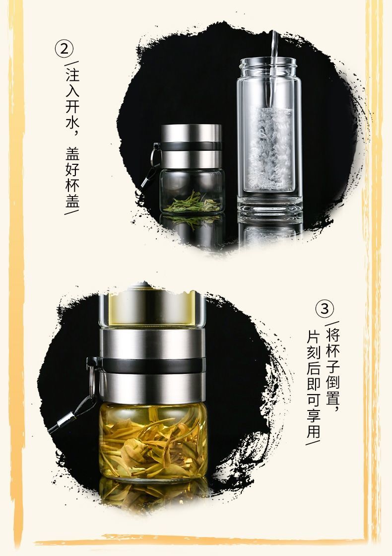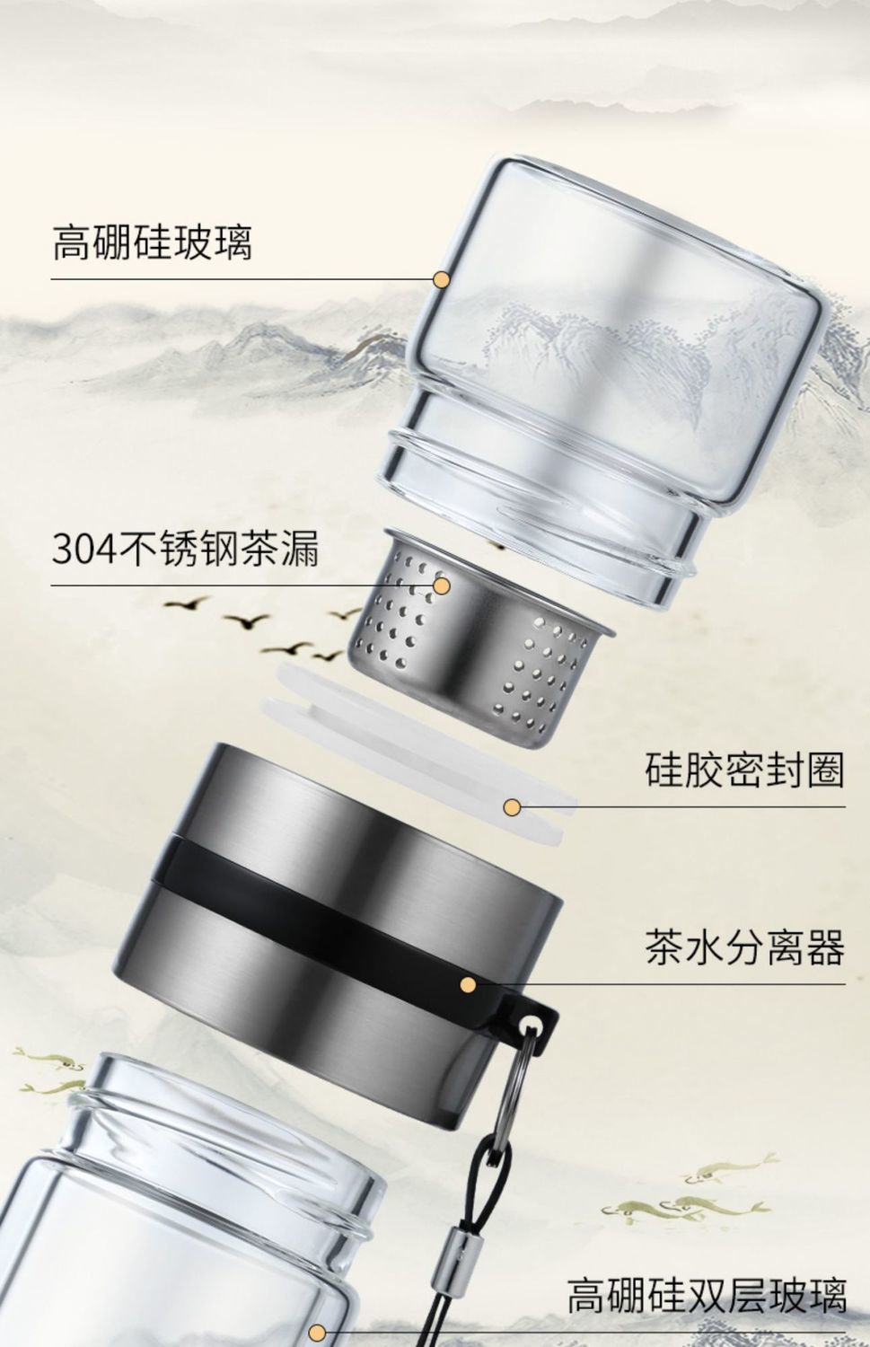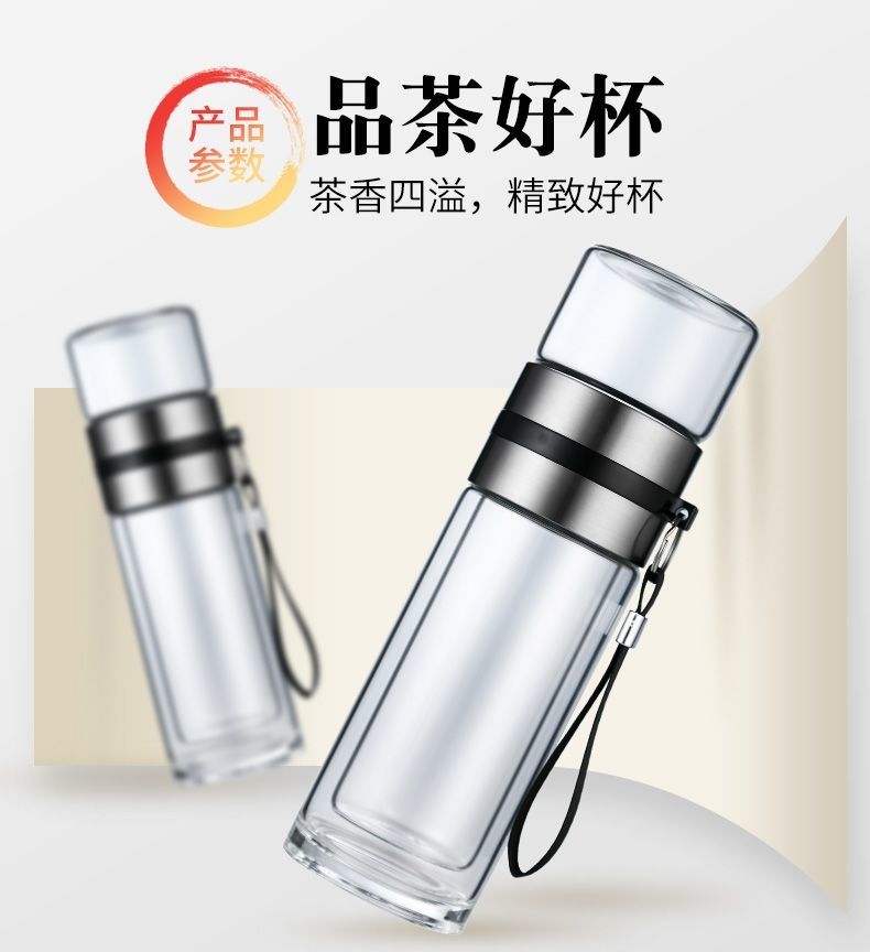 双层加厚防烫玻璃杯,茶水分离泡茶杯,浓淡自控,一杯两用,360°密封防漏,人性化提绳,承重力强,不断裂,行走的功夫茶具,一杯好茶暖心相伴!
