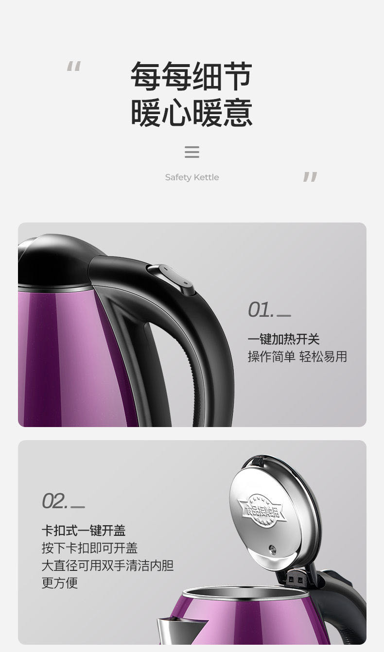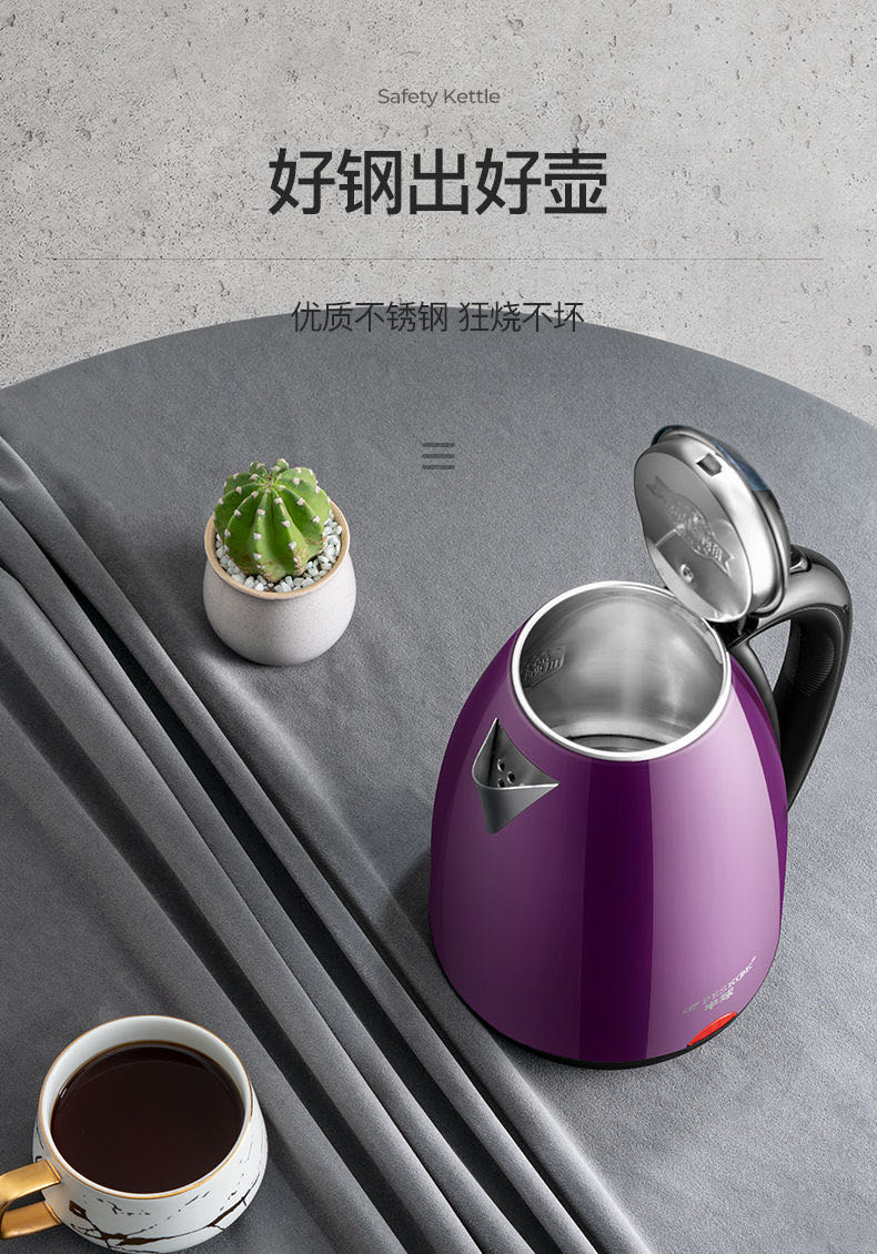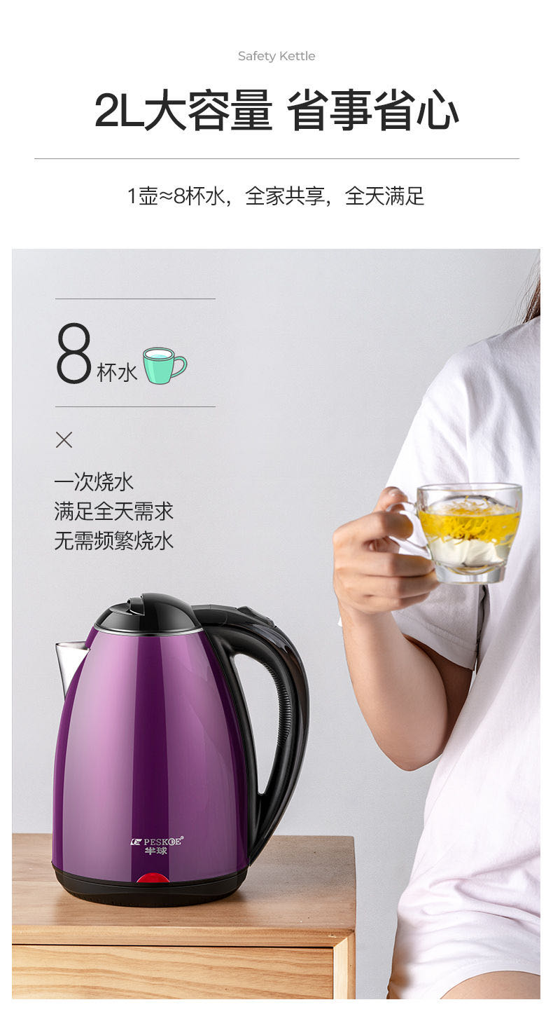 食品级不锈钢,安全双层防烫壶身,2.0L黄金容量,快速烧水,隔热防烫,三重断电保护防干烧,八大贴心功能,让你爱上喝水!【赠运费险】
