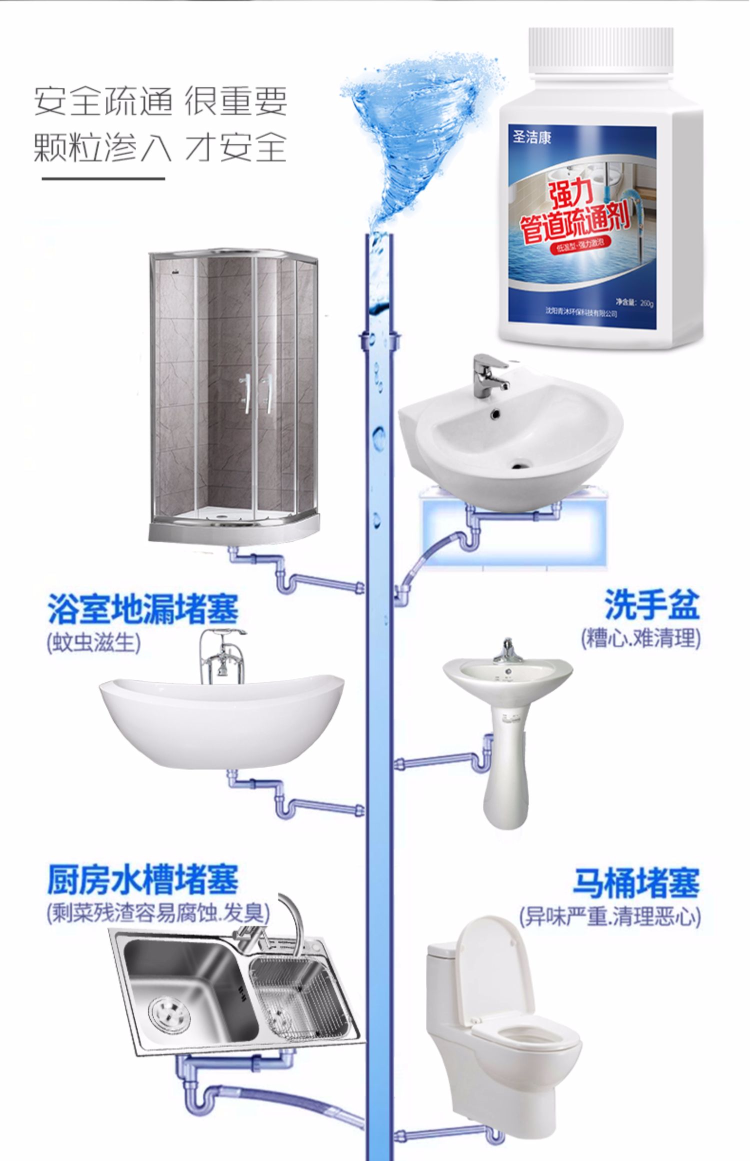 圣洁康马桶管道疏通剂,低温安全,有效疏通堵塞物,适用于菜池、煤气灶、马桶。颗粒渗入安全,看得见的效果!家家必备,买它!