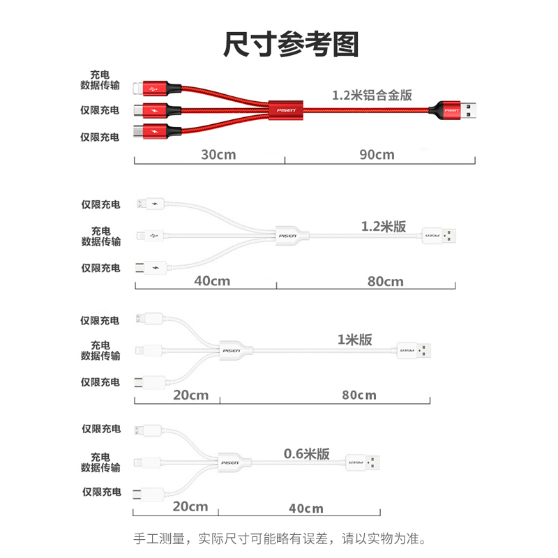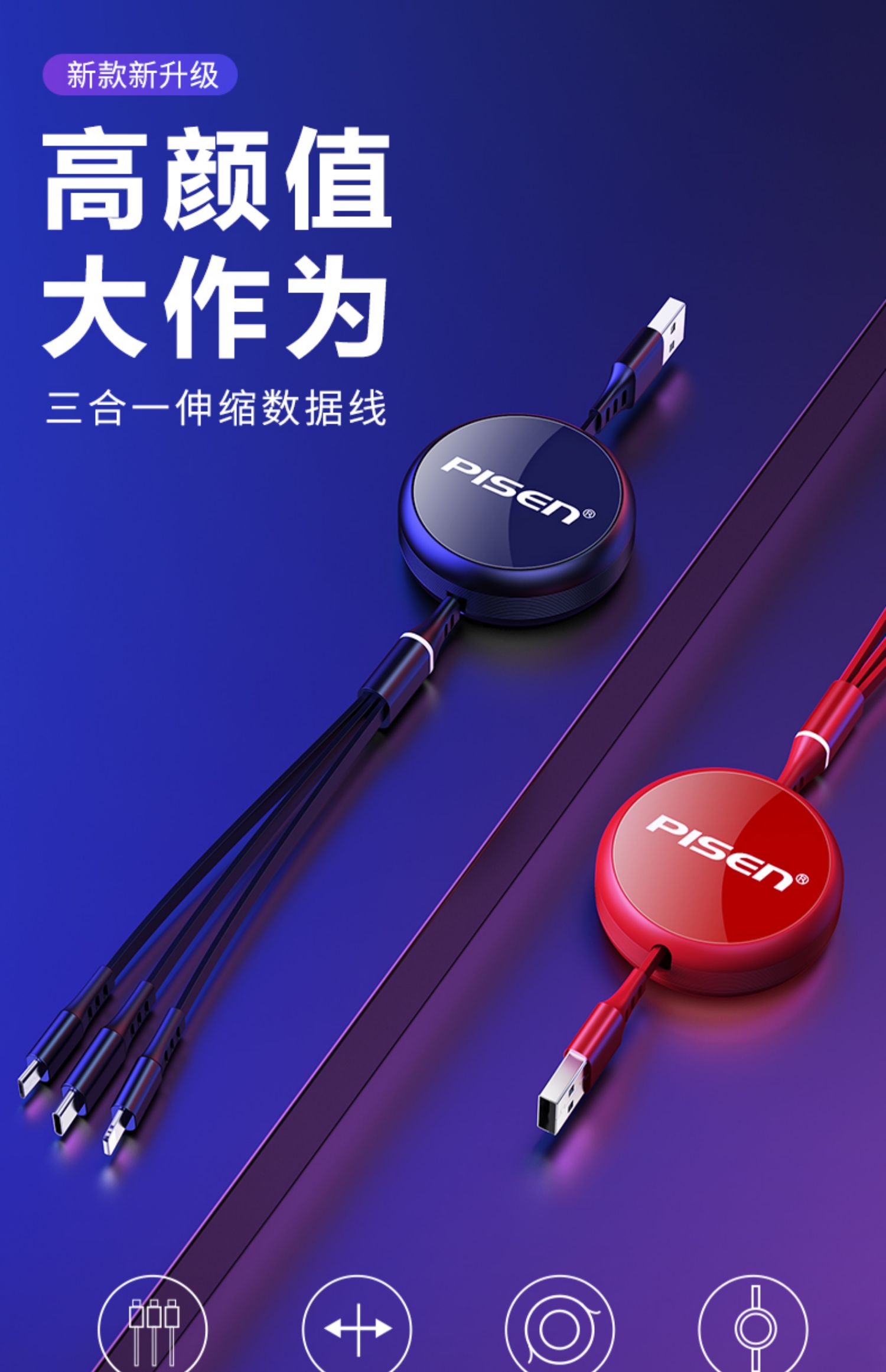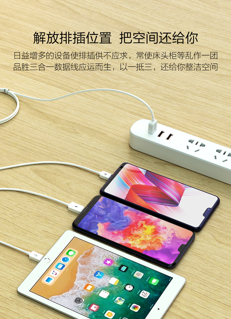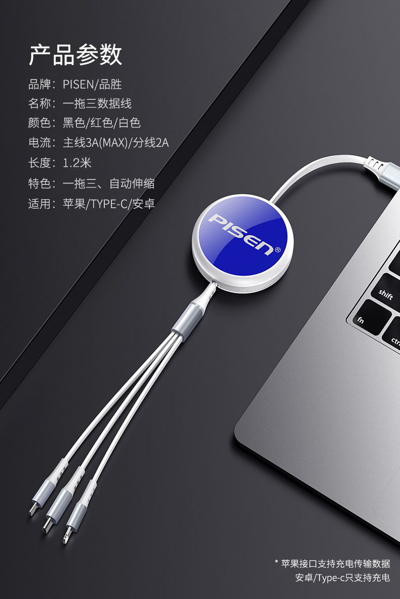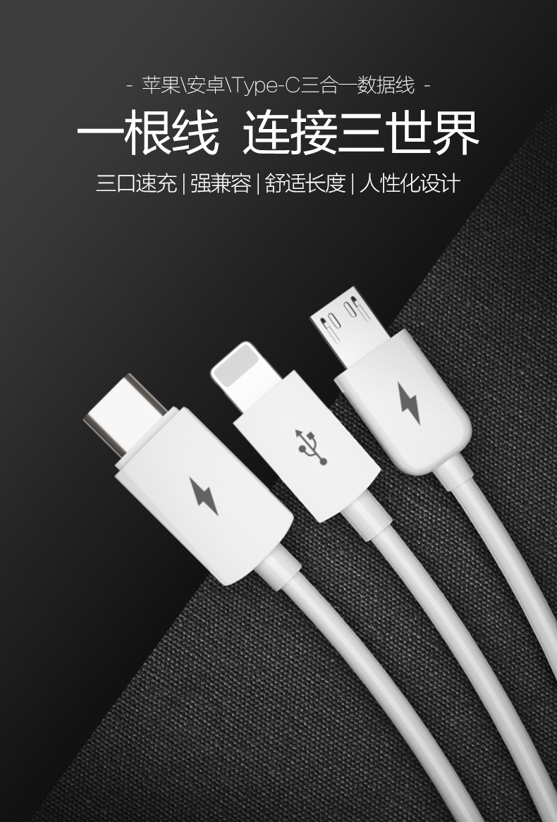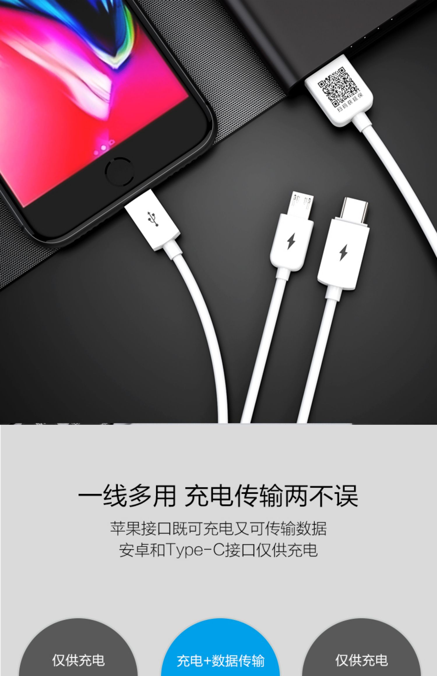 大牌品胜,三种接口,苹果,安卓,type-C通用,一线三用,急速闪充,出门只需带一根线,分线独立享用,稳定快速,编织尼龙防缠绕,柔韧耐用,大牌超低秒杀价!