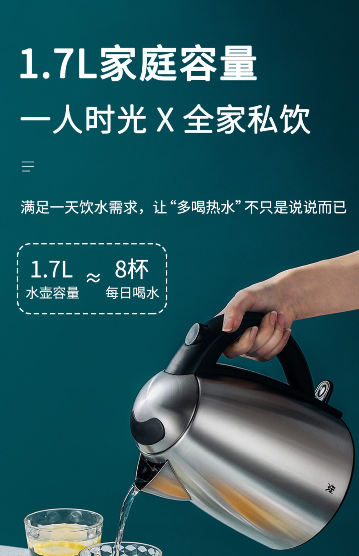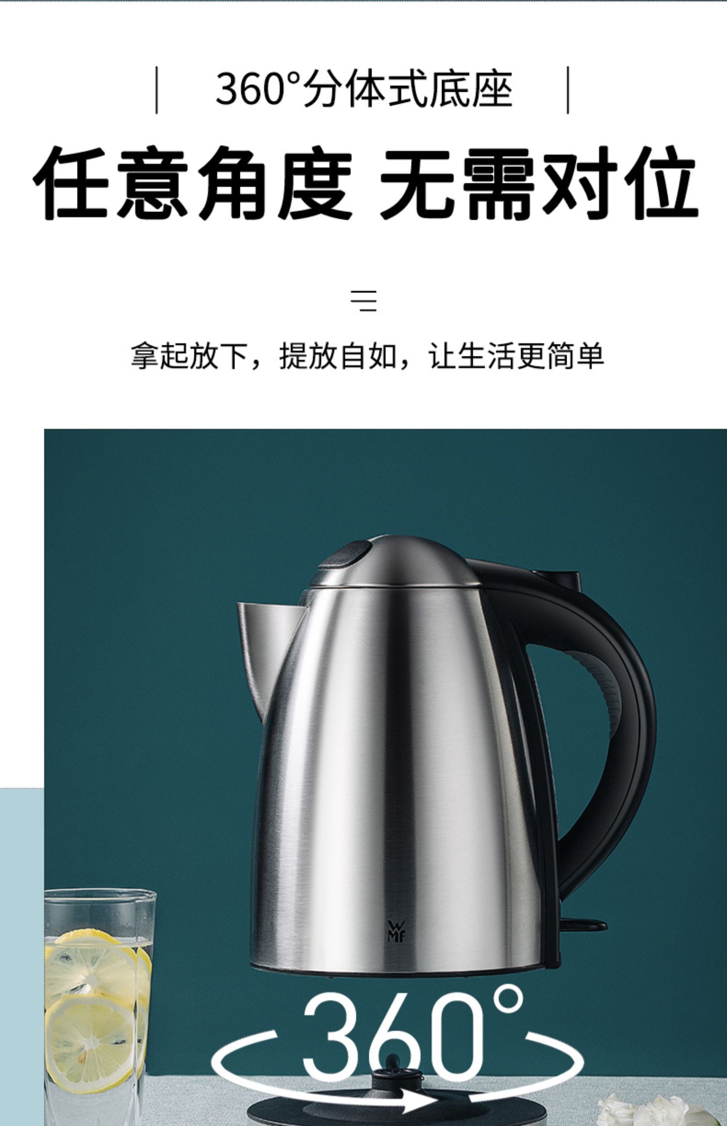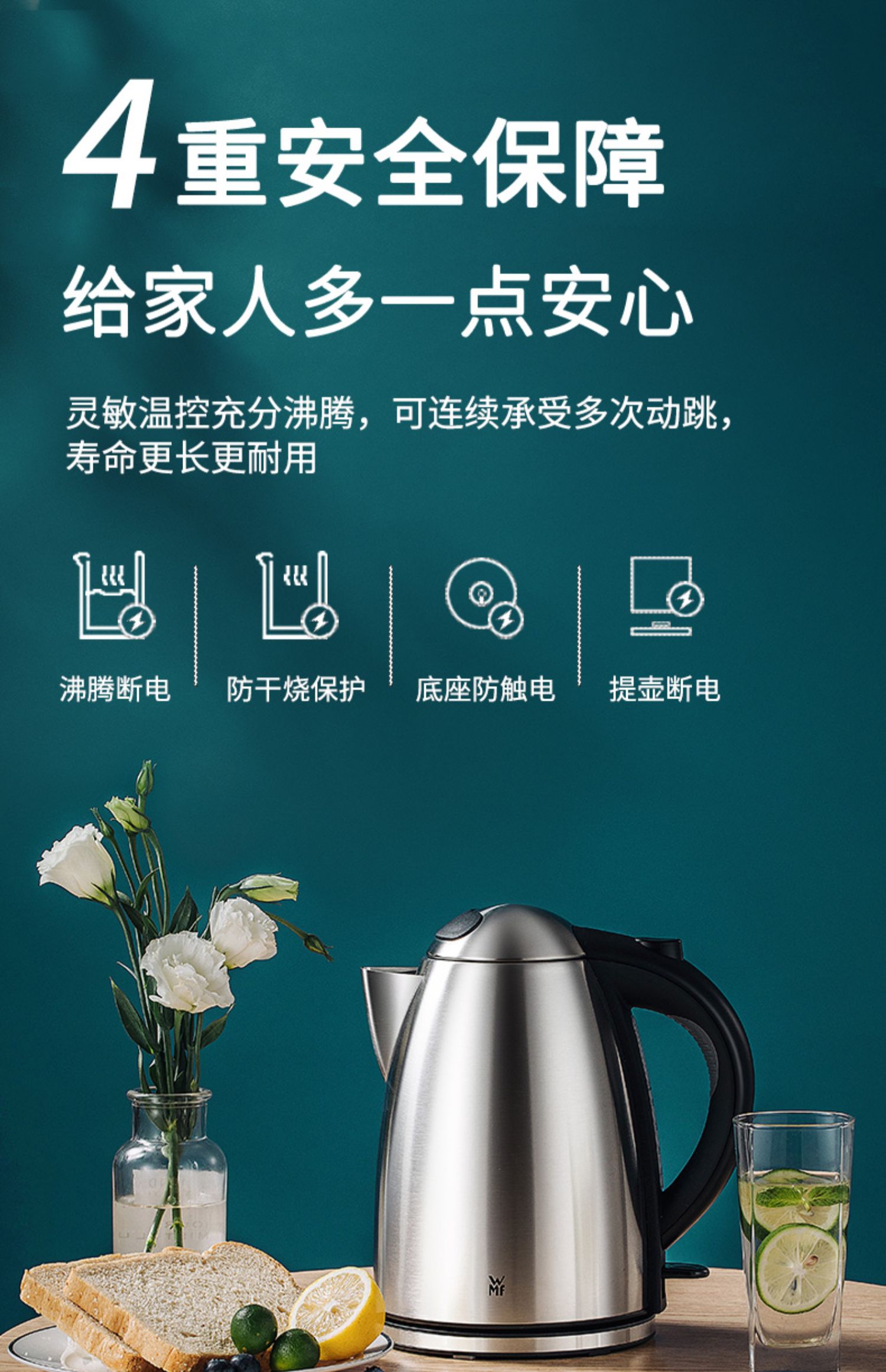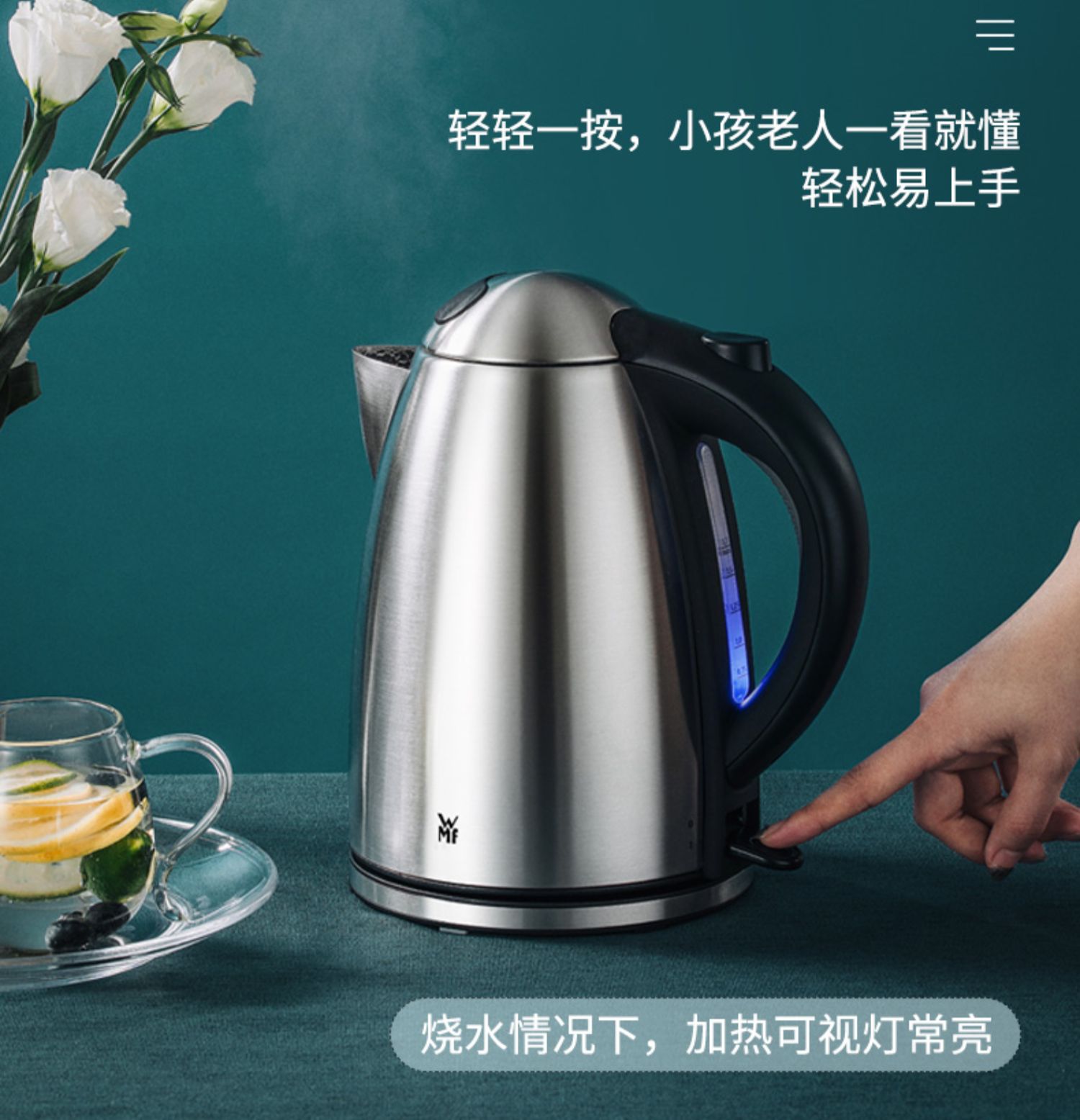 德国WMFStelio1.7L大容量电热水壶,采用304食品级不锈钢材质,4重安全保障,5分钟快速沸腾,德系做工尽显精致优雅,一壶百搭日常,做你的“心水”好物