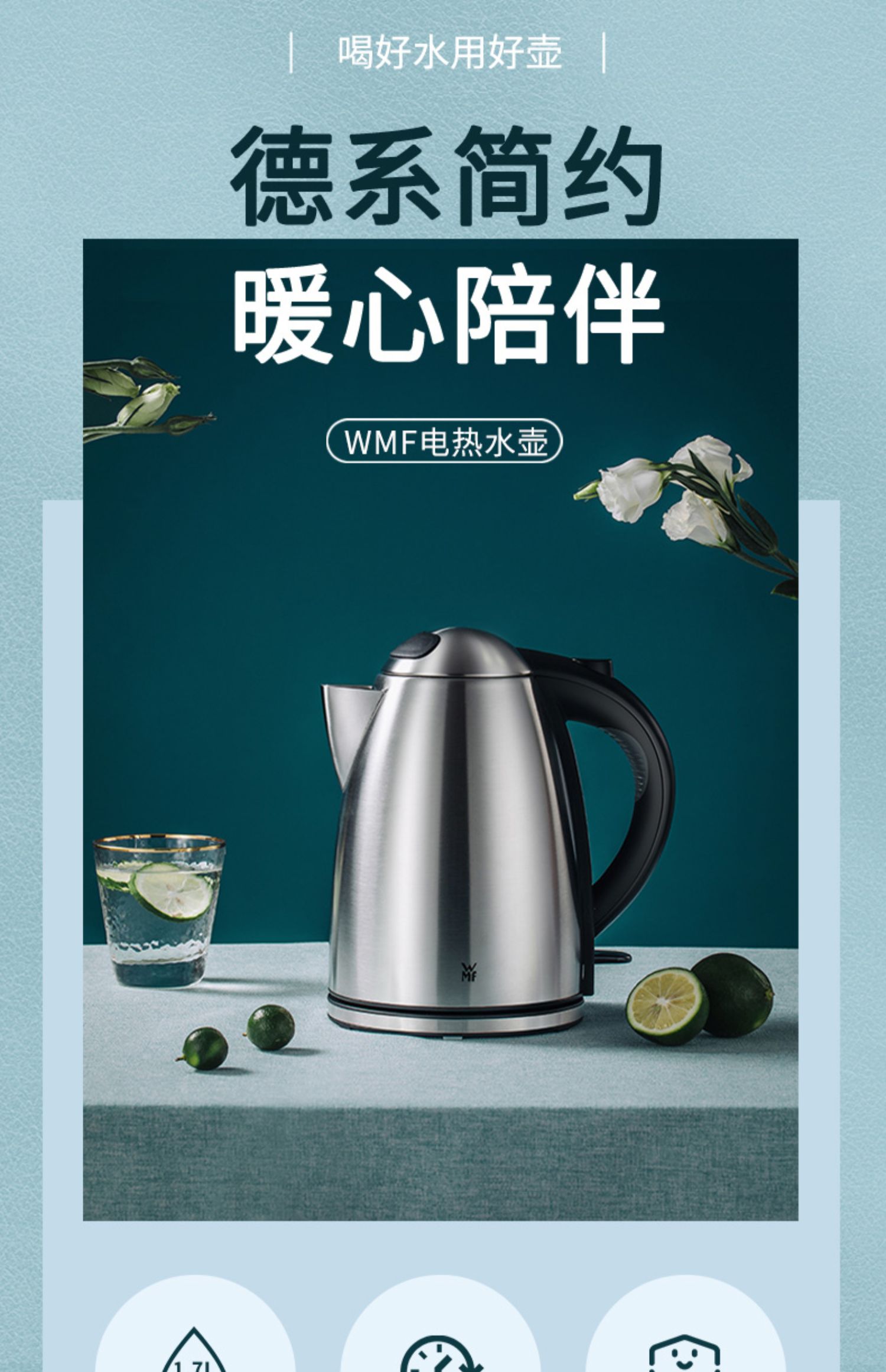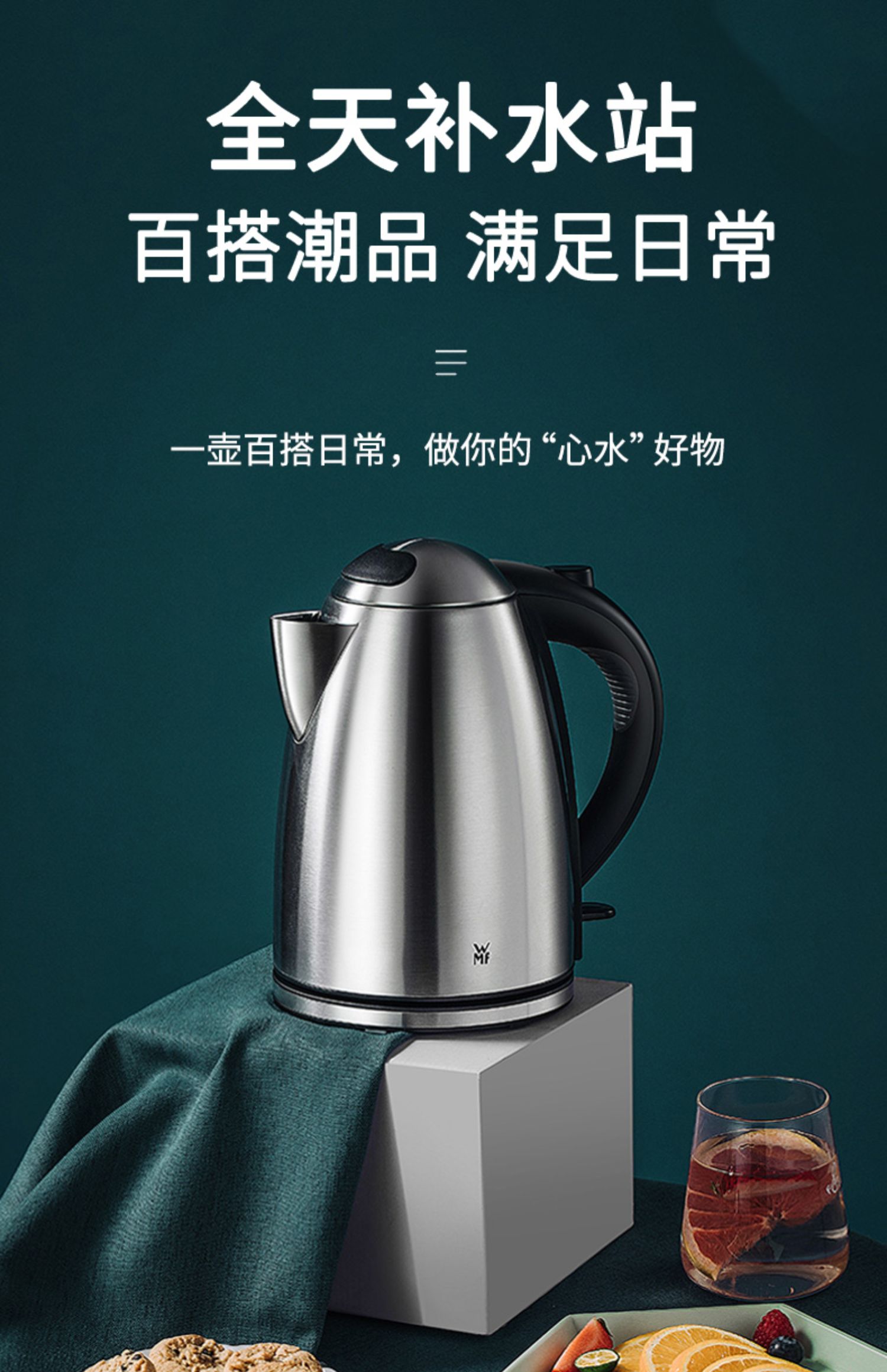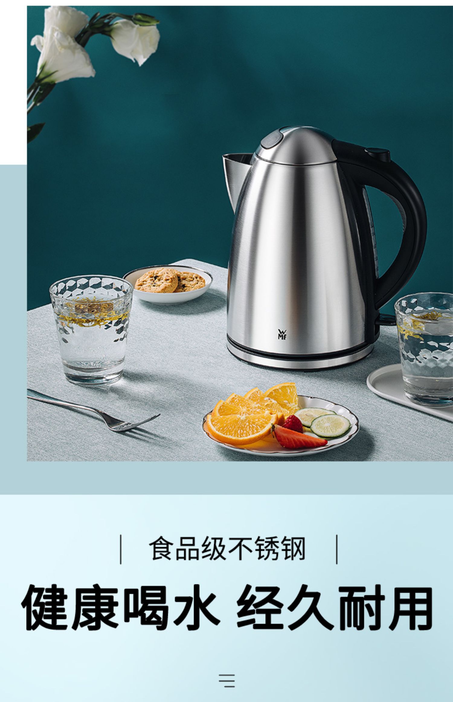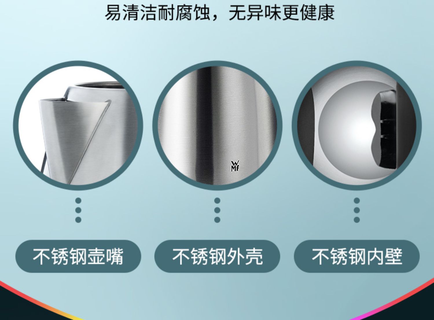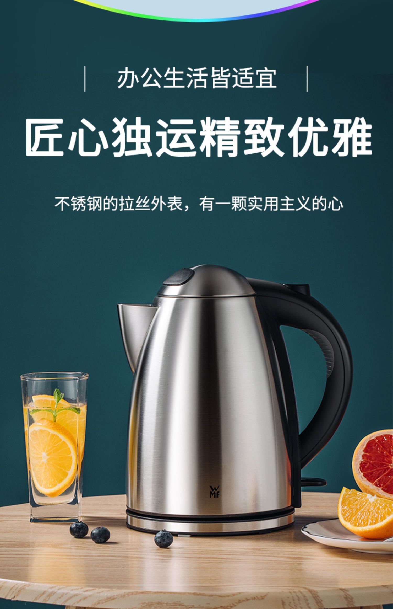 德国WMFStelio1.7L大容量电热水壶,采用304食品级不锈钢材质,4重安全保障,5分钟快速沸腾,德系做工尽显精致优雅,一壶百搭日常,做你的“心水”好物