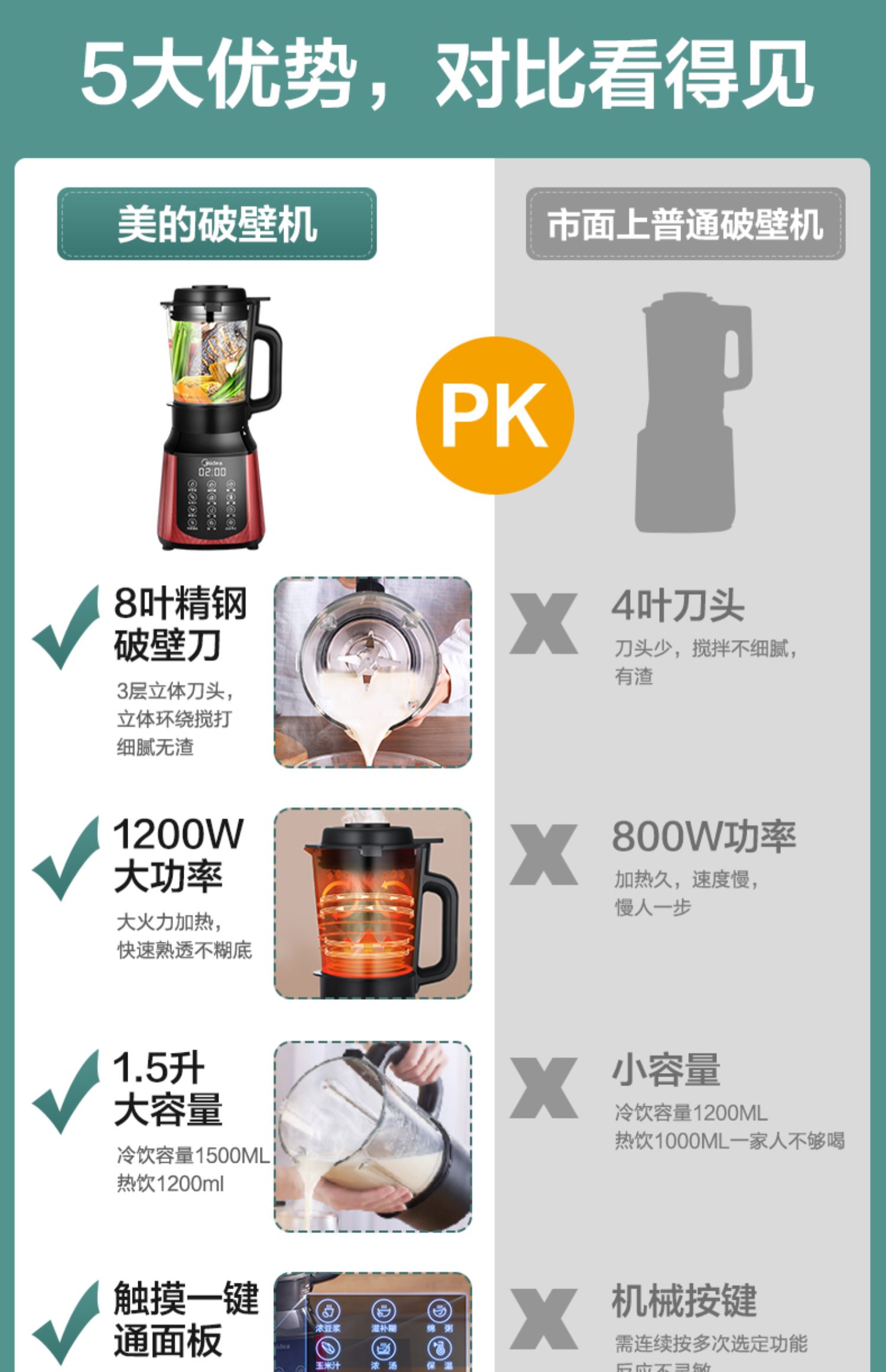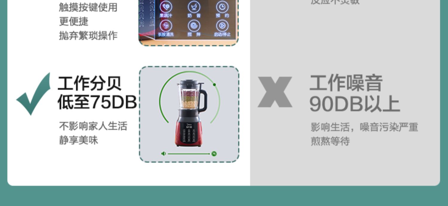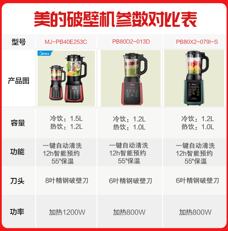美的多功能料理机,8叶精钢刀,高速强悍,粉碎耐用,一键触达抛弃繁琐,1200W大火力加热,12h预约55度保温,一键享免滤热豆浆,暖心冬日养生又细腻~