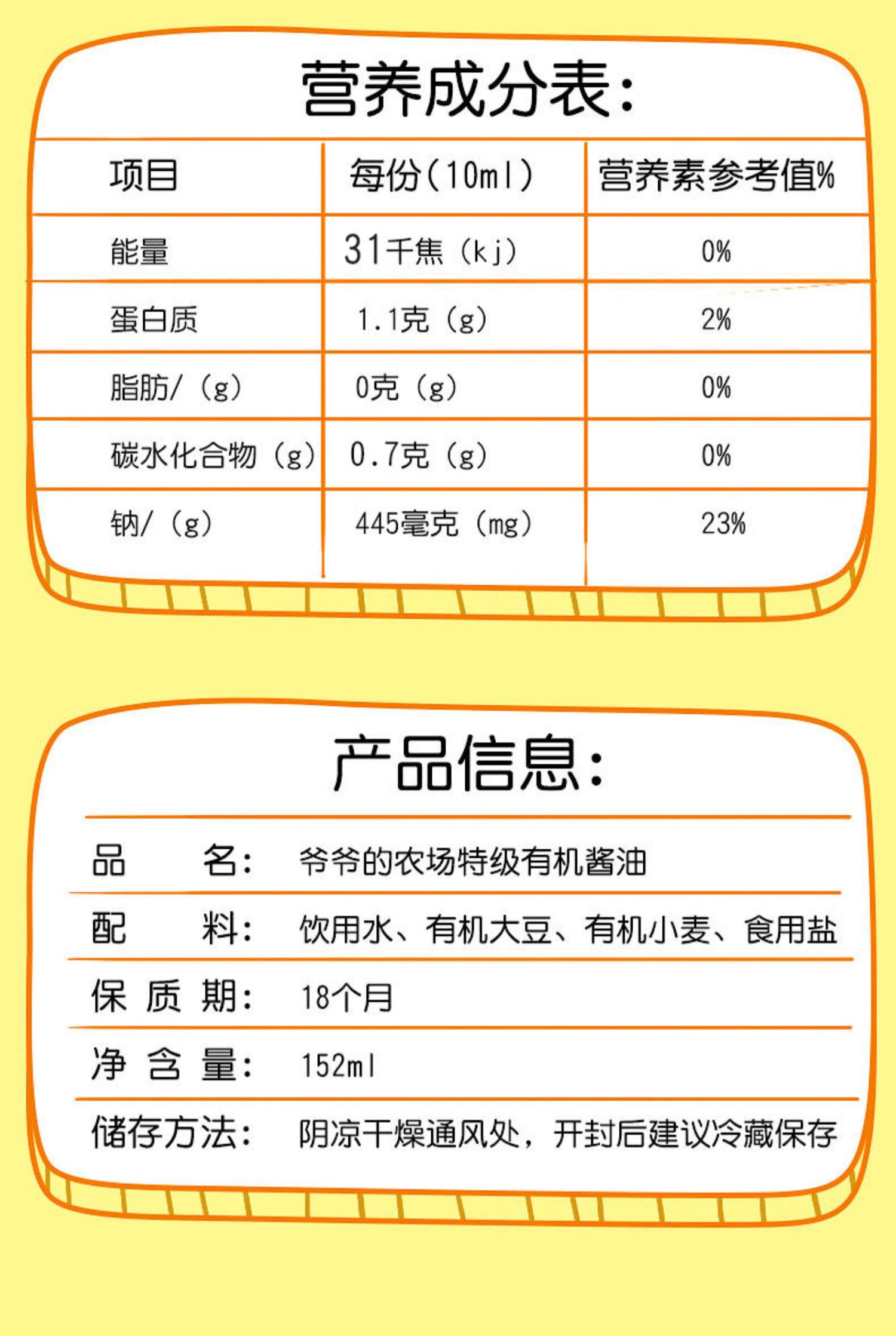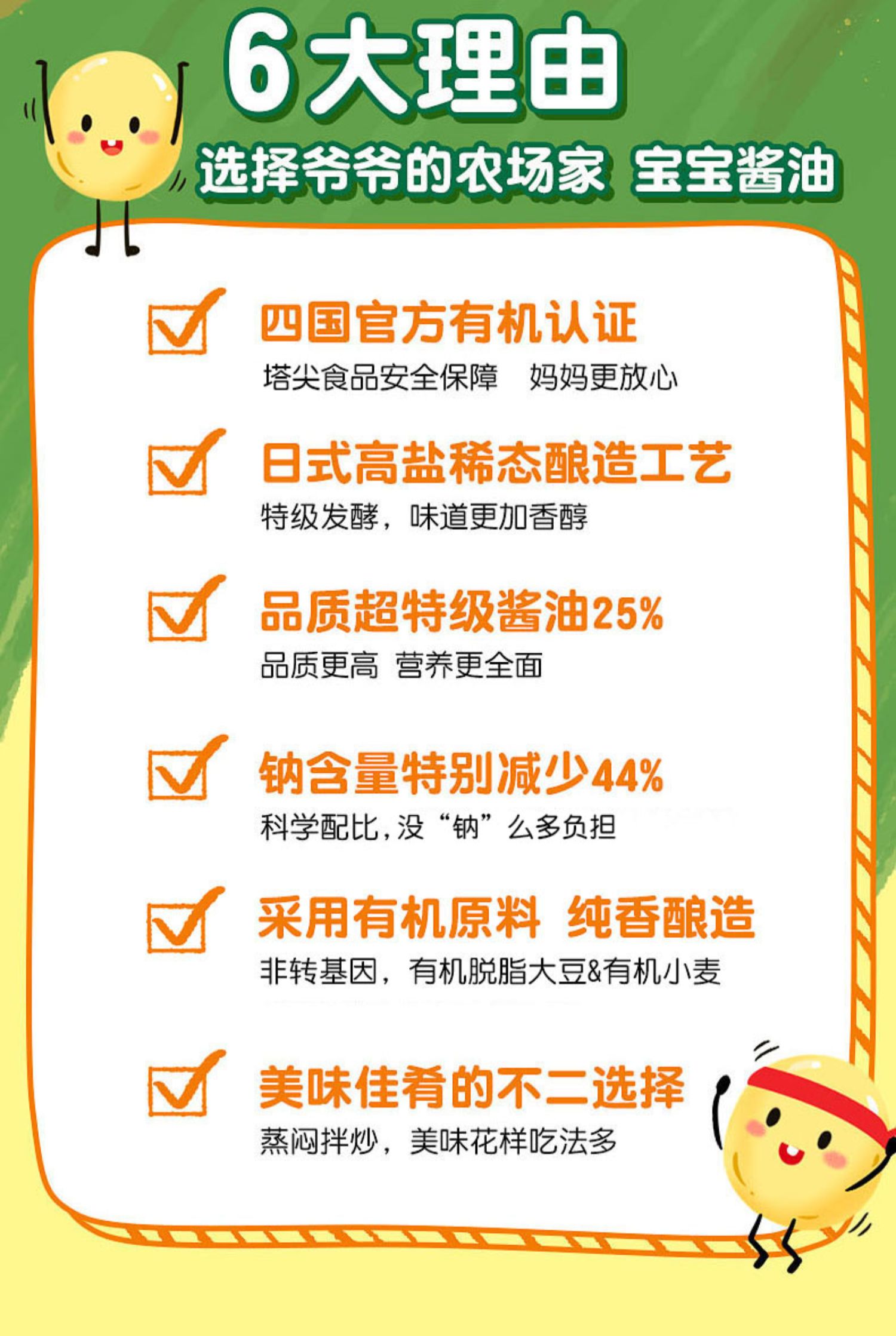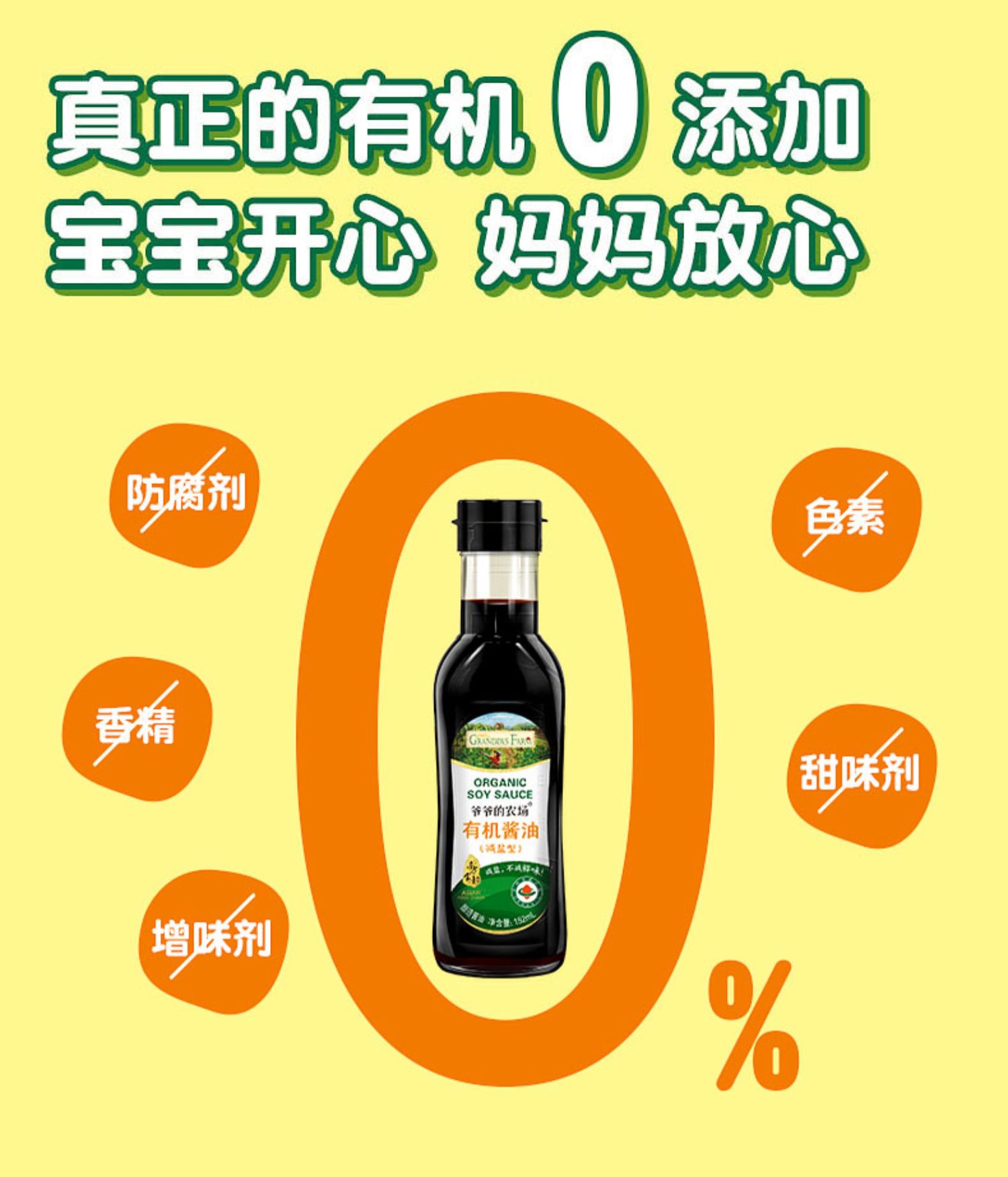 【拍2件5折】爷爷的农场,高营养更安全,无添加调料有机酱油,妈妈放心!每一滴都很用心!炒菜,凉拌,给宝宝做辅食,营养又健康!!