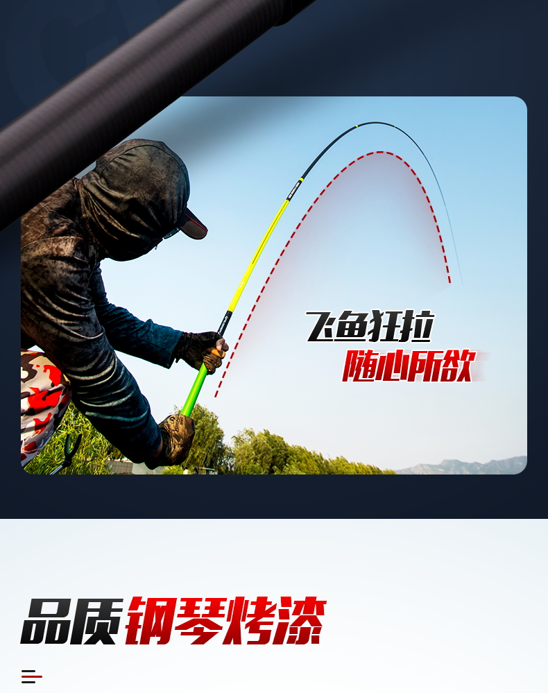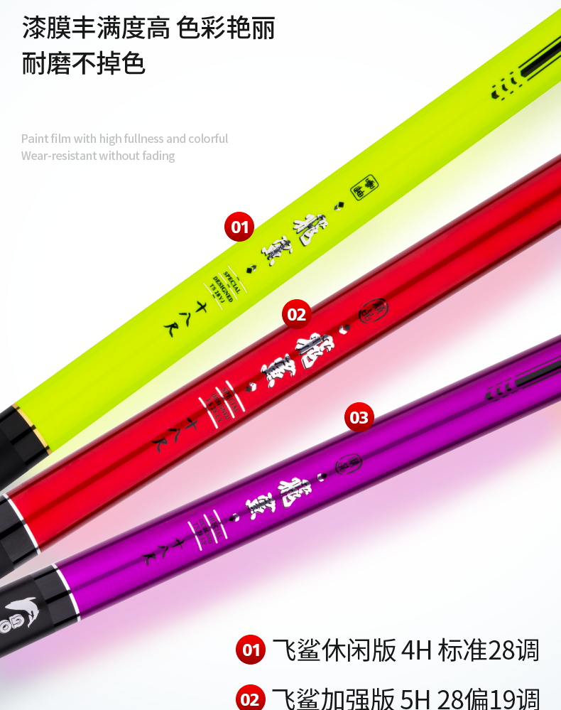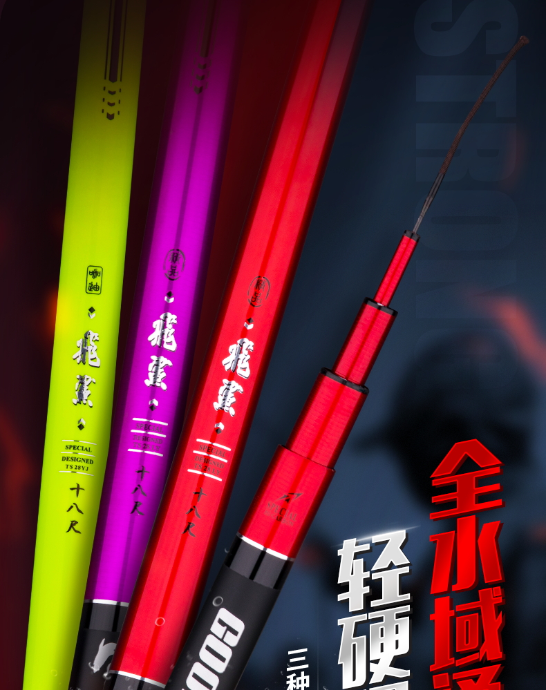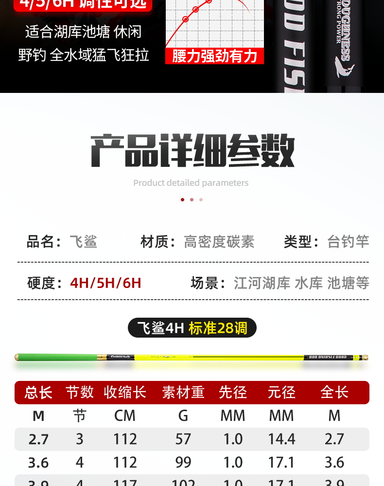 三种调性,适用性广,总有一款适合您。轻硬强劲,全水域通杀,免费配节。小身材,大爆发,一竿足以钓天下,快来囤上!