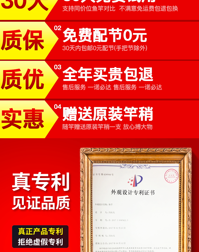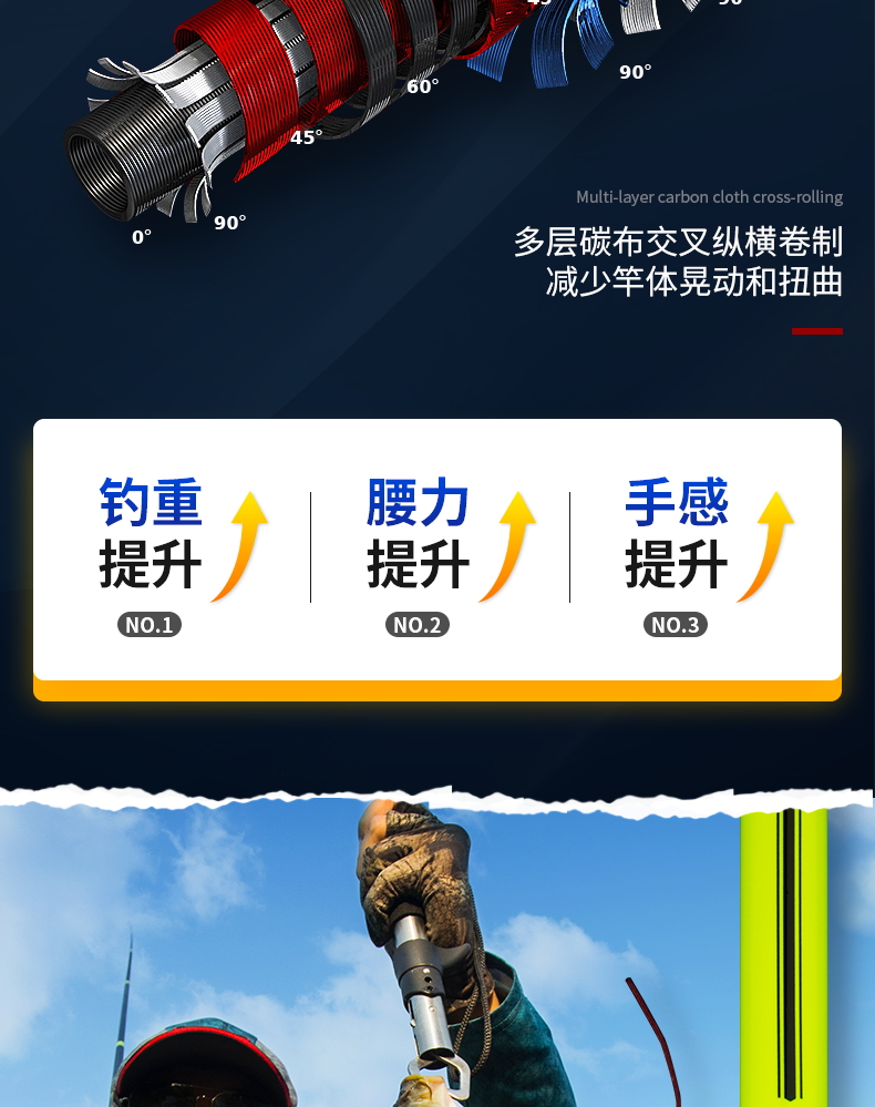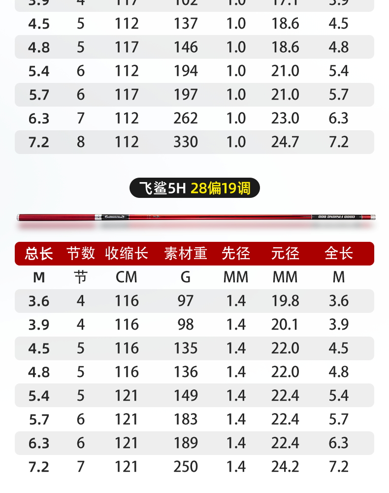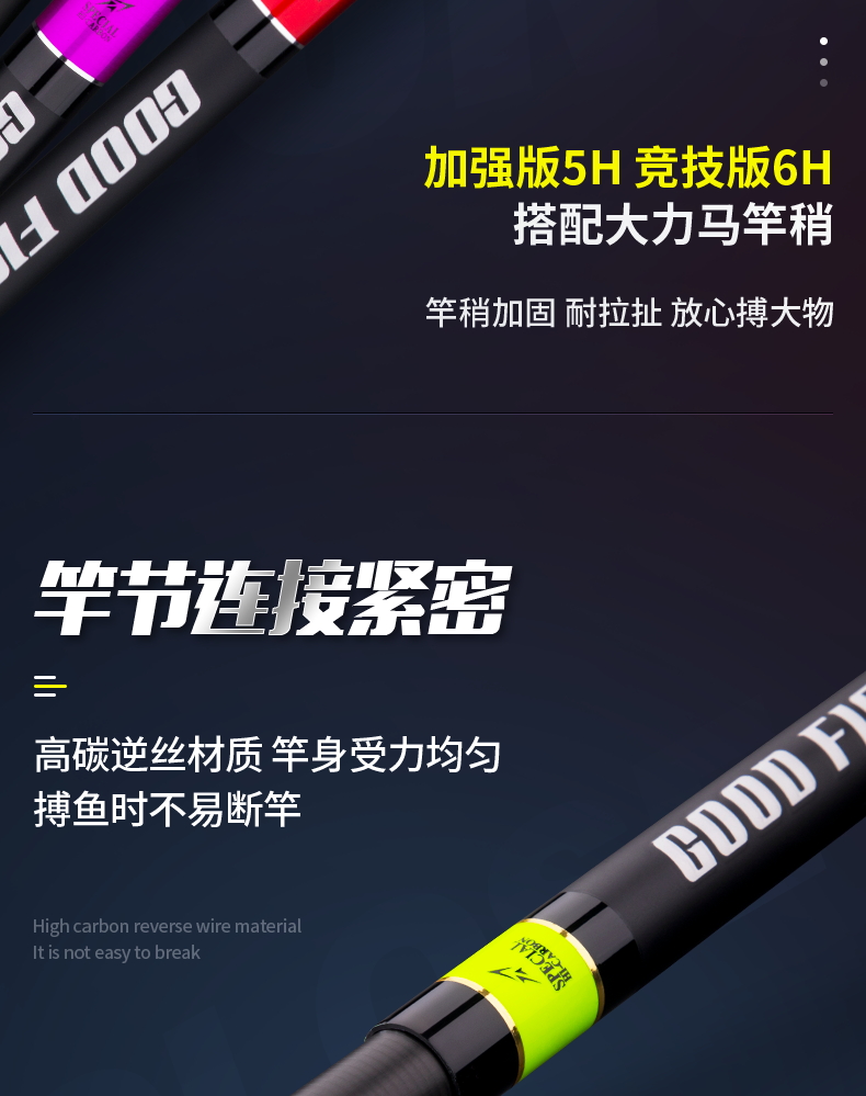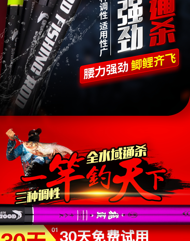 三种调性,适用性广,总有一款适合您。轻硬强劲,全水域通杀,免费配节。小身材,大爆发,一竿足以钓天下,快来囤上!