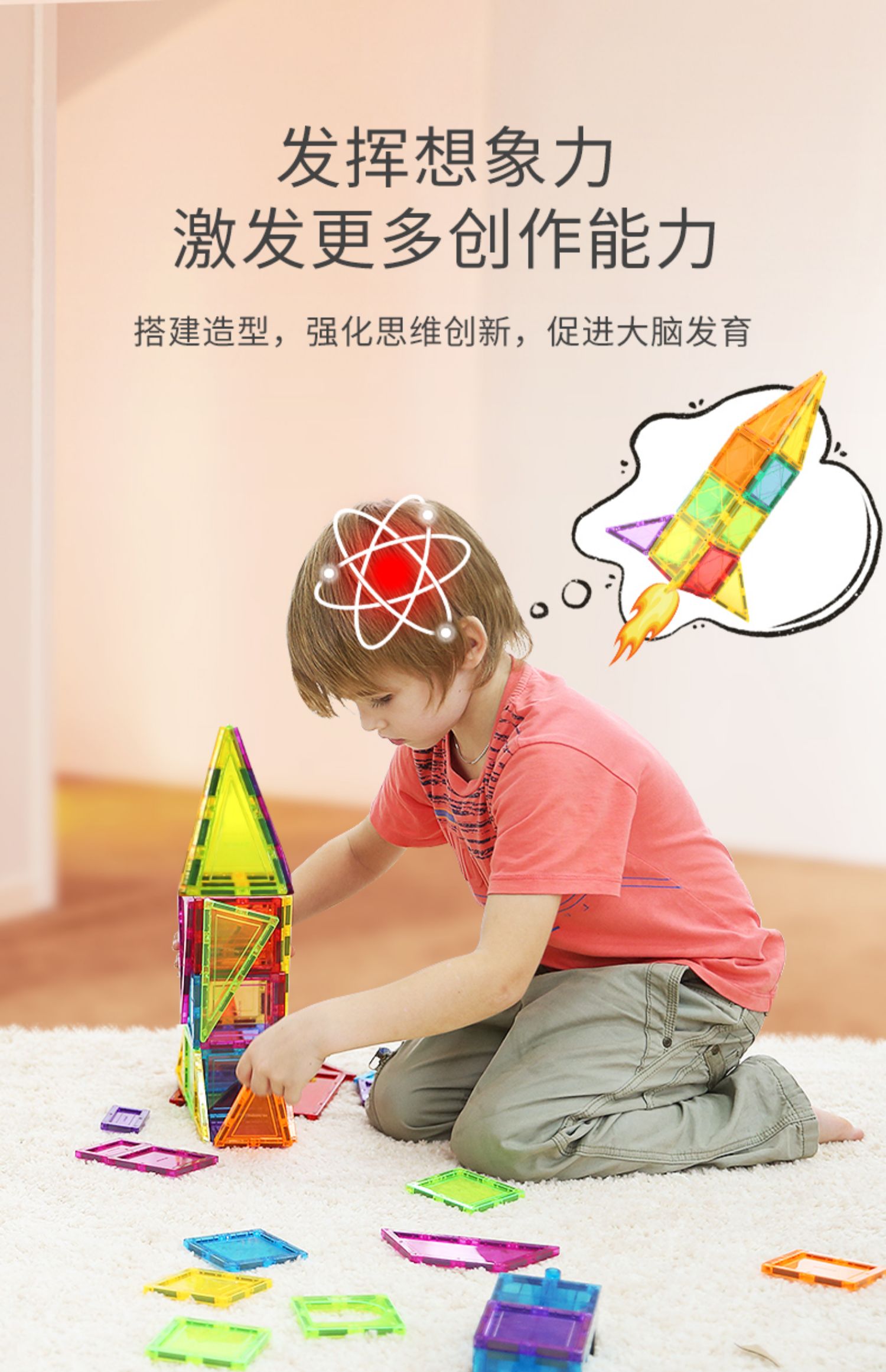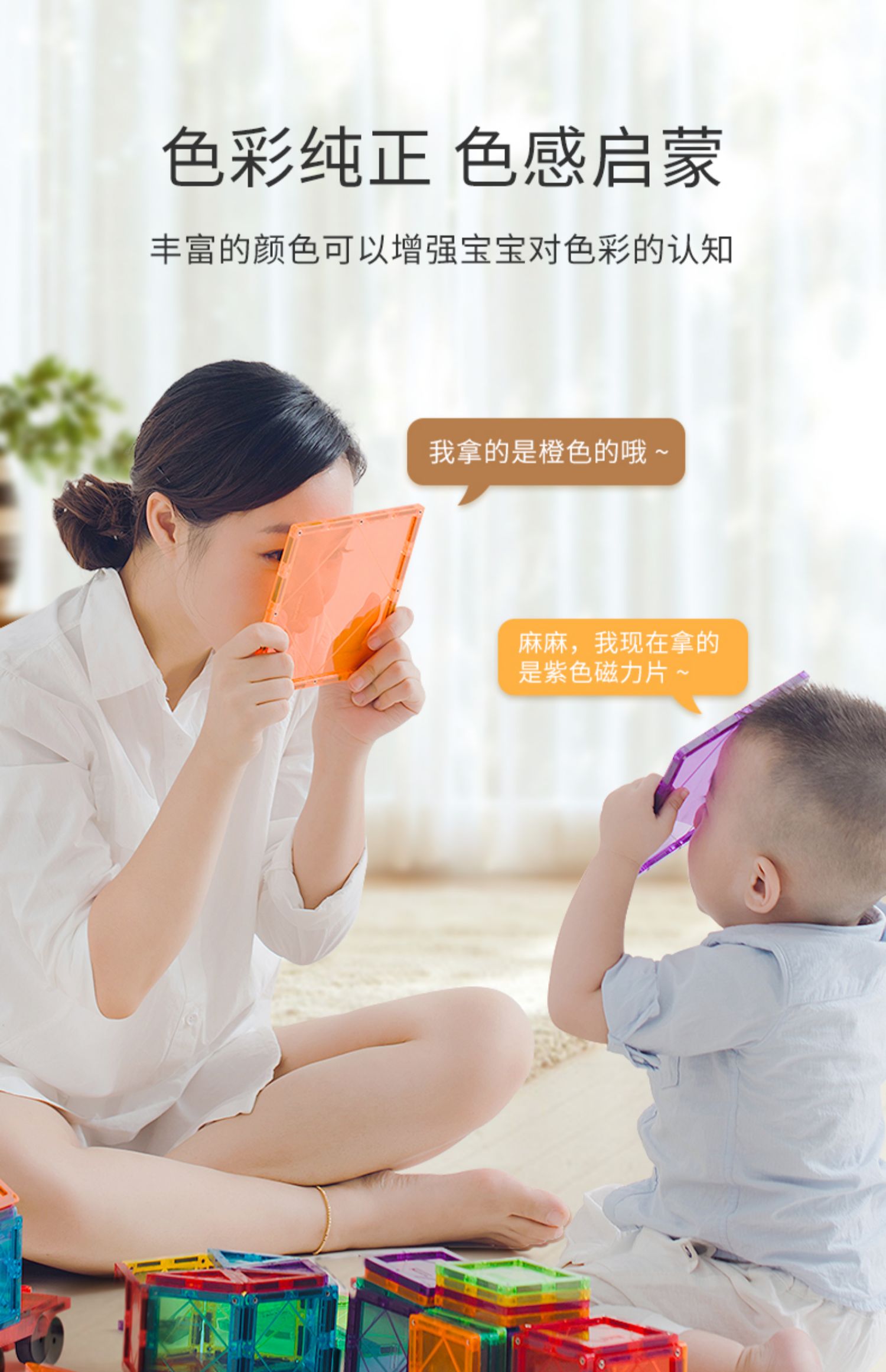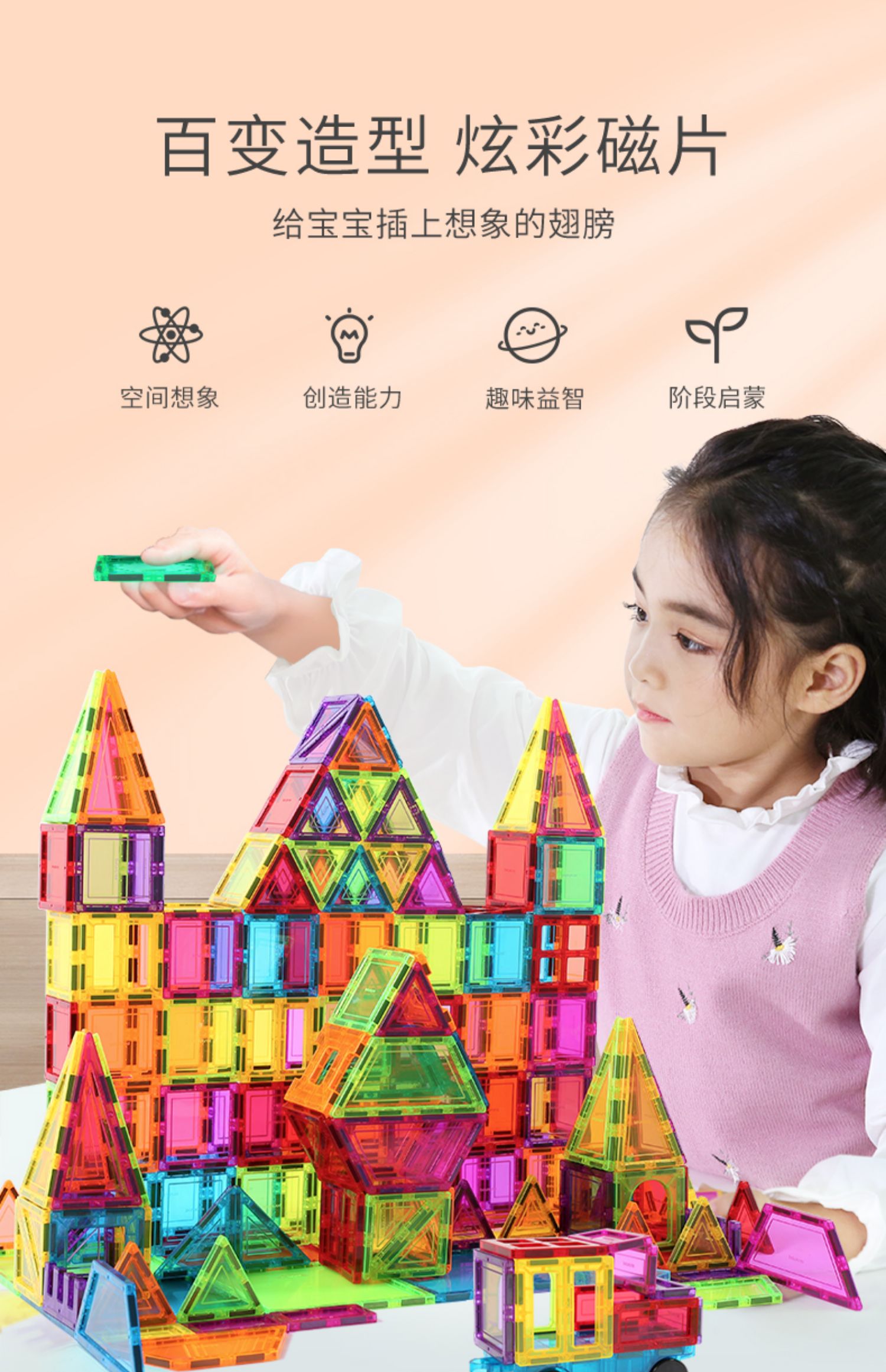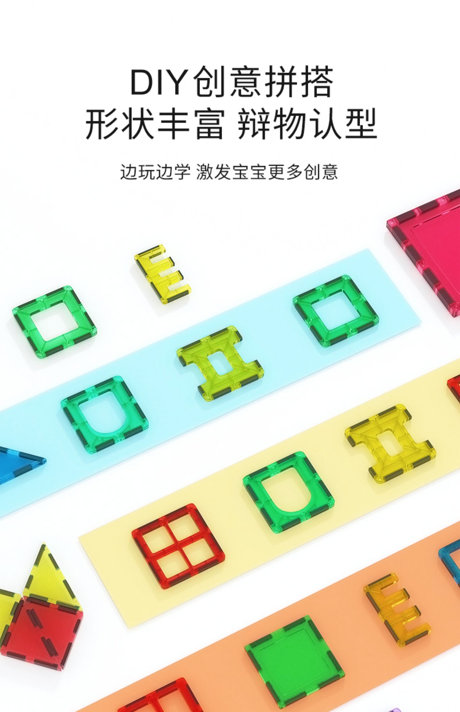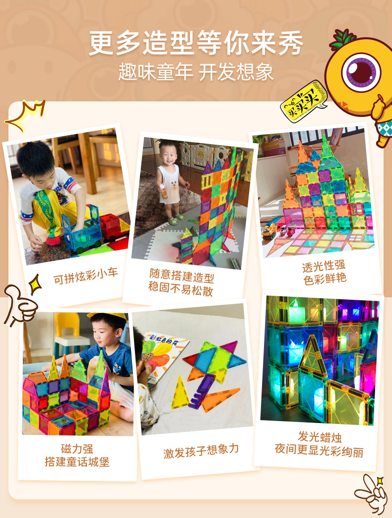 百变造型童趣世界,严选ABS塑胶,加长加宽磁铁,轻松摆造型,成型稳定,随意搭不倒,色彩绚丽,纯色半透明磁片,帮助宝宝迅速认识多种颜色!给宝宝插上想象的翅膀,激发想象力提高动手能力!
