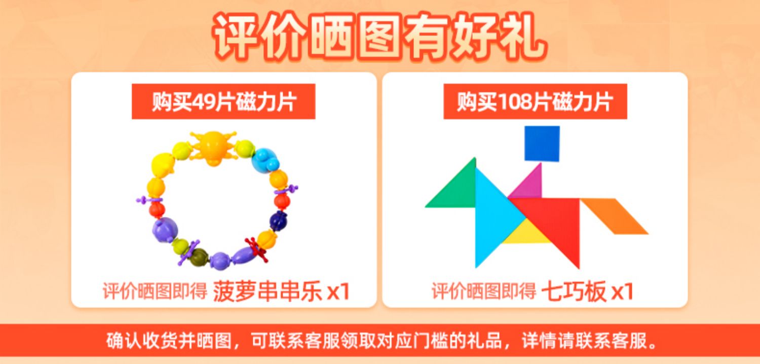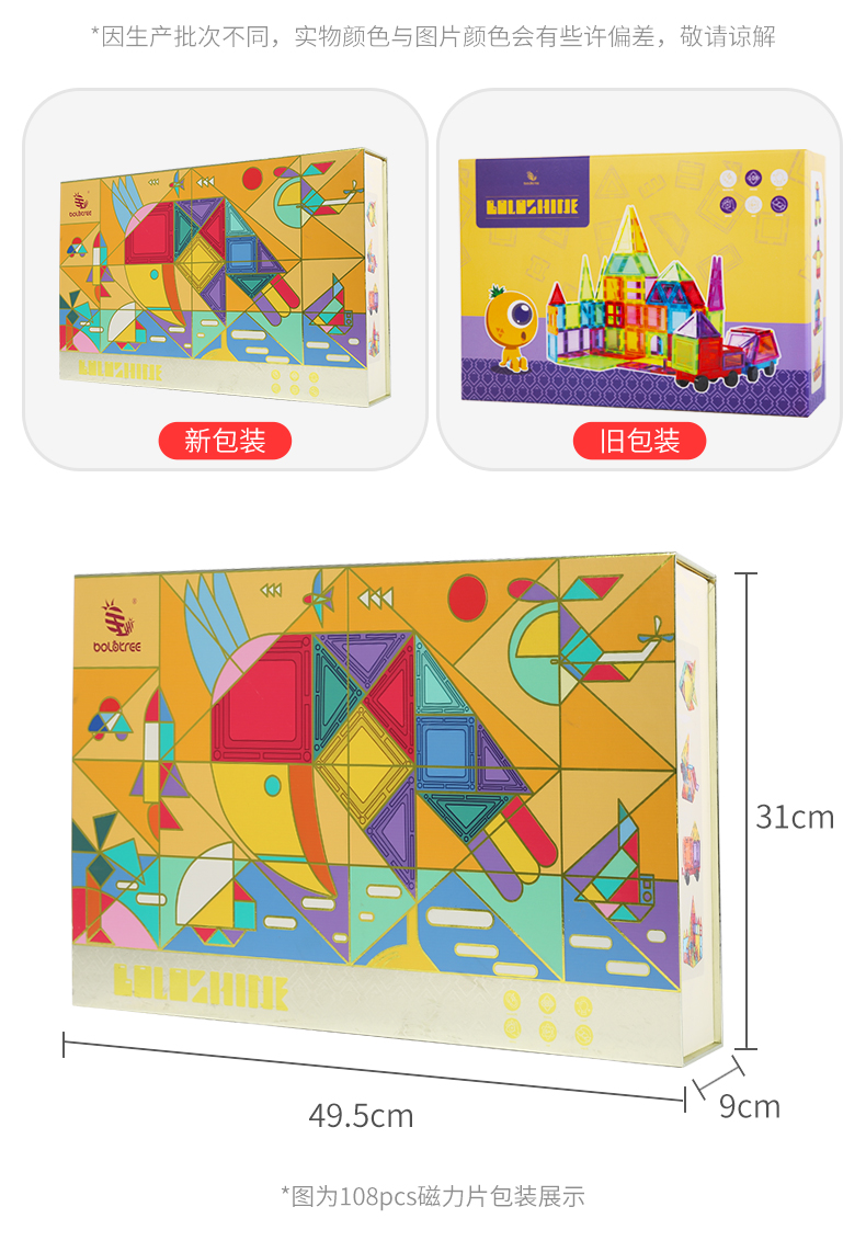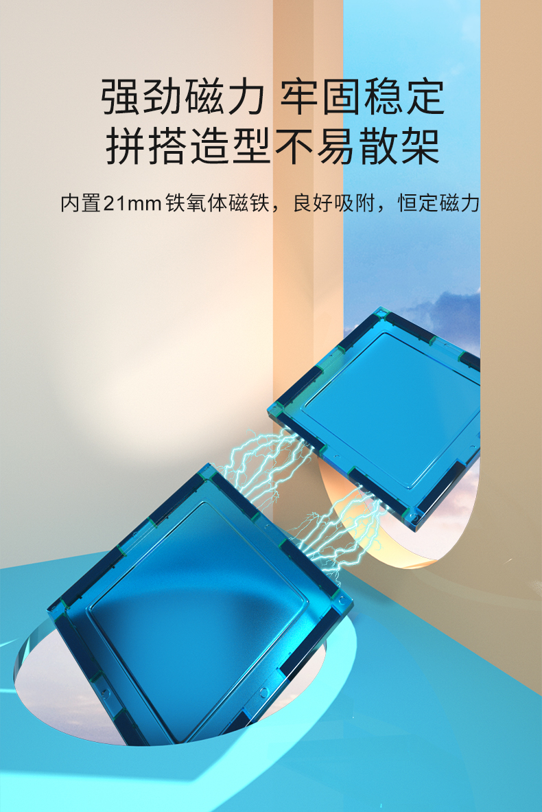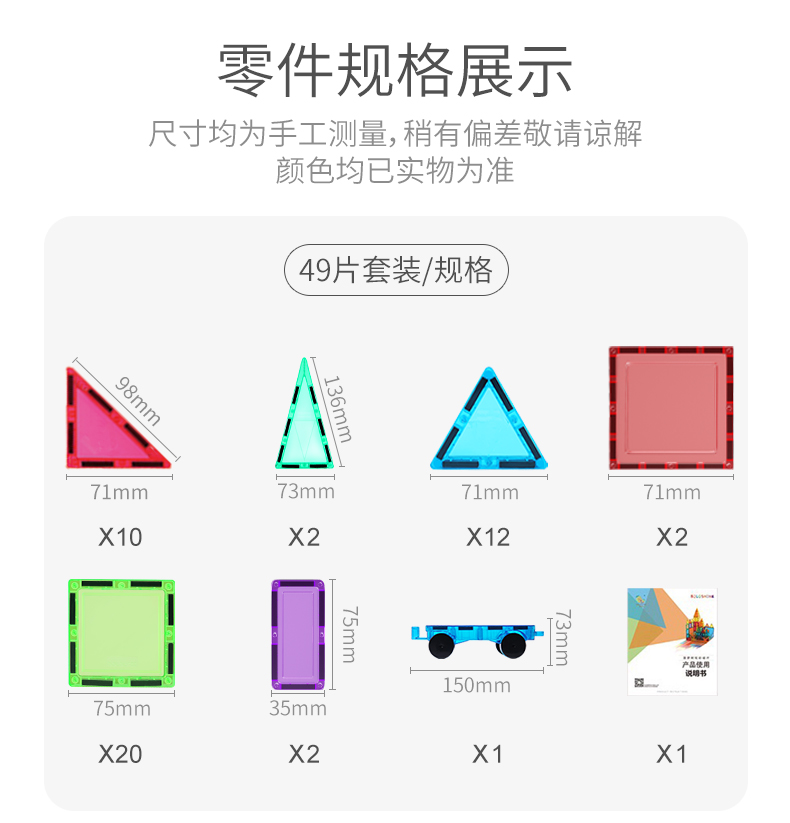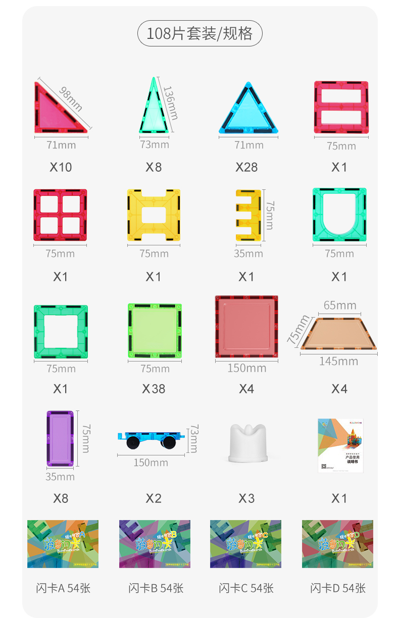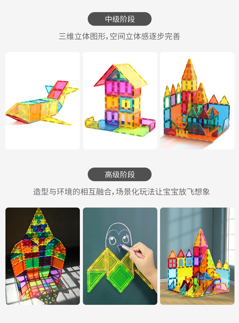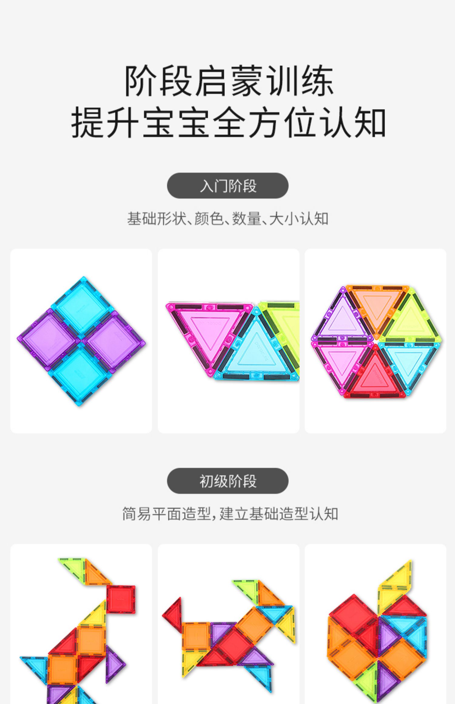 百变造型童趣世界,严选ABS塑胶,加长加宽磁铁,轻松摆造型,成型稳定,随意搭不倒,色彩绚丽,纯色半透明磁片,帮助宝宝迅速认识多种颜色!给宝宝插上想象的翅膀,激发想象力提高动手能力!