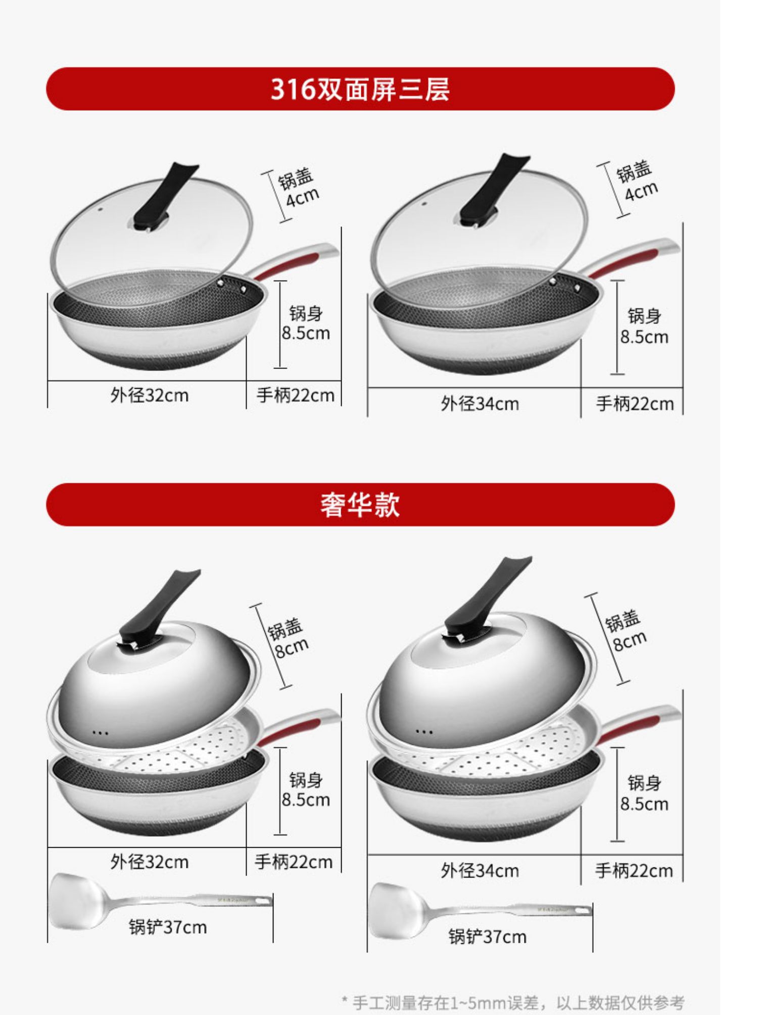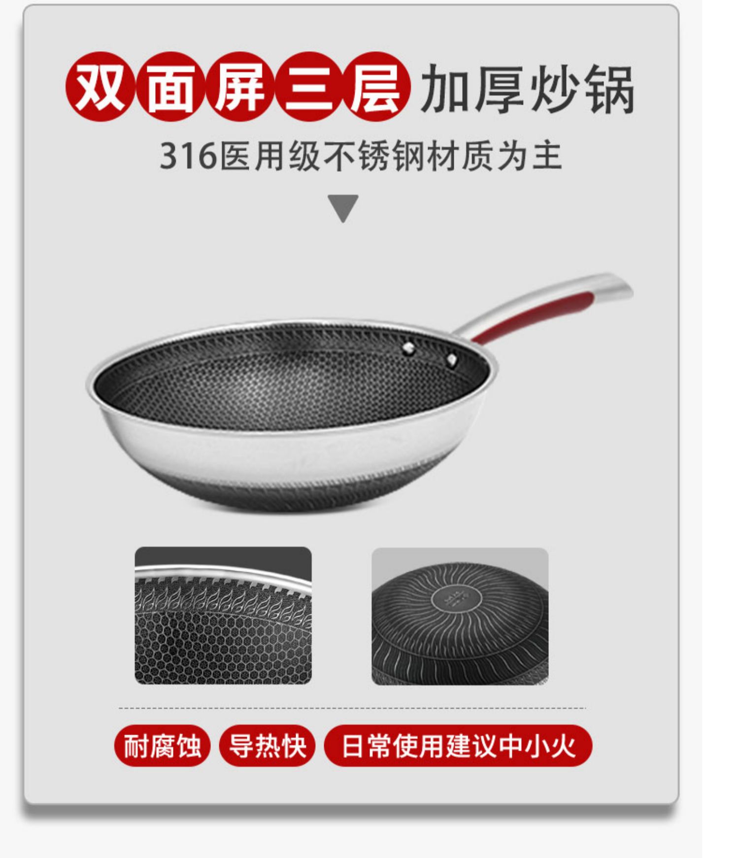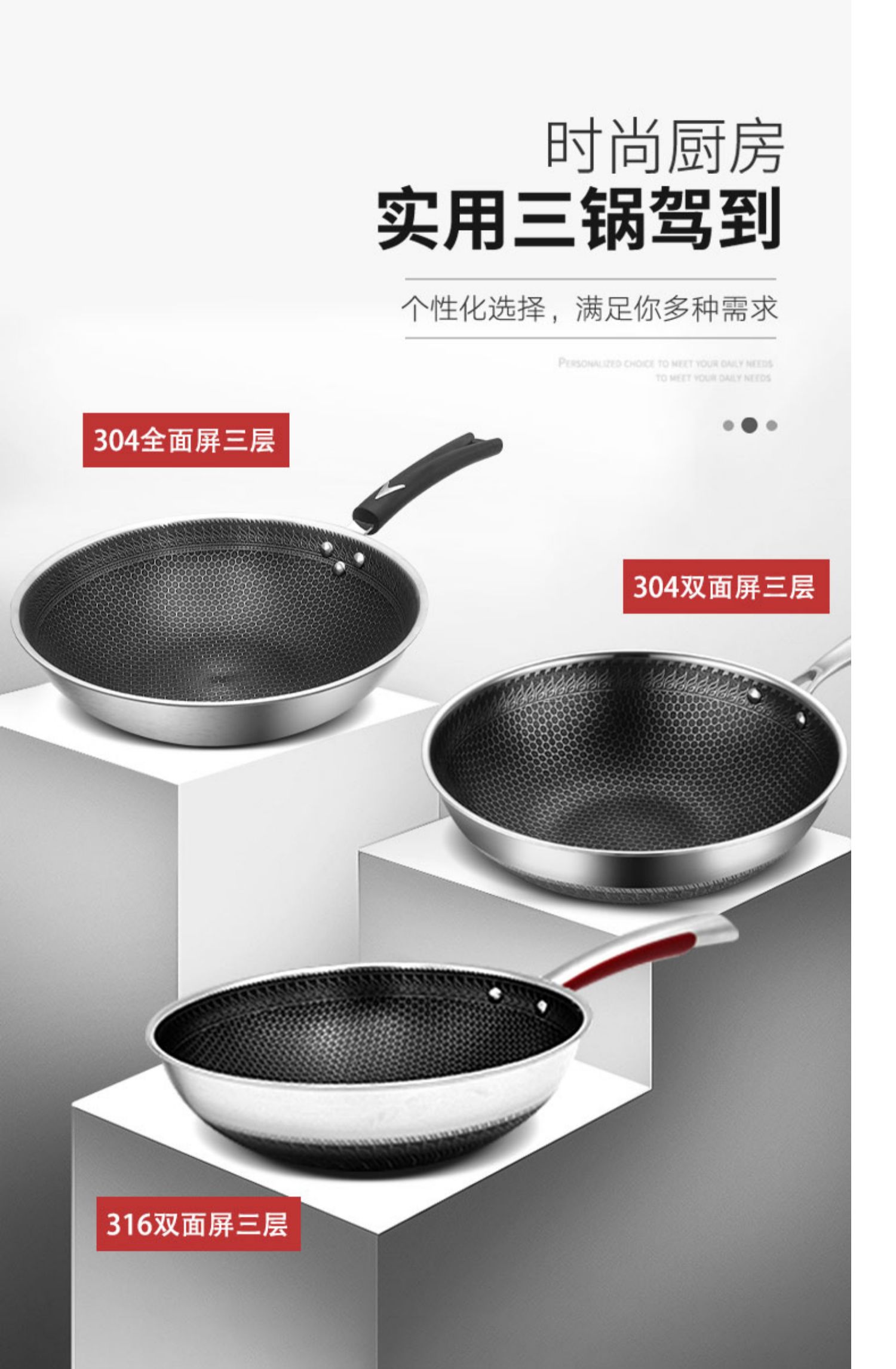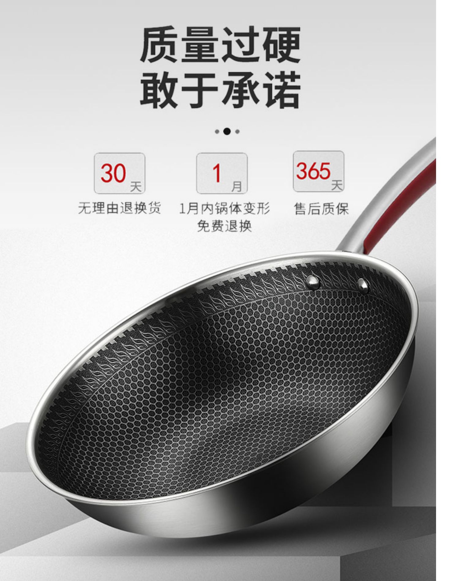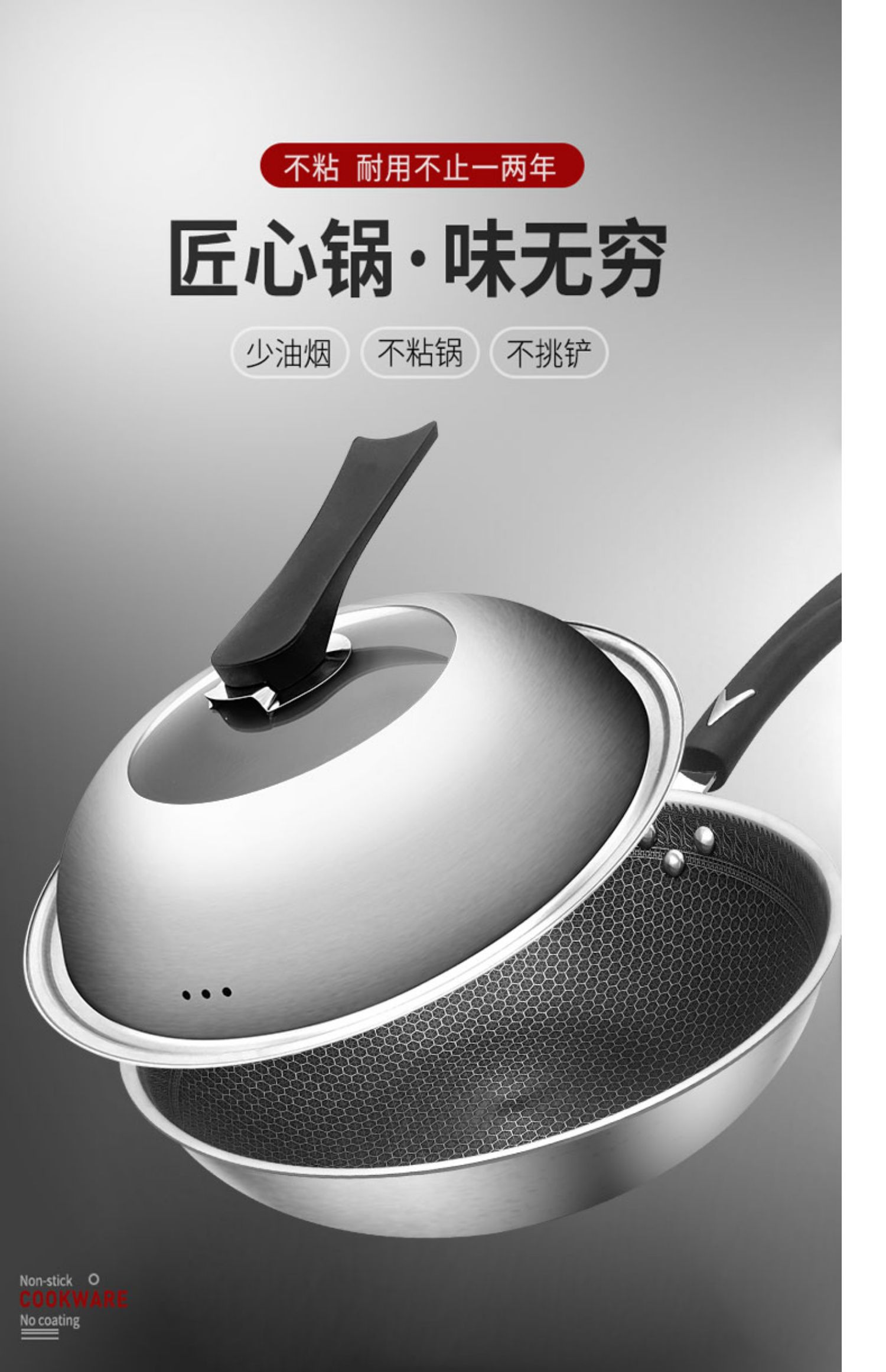 荣事达国企品牌,专柜699-899,线上首次限量让利,全面屏不锈钢蜂窝不粘炒锅,一体成型,精雕微刻技术,全屏不粘,不惧钢铲钢丝球,炉灶通用,轻烟少油,易清洗