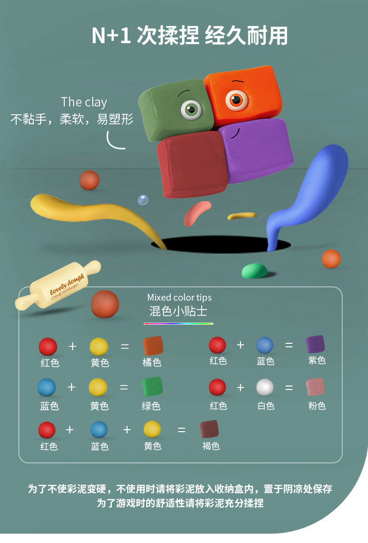 专为儿童设计,天然材料,选用安全放心小麦粉和食用色素,环保无毒又好玩,质地轻柔,拉伸力强,颜色丰富,能锻炼孩子的动手能力,协调孩子思维能力,激发想象力!【七天无理由退换】