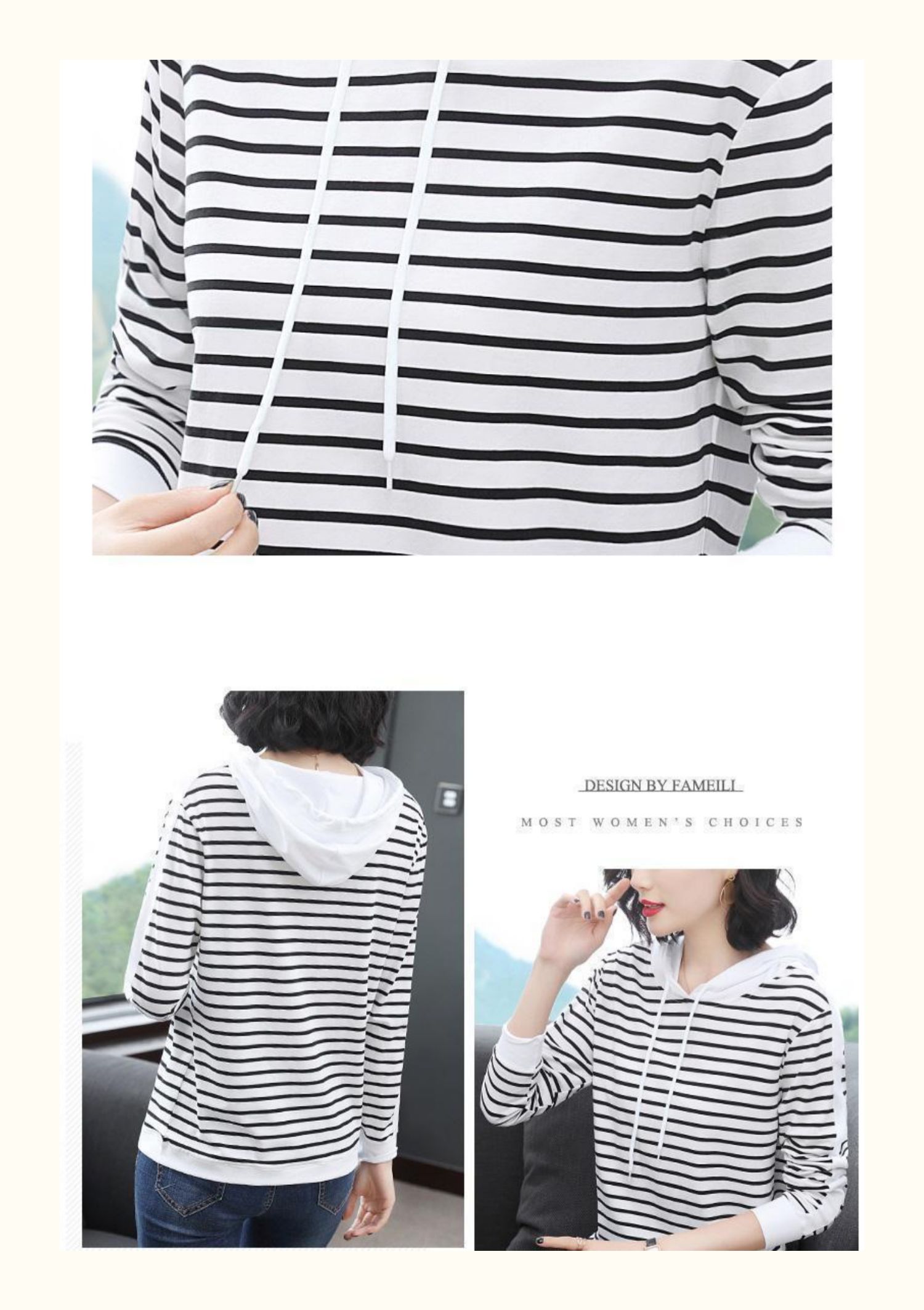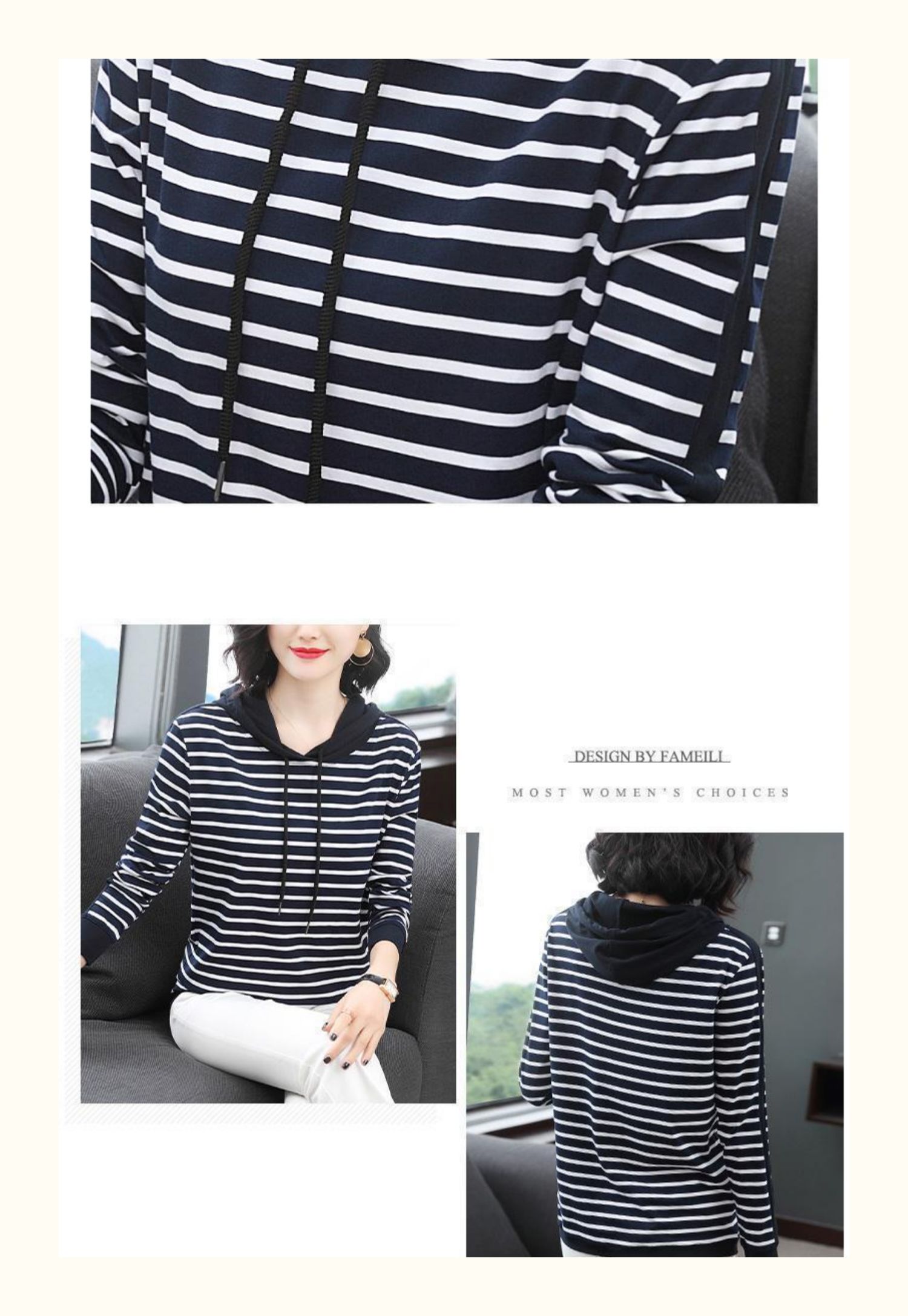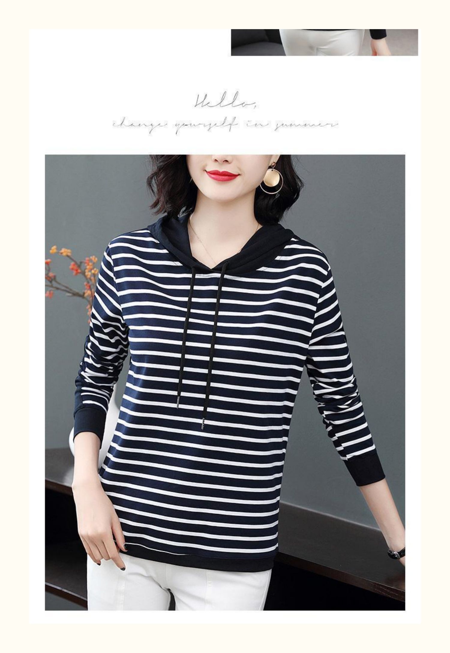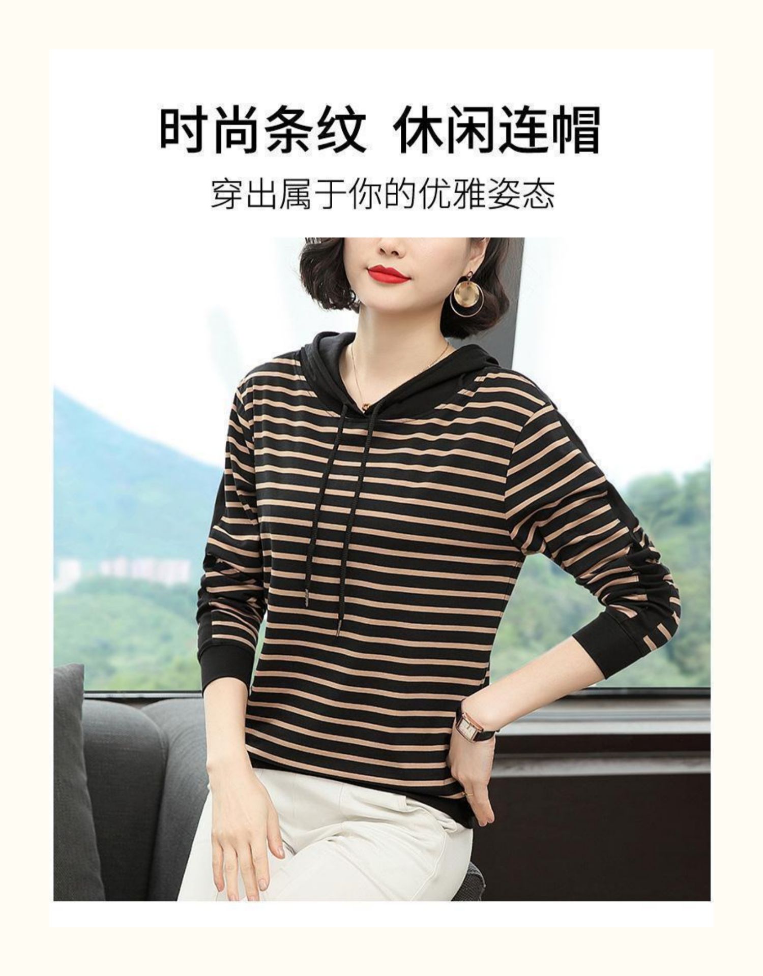 女士秋季新款棉质条纹长袖连帽t恤,宽松上衣服,中年妈妈装,大码打底衫,做工精良,手感细腻柔和,多款多色【增运费险】