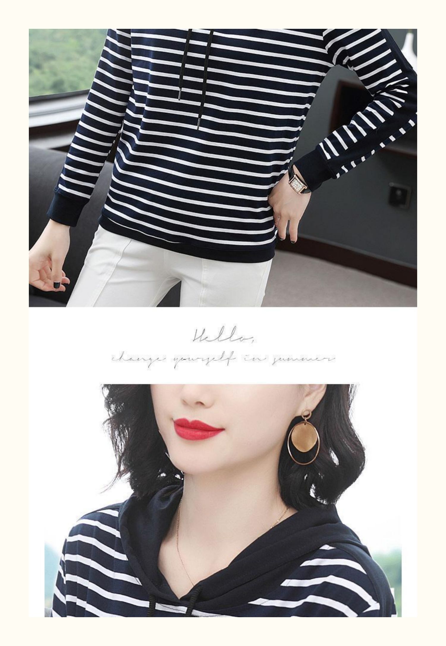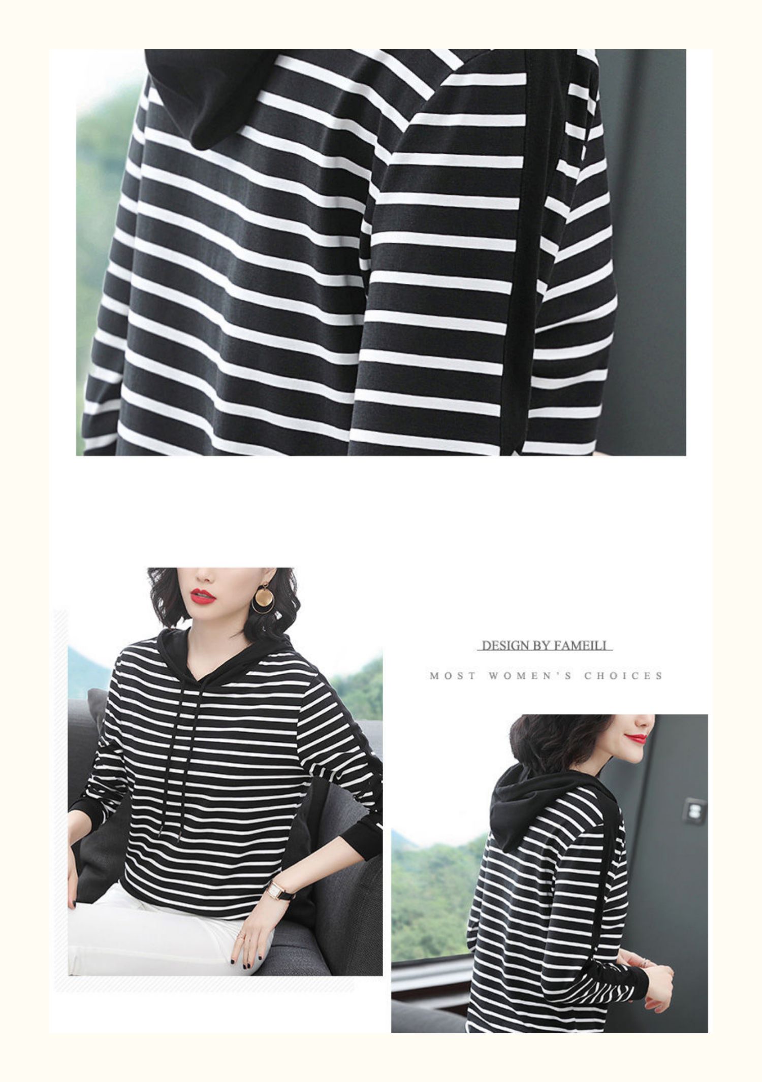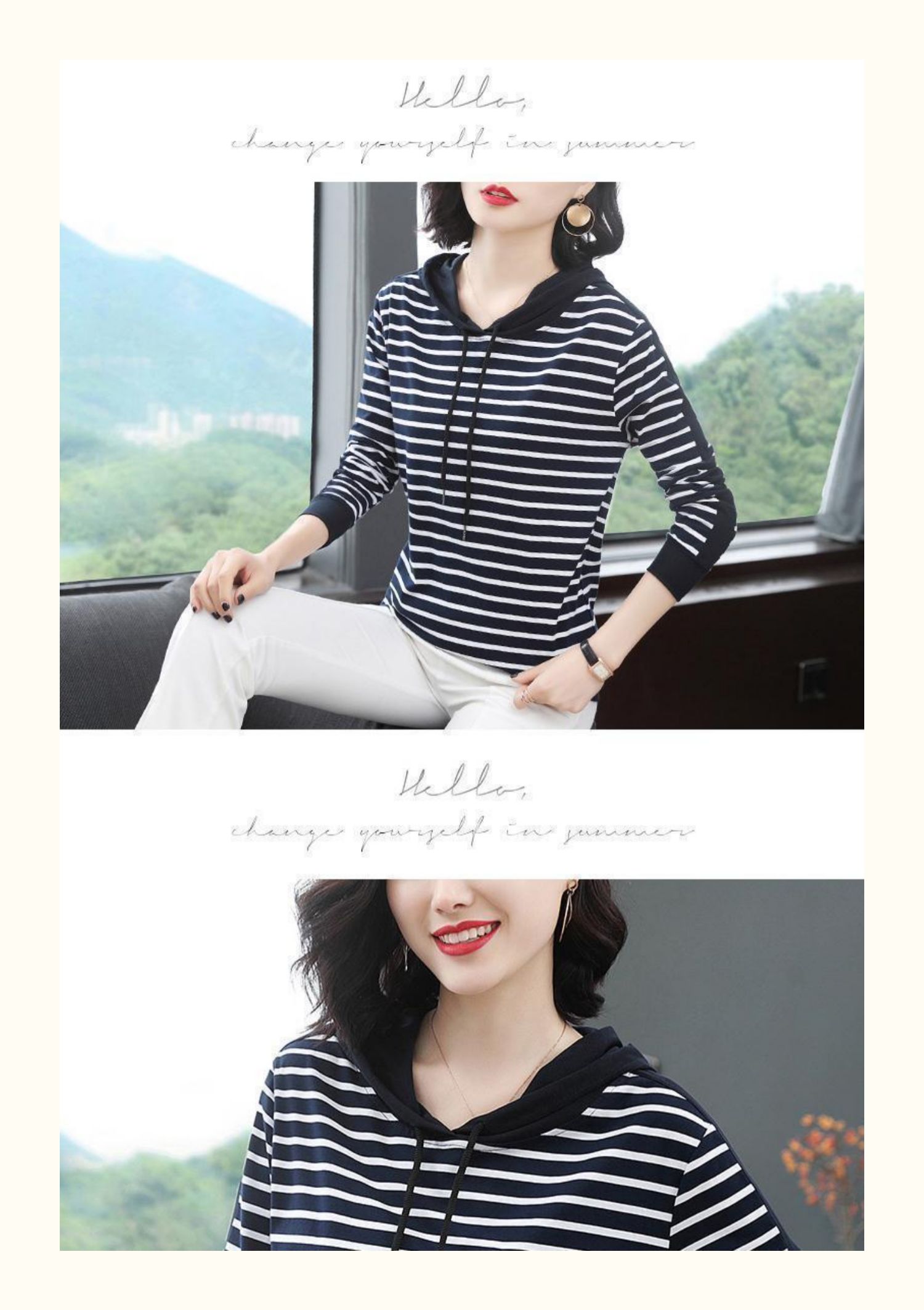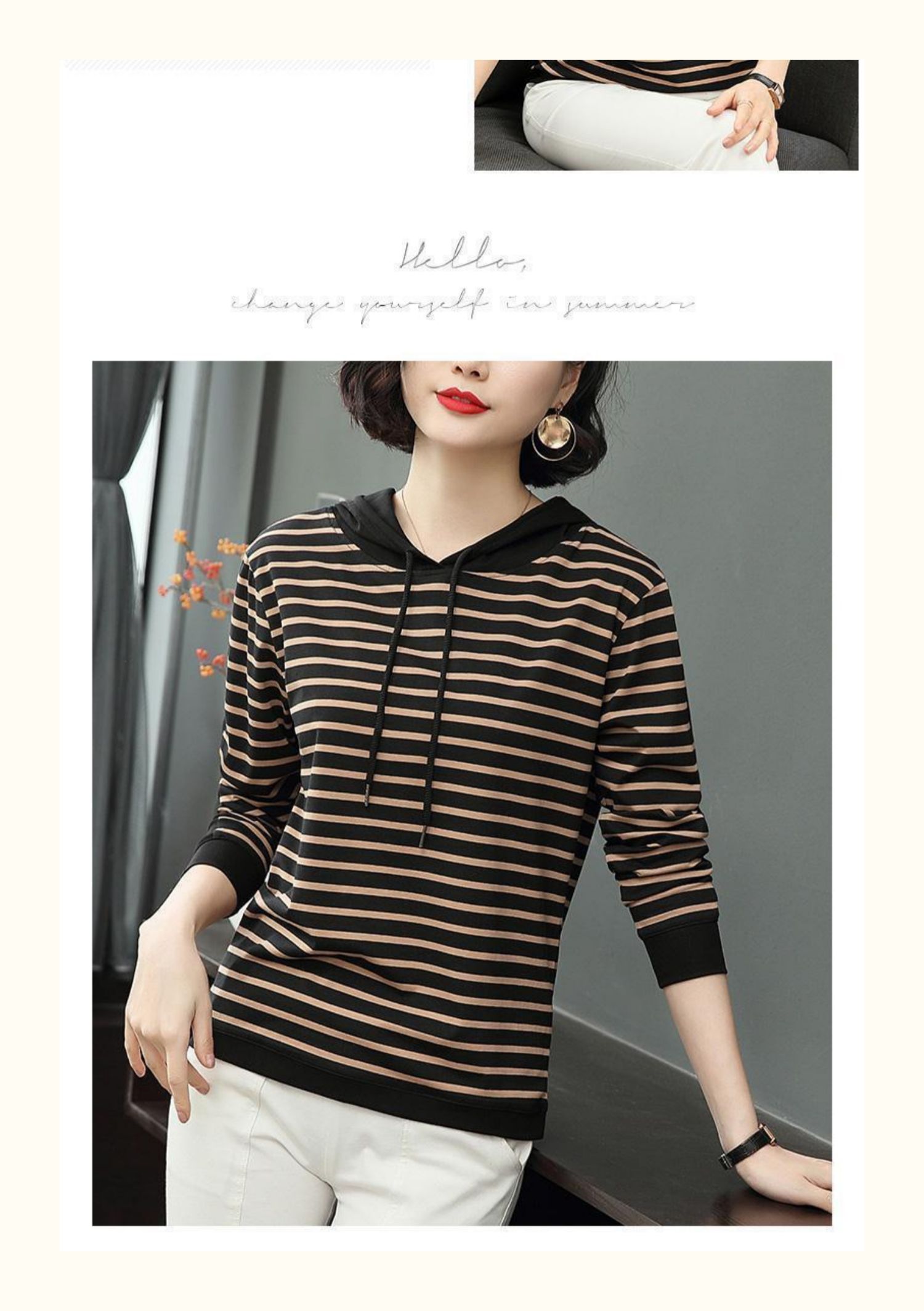 女士秋季新款棉质条纹长袖连帽t恤,宽松上衣服,中年妈妈装,大码打底衫,做工精良,手感细腻柔和,多款多色【增运费险】