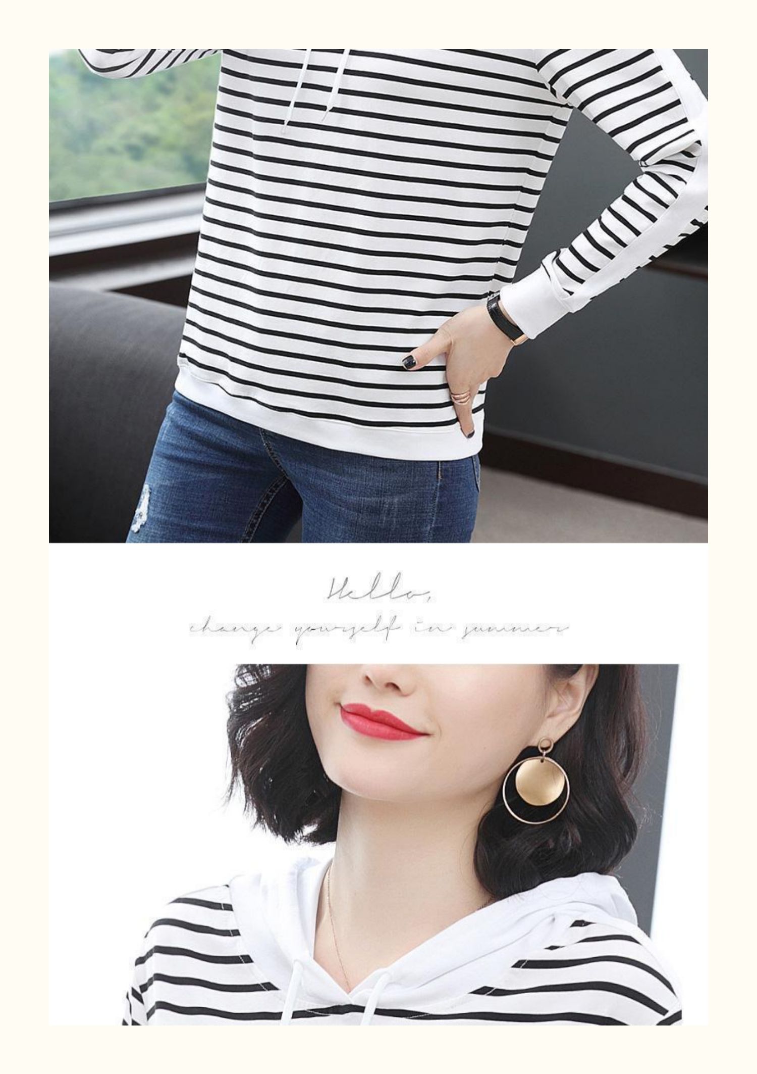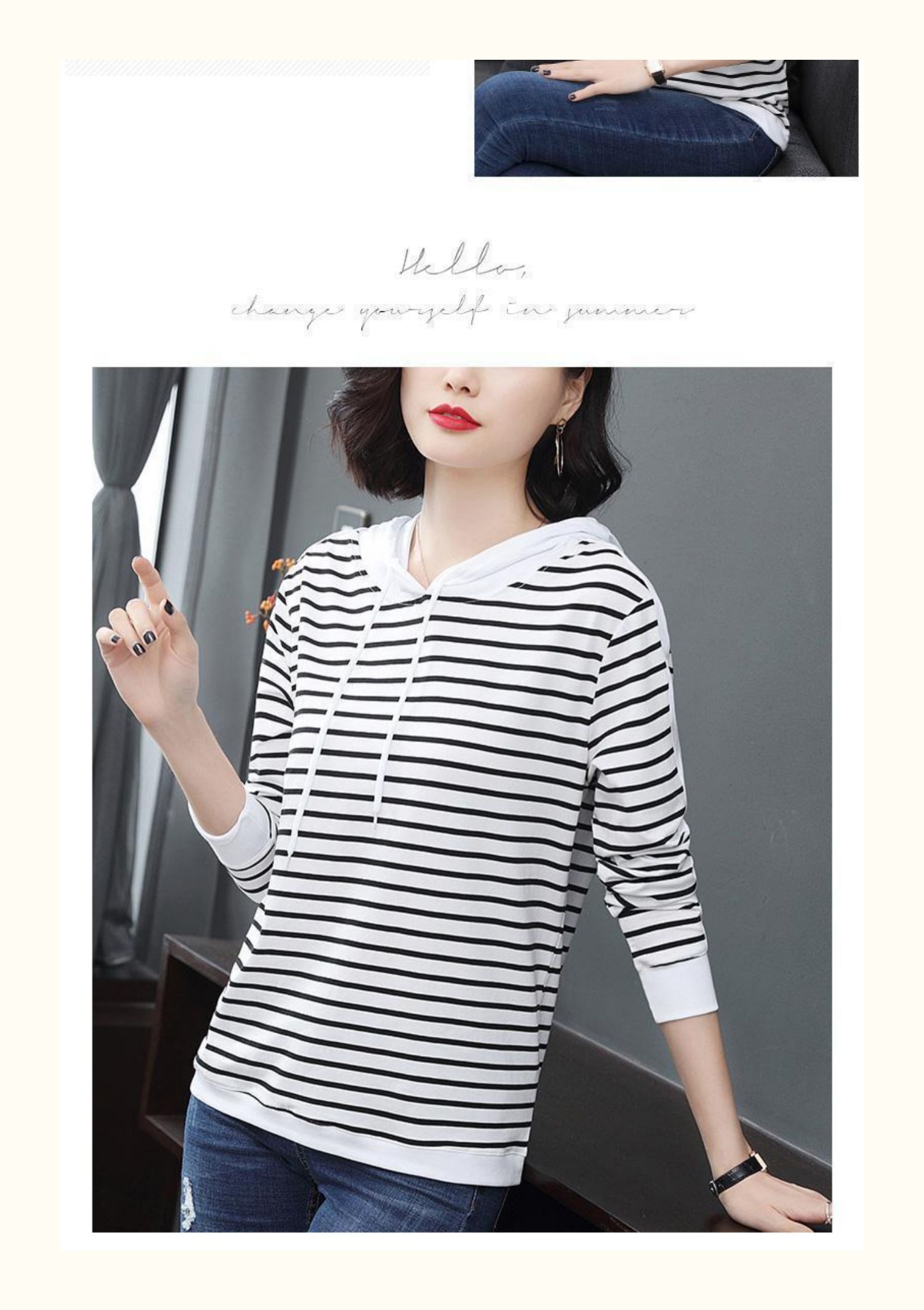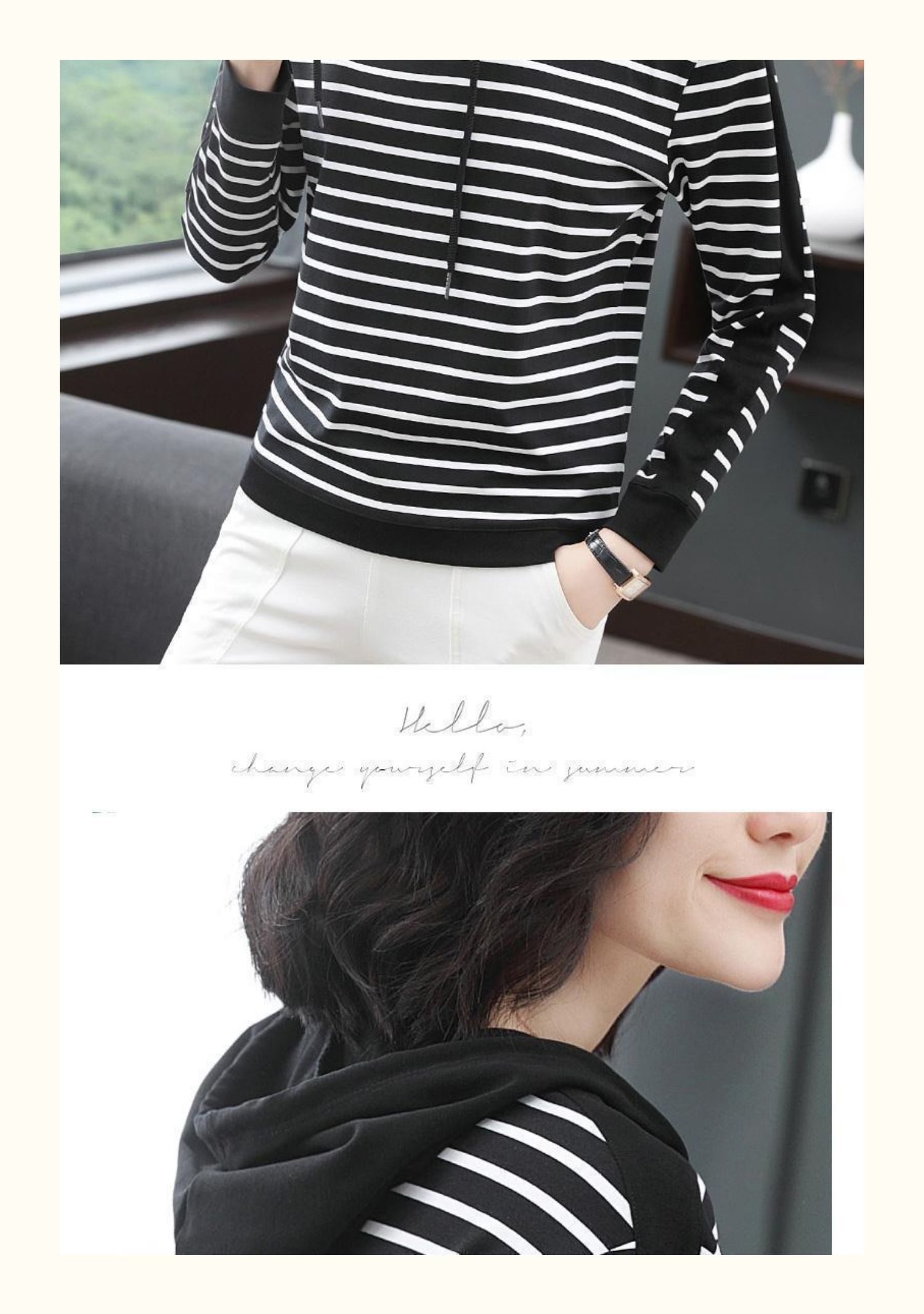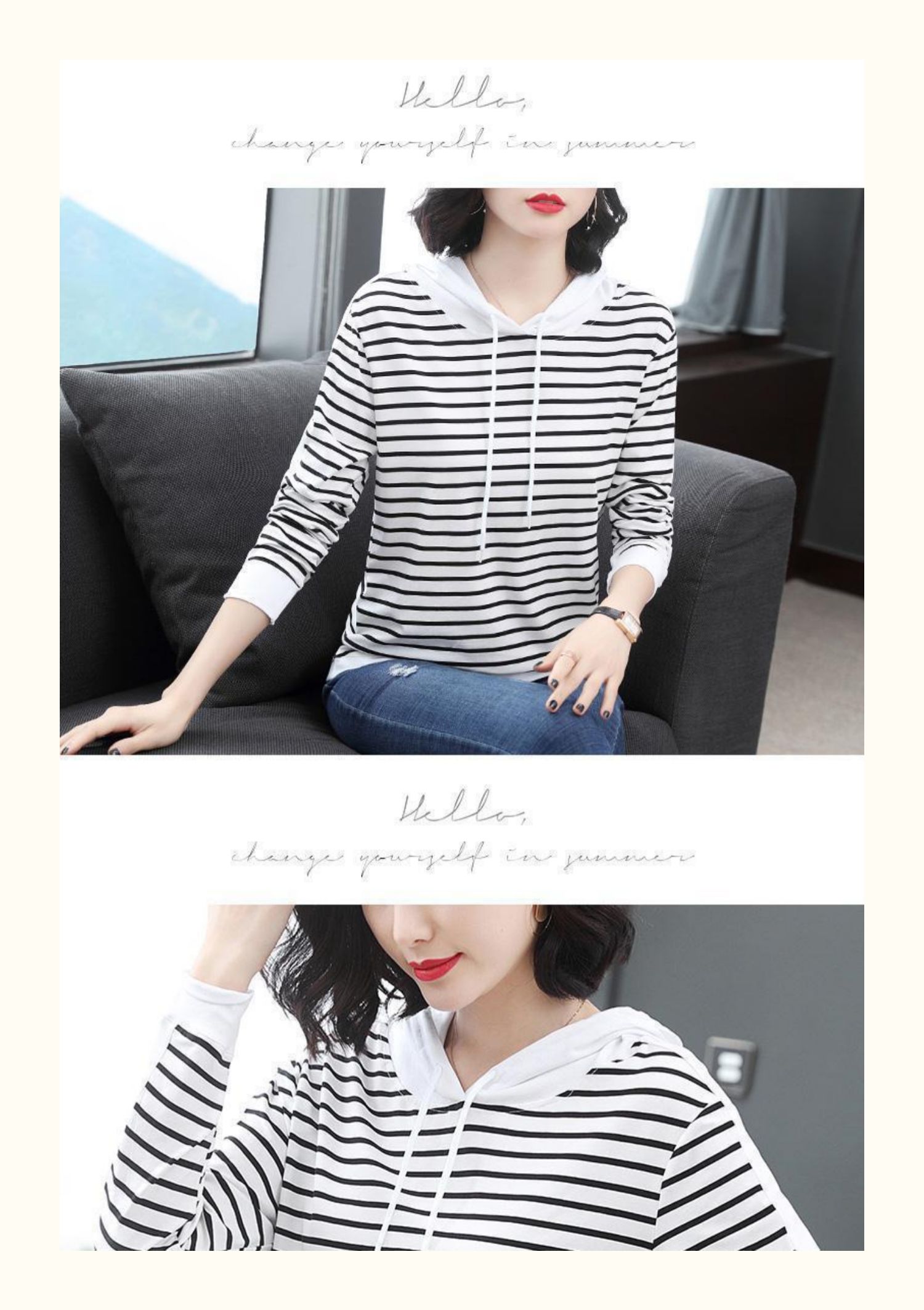 女士秋季新款棉质条纹长袖连帽t恤,宽松上衣服,中年妈妈装,大码打底衫,做工精良,手感细腻柔和,多款多色【增运费险】