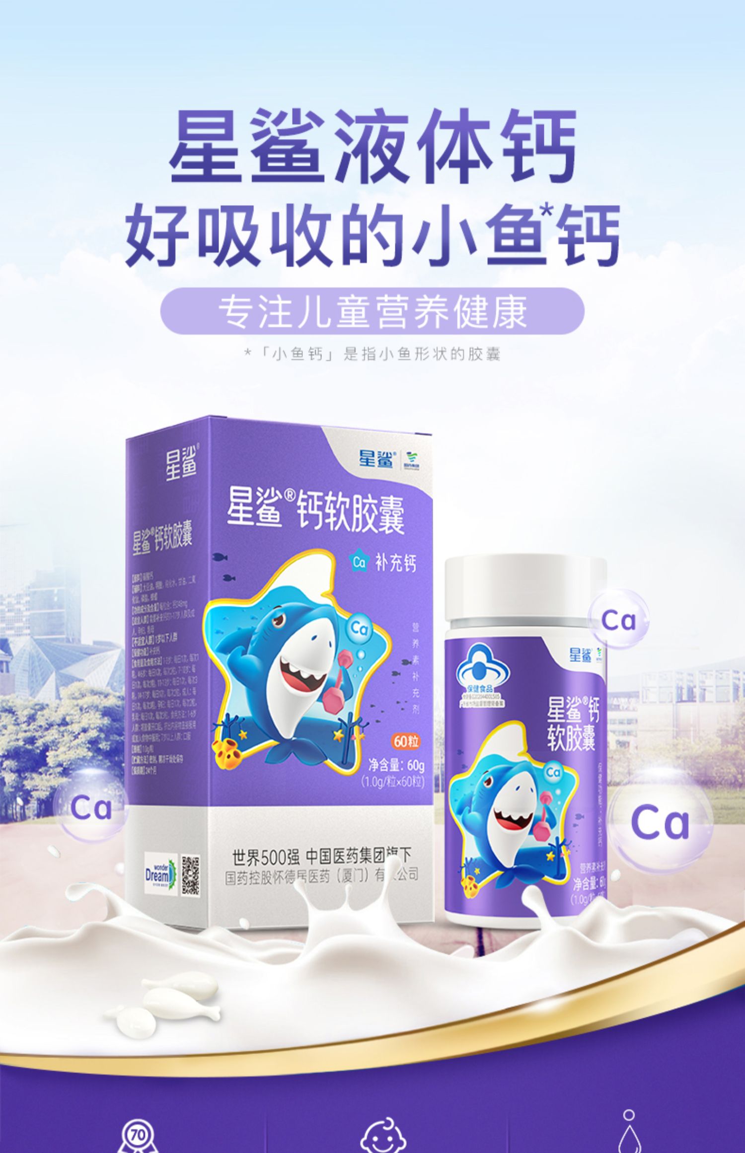 【送3盒维D+3条果冻】星鲨儿童钙软胶囊60粒