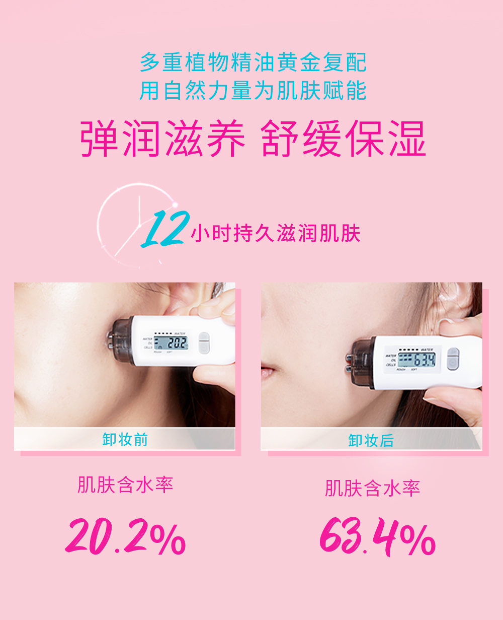 0硅油,9大植物油精粹,SPA级卸妆体验,1秒乳化清爽不油腻,防水彩妆轻松卸12小时持久滋润,卸妆养肤二合一,敏感肌放心用。