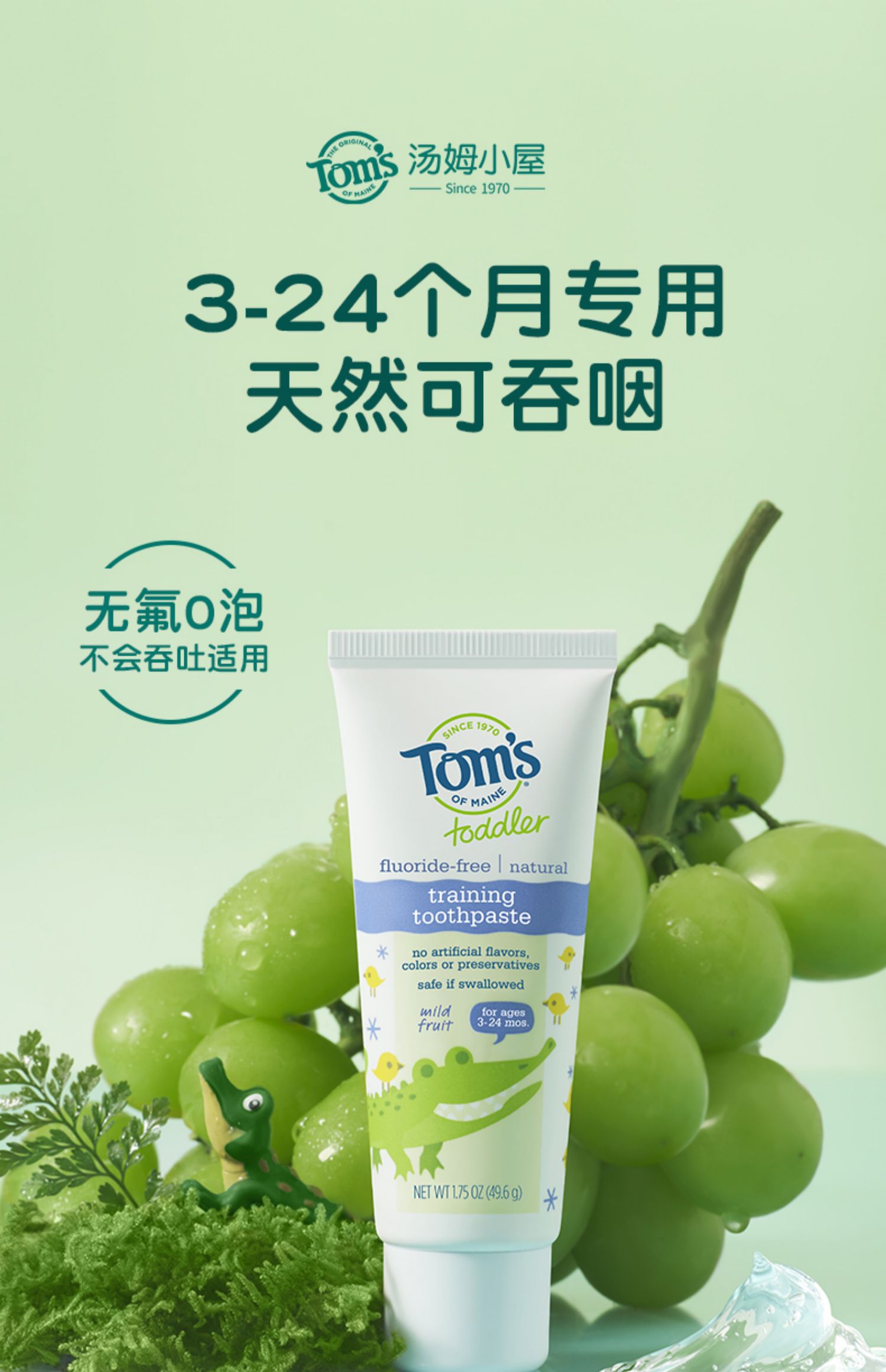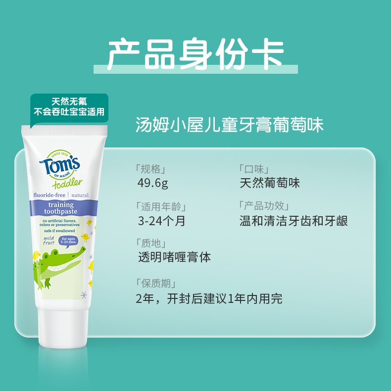 雪梨推荐,汤姆小屋3-24个月宝宝专用牙膏,天然成分,无氟0泡,安全可吞咽,植萃木糖醇,有效抑制致龋菌,清新微甜葡萄味,0泡配方无残留,6大0添加,妈妈更放心!