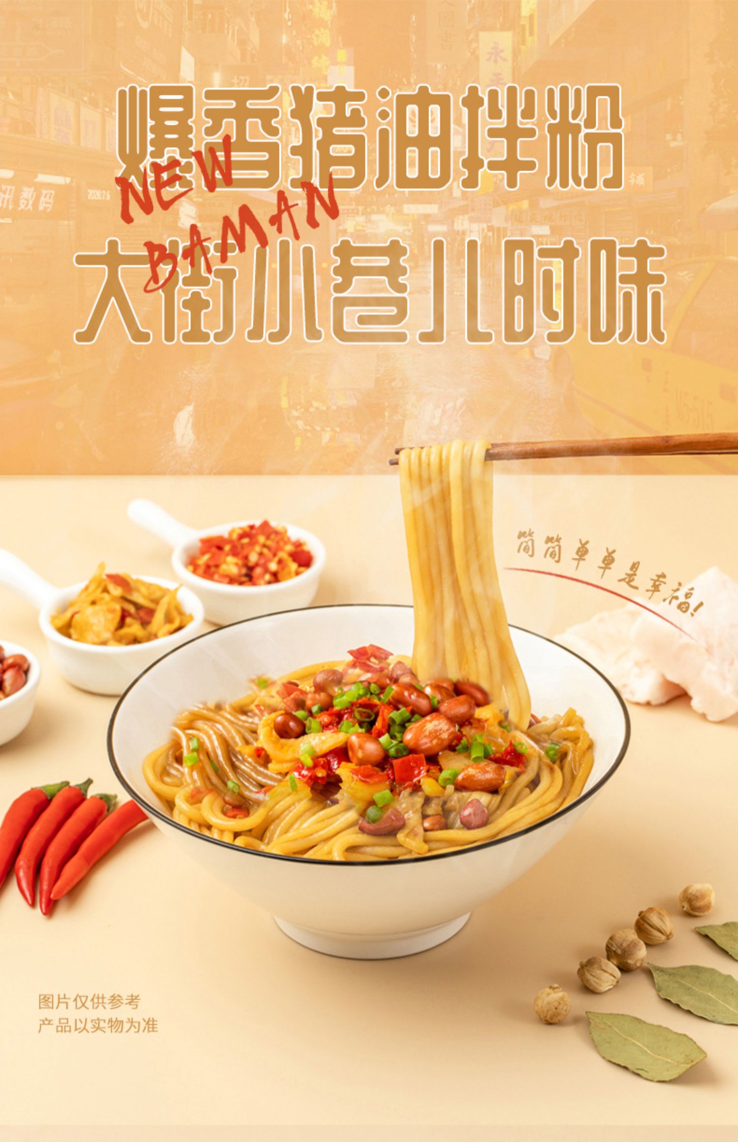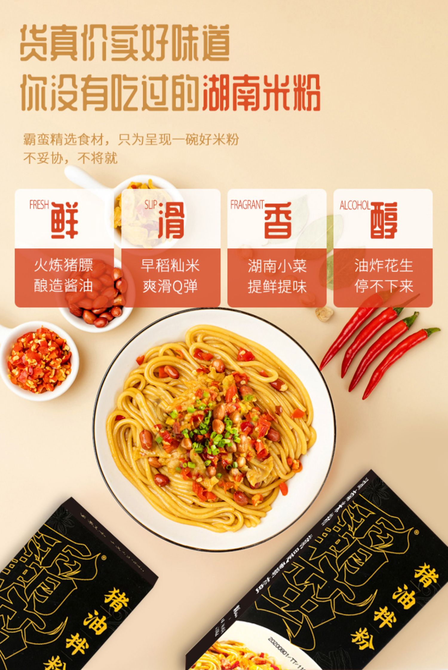 霸蛮猪油拌粉米粉,精选食材,只为做出一份精致的粉,火炼猪膘,酿造酱油,早稻籼米,丝滑Q弹,湖南正宗小菜,提鲜提味。