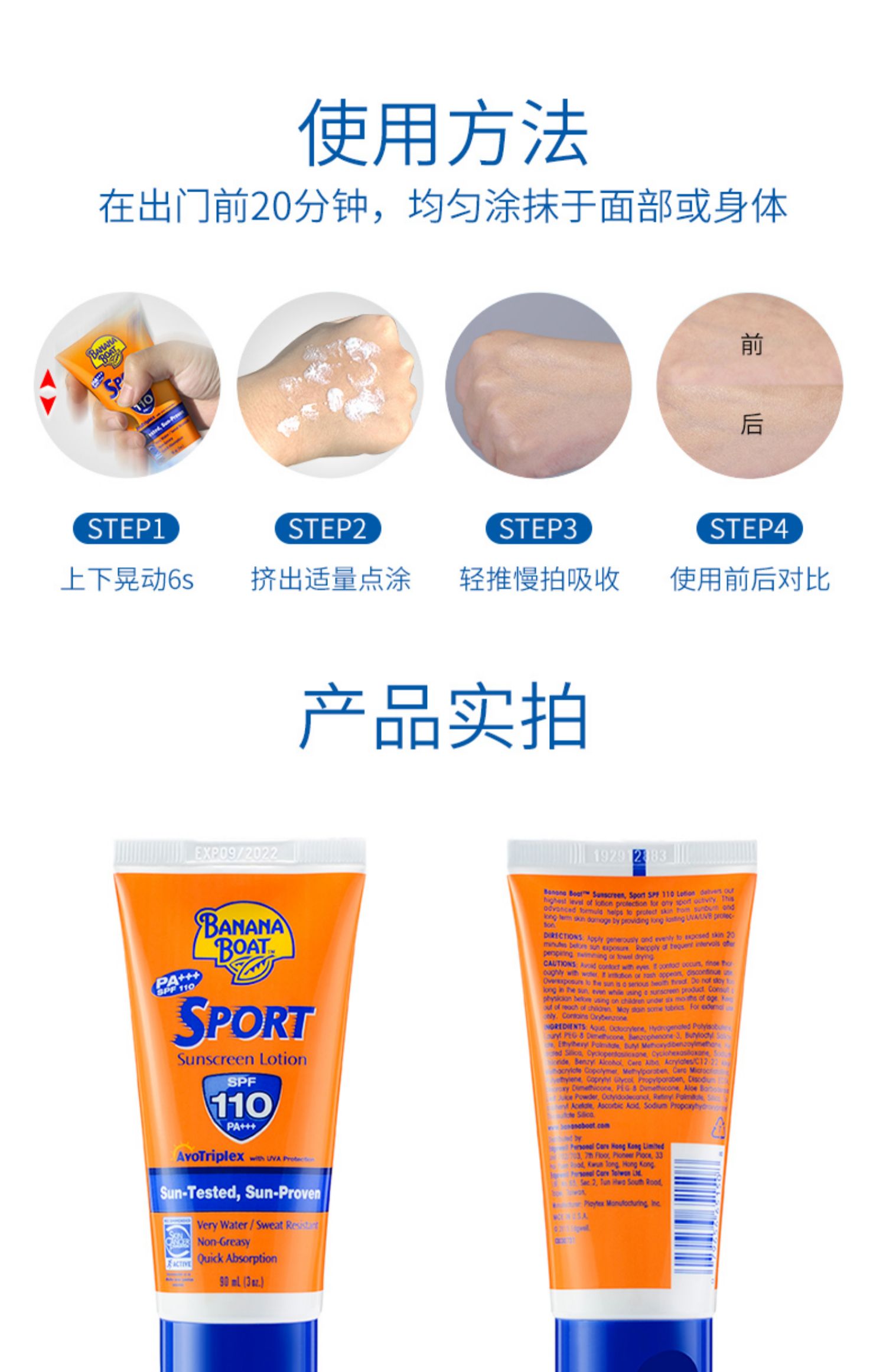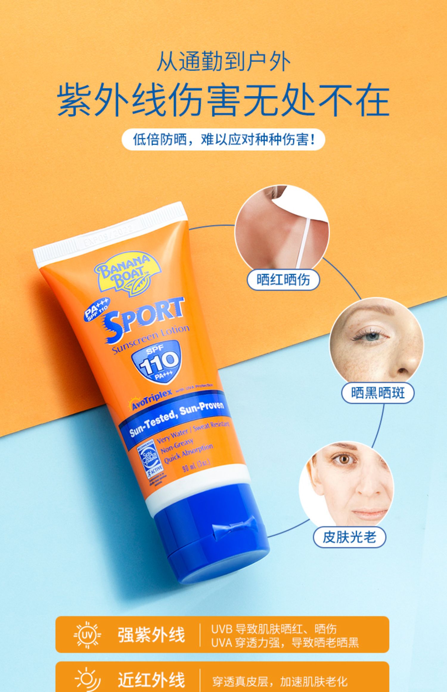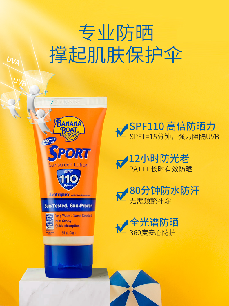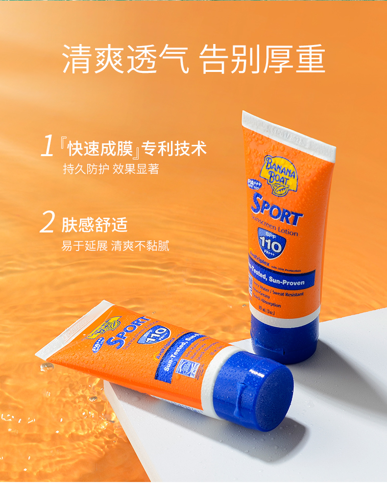 BananaBoat高倍运动防晒霜,美国原装进口,5小时持久防晒,让你不惧怕阳光,敢于自我,80分钟有效防水测试,防嗮成分不被海水冲洗,畅享海滩美好享晒~
