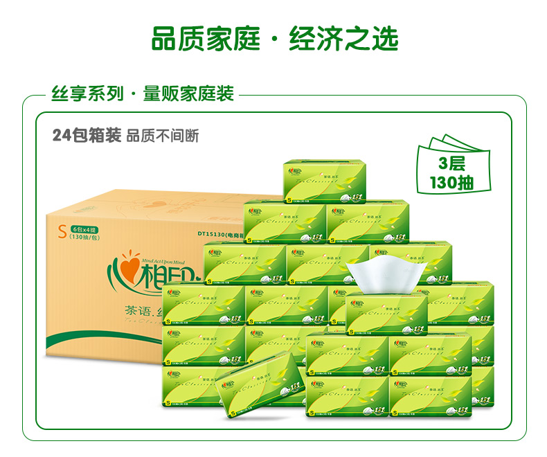 【心相印旗舰店】3层150抽24包量贩家庭装!韧性十足柔软亲肤,注重质感湿水不易破,三层压花表层不易分层,足量原生木浆,严格去菌把控,给家人一份安心~