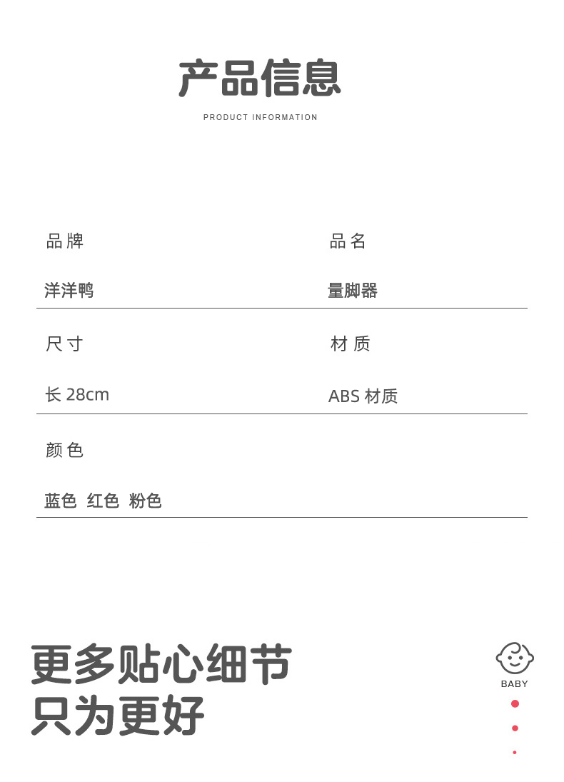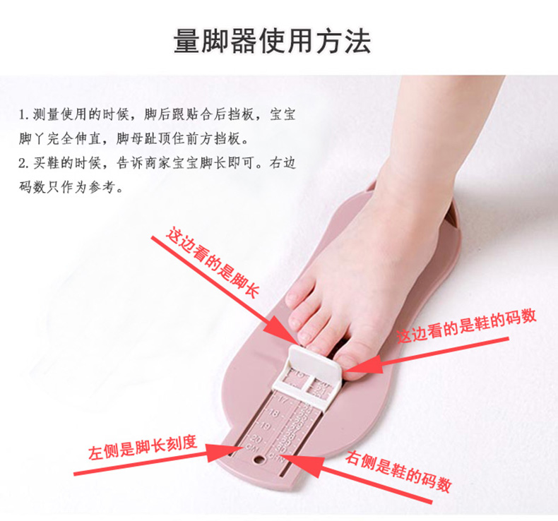 还在为每次给宝宝买鞋子尺寸不合适吗?还在为传统的测量方法费时间还不准发愁吗?试试我们的新款产品吧,准确测量宝贝脚长,方便简单,妈妈买鞋不用愁
