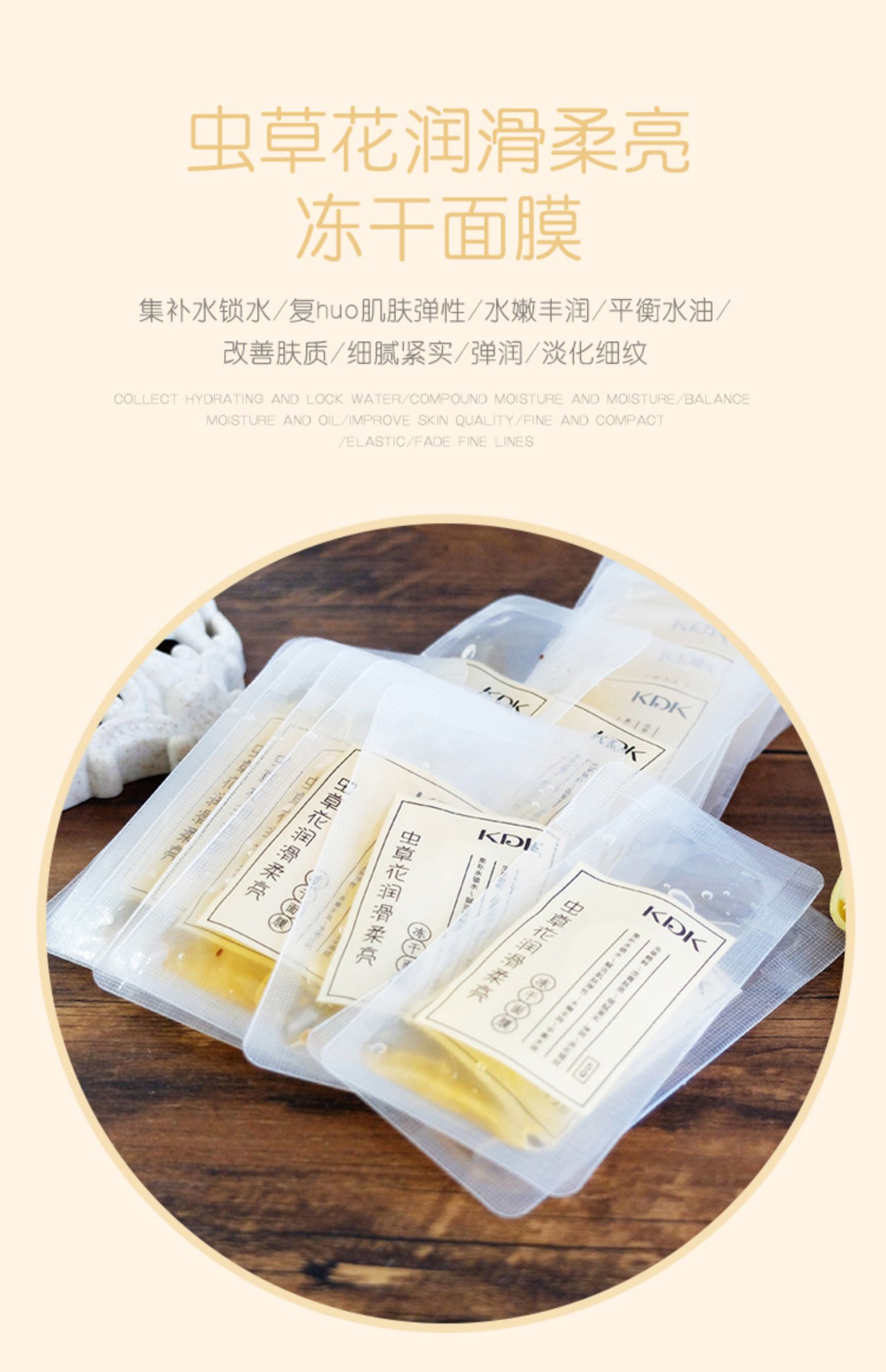 虫草花,润滑柔亮冻干面膜温和修护干燥肌肤,改善肌肤粗糙,滋润肌肤,增加肌肤弹性,具有滋养修护肌肤和锁水功效,使肌肤水润亮泽。