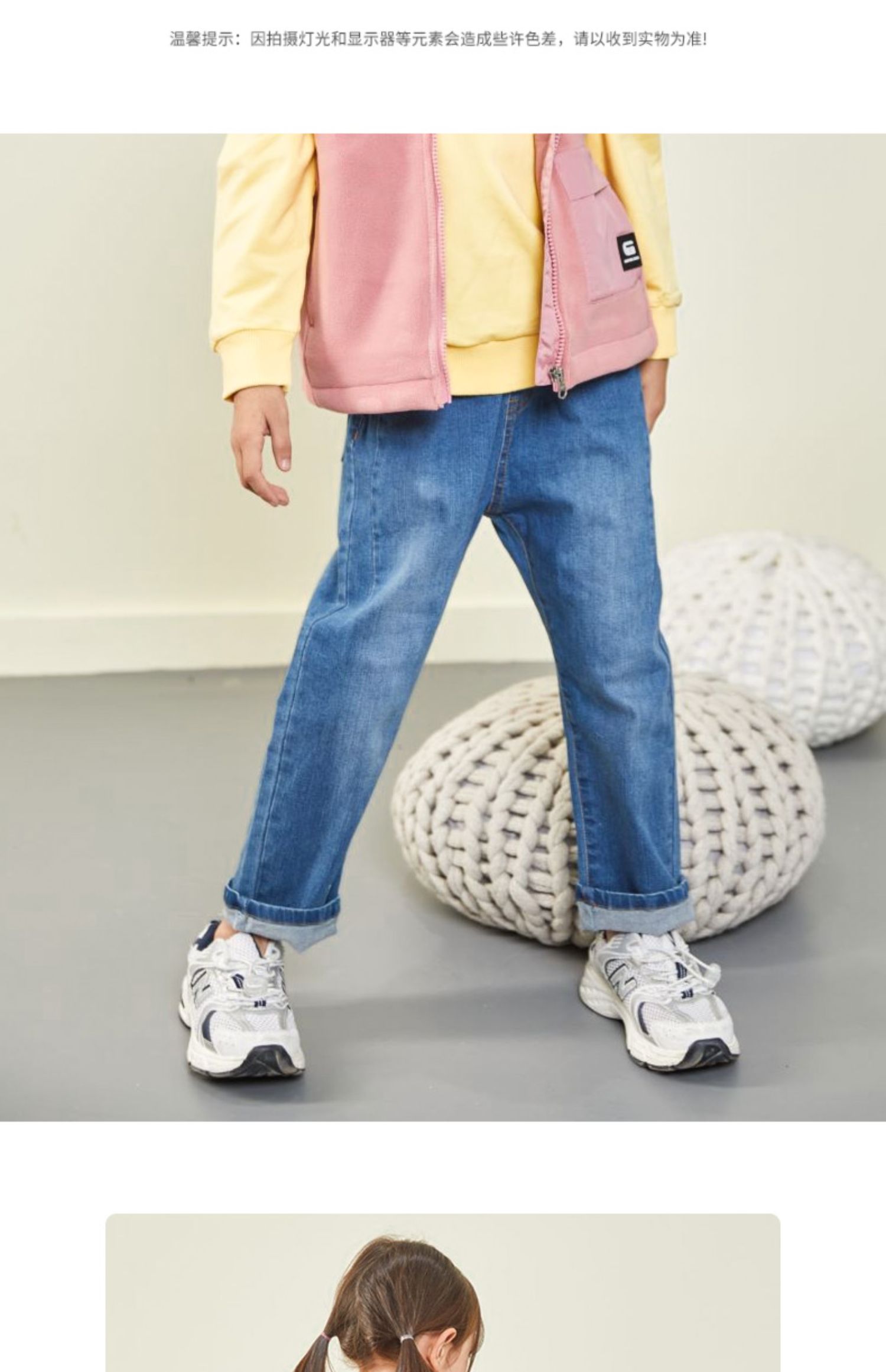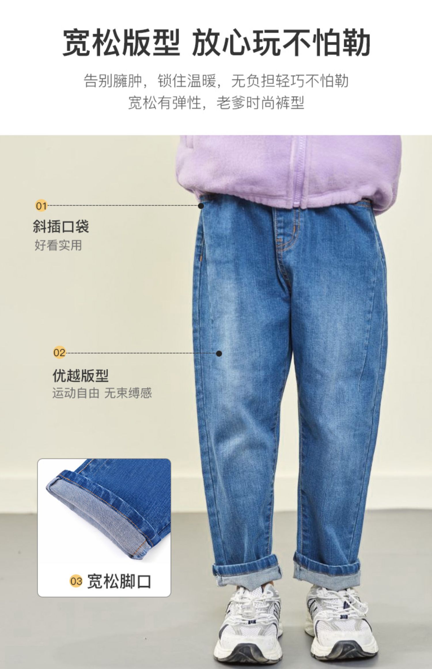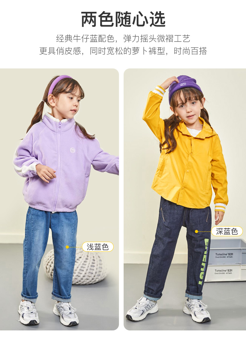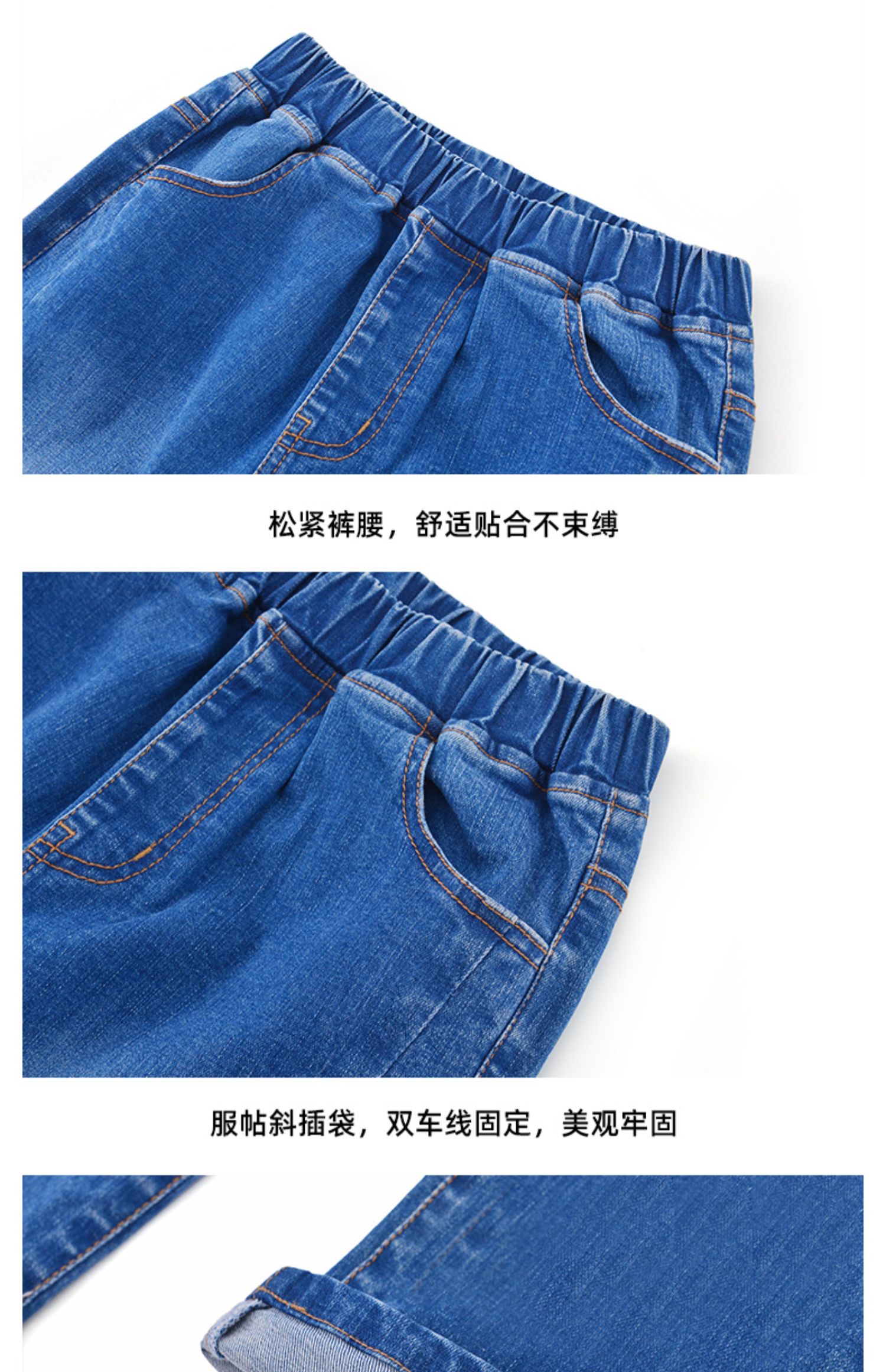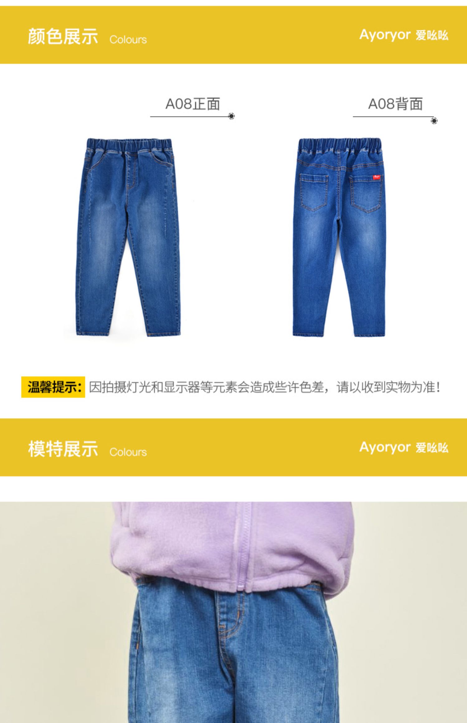 爱吆吆春季儿童牛仔长裤,精选优质纯棉面料,上身柔软舒适透气,水洗不褪色,松紧裤腰不勒人,宽松裤型,有肉宝贝也可以穿