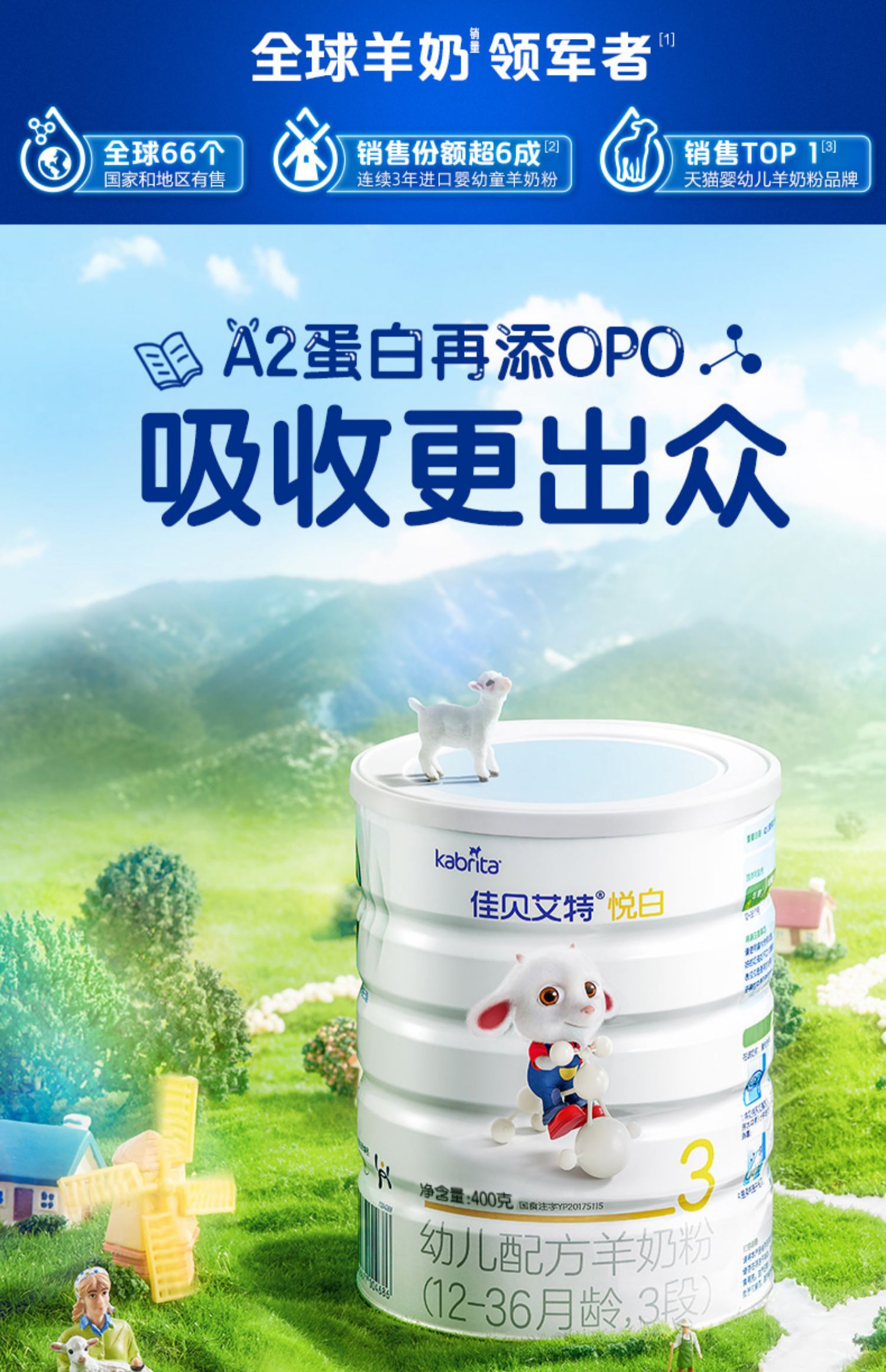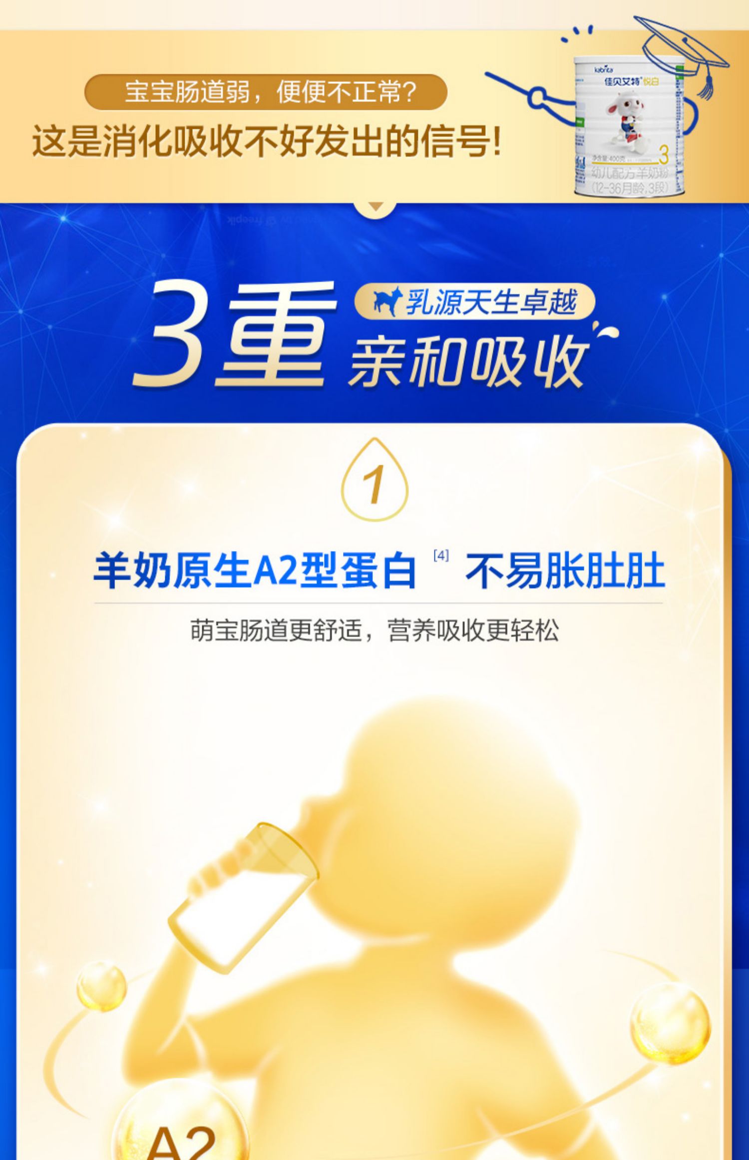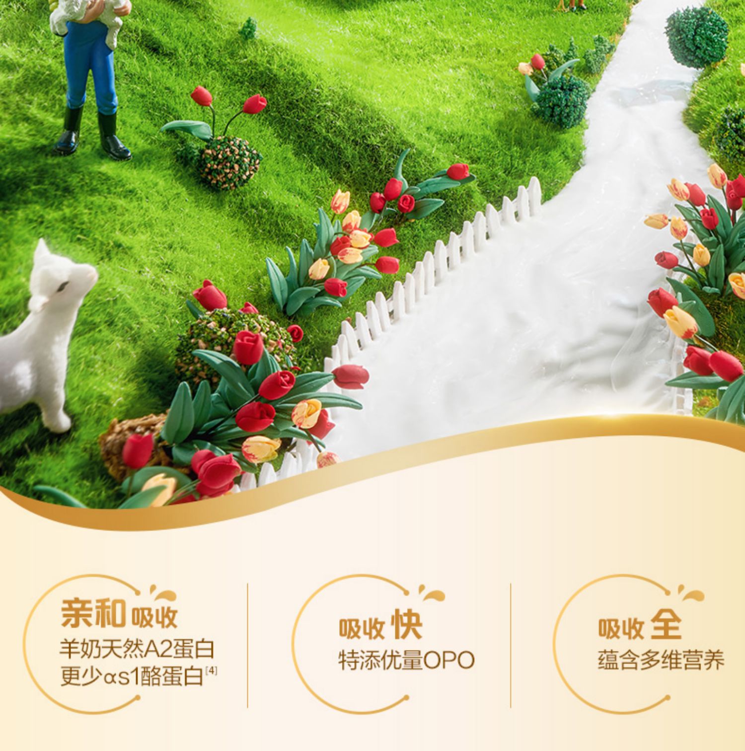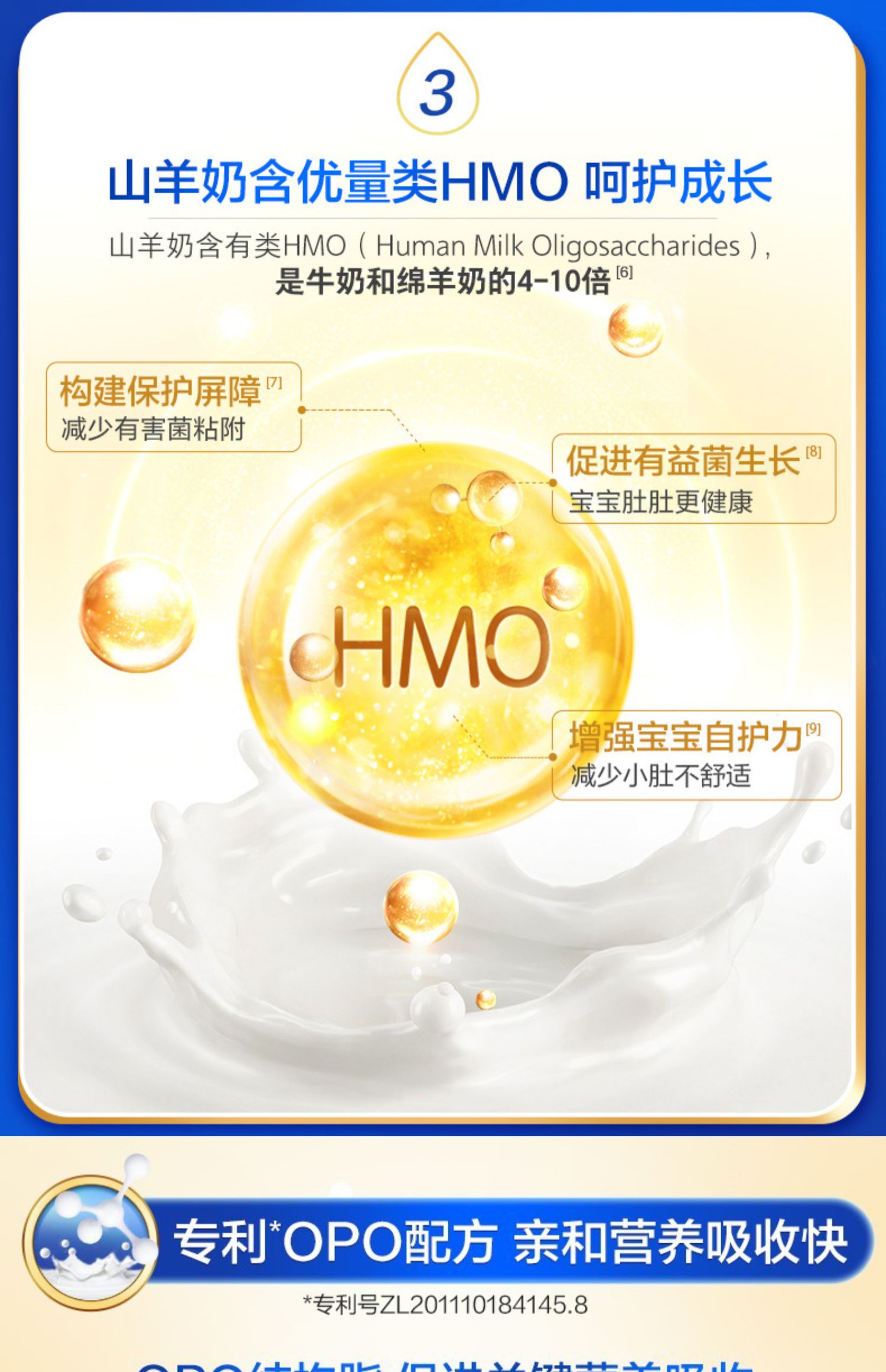 3段羊奶粉,羊奶原生A2型蛋白,不易涨肚,萌宝肠道更舒适,营养吸收更轻松,山羊奶含有HMO,促进有益菌生长,增强宝宝自护力。