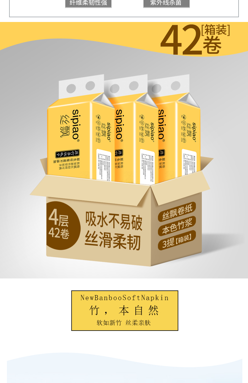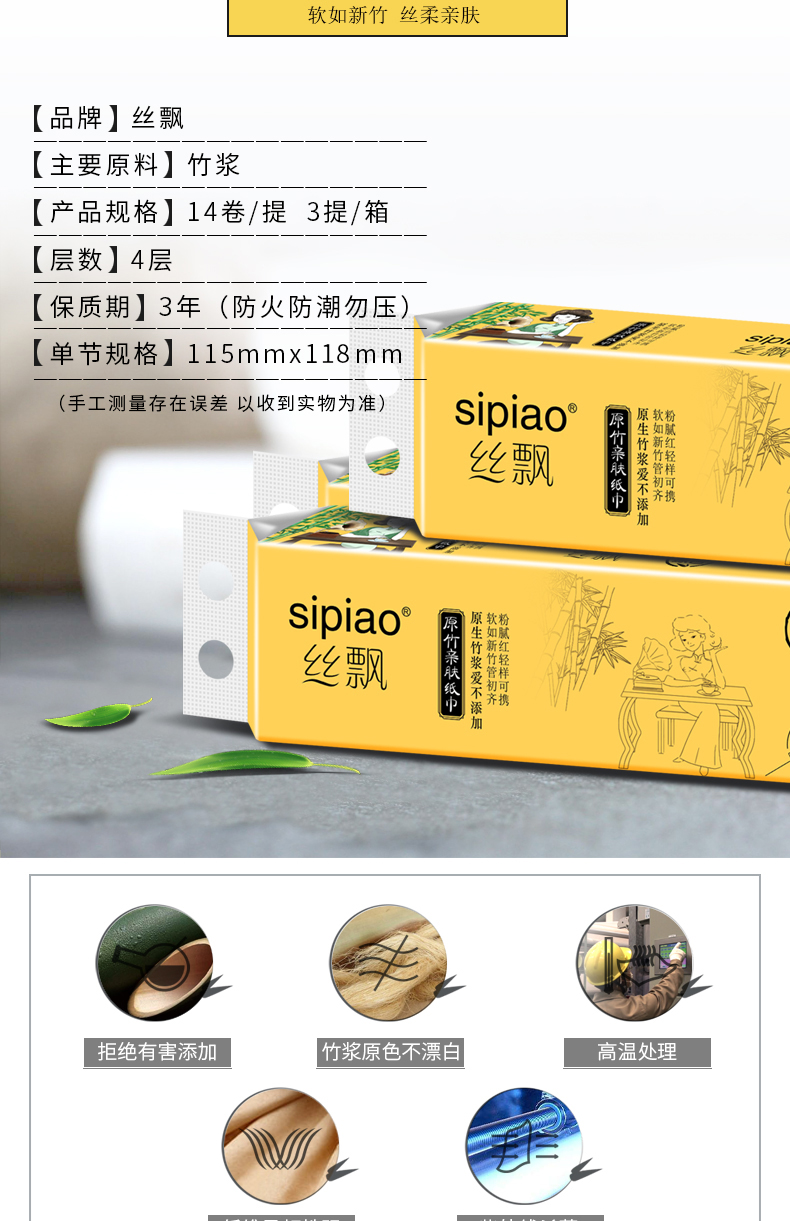 丝飘本色卷纸3提共42卷,优质原生木浆,亲肤无刺激,干湿两用,四层加厚,棉韧不易破,食品级,大人小孩全家都适用!