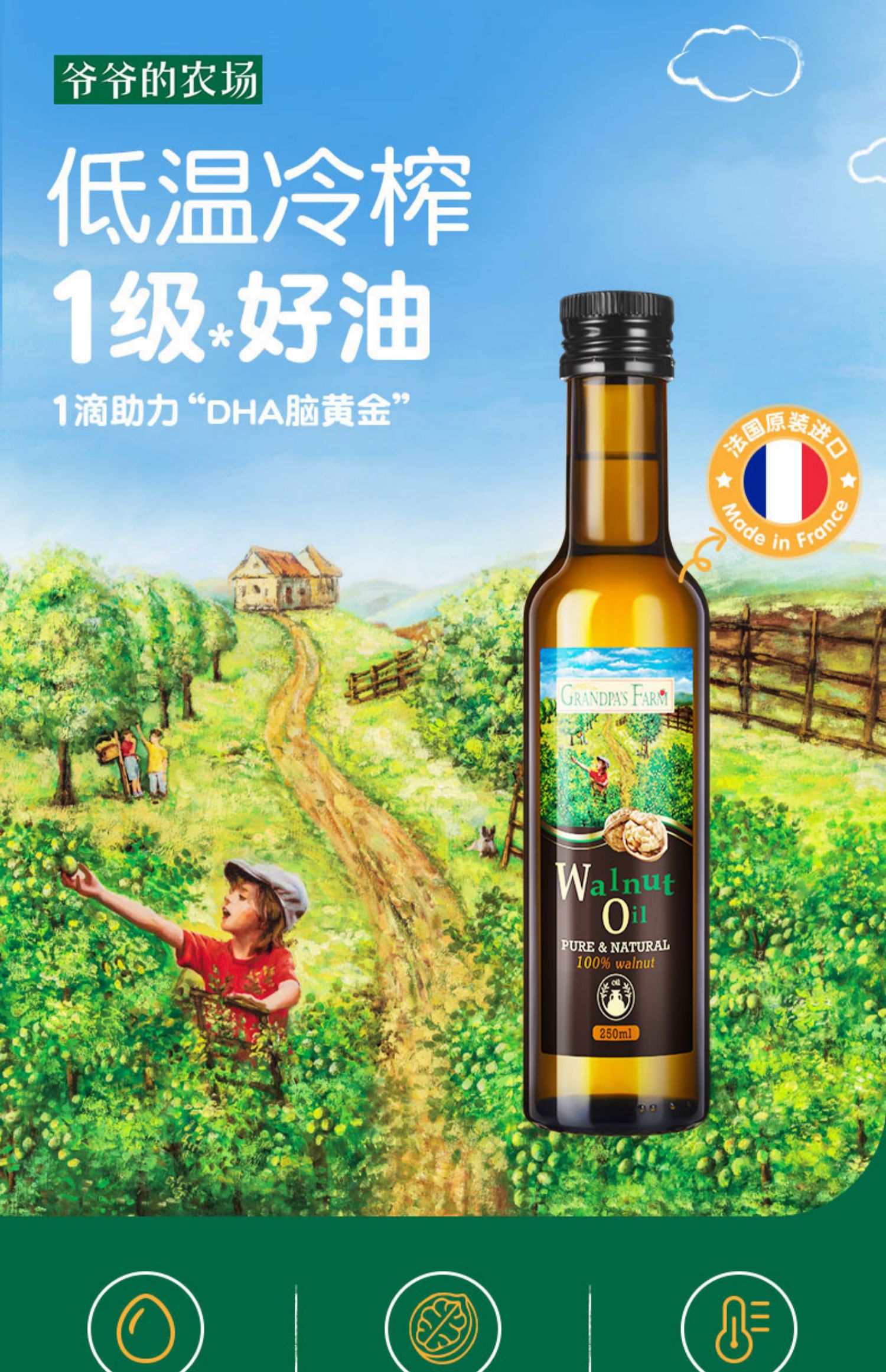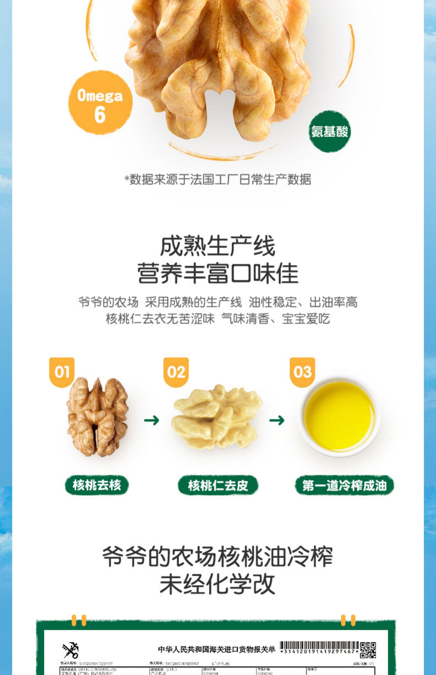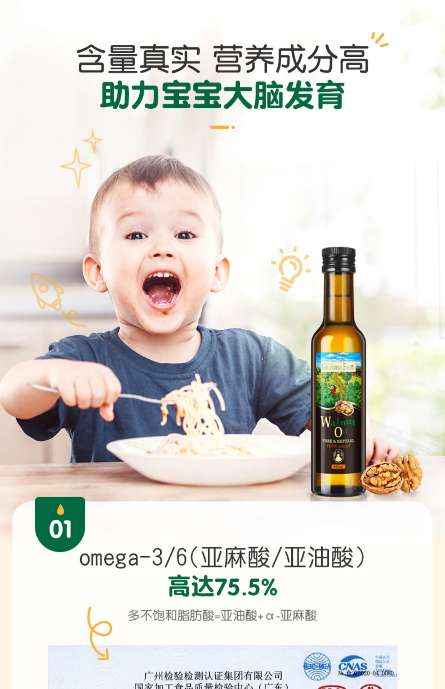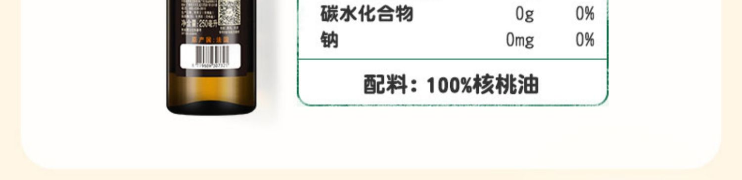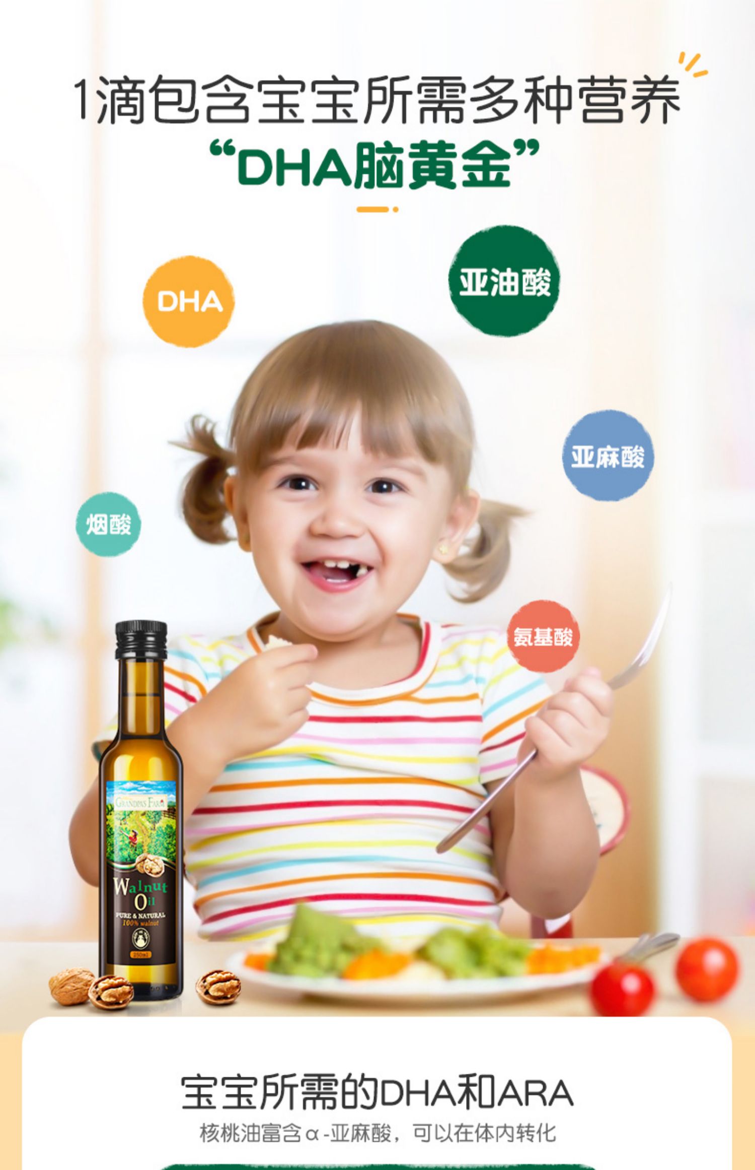 法国原装进口,纯核桃低温冷榨,富含多不饱和脂肪酸,专属宝宝的一瓶好油。易吸收、不上火,宝宝好吸收。辅食加一滴,美味吃饭香。