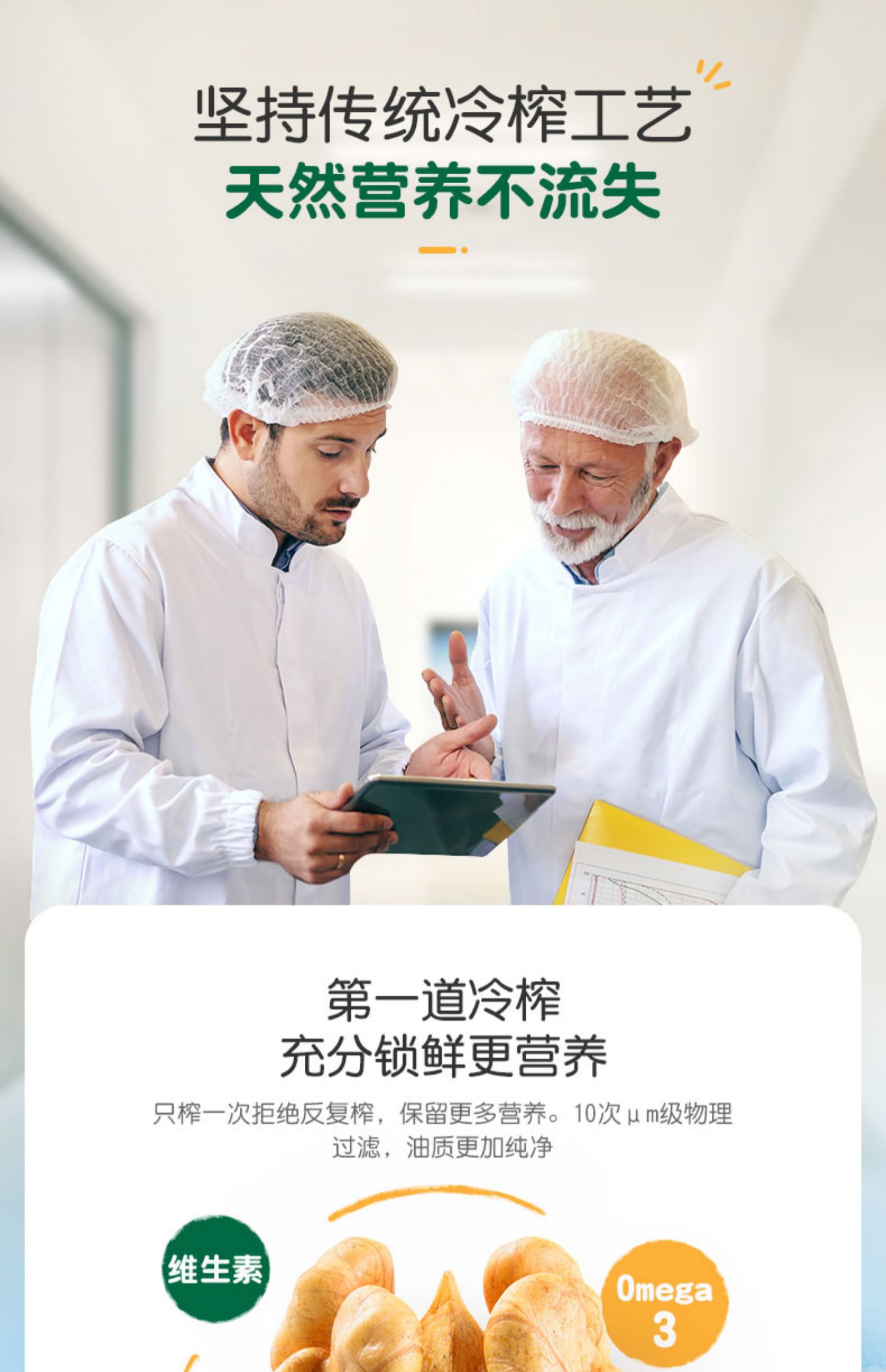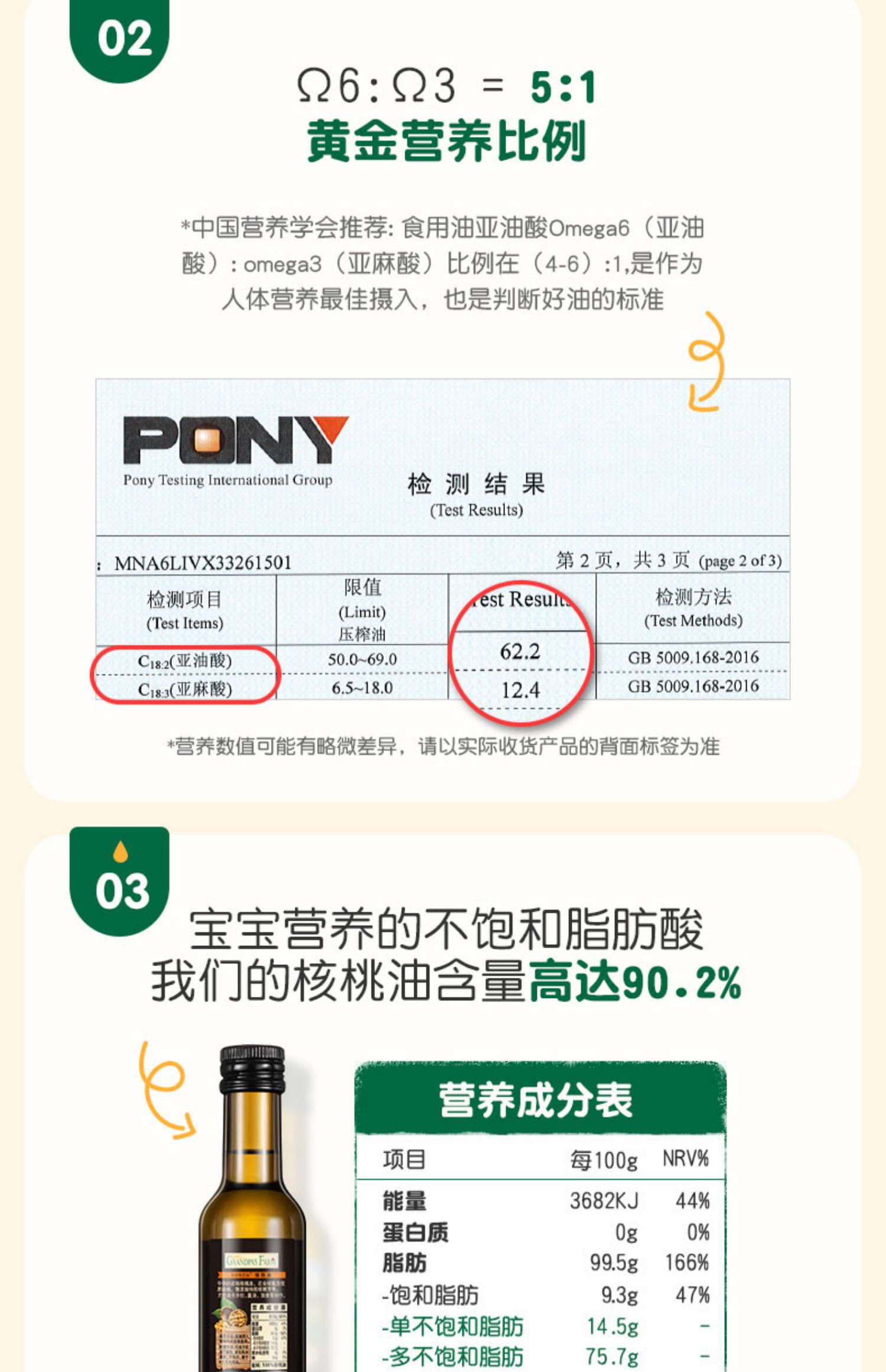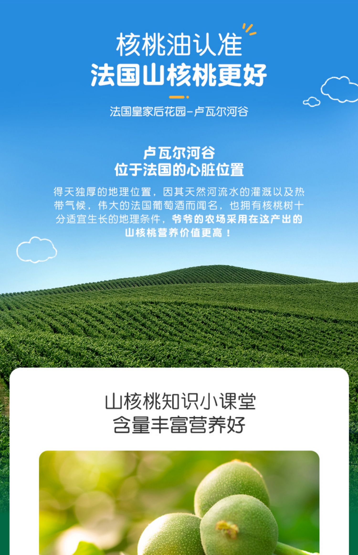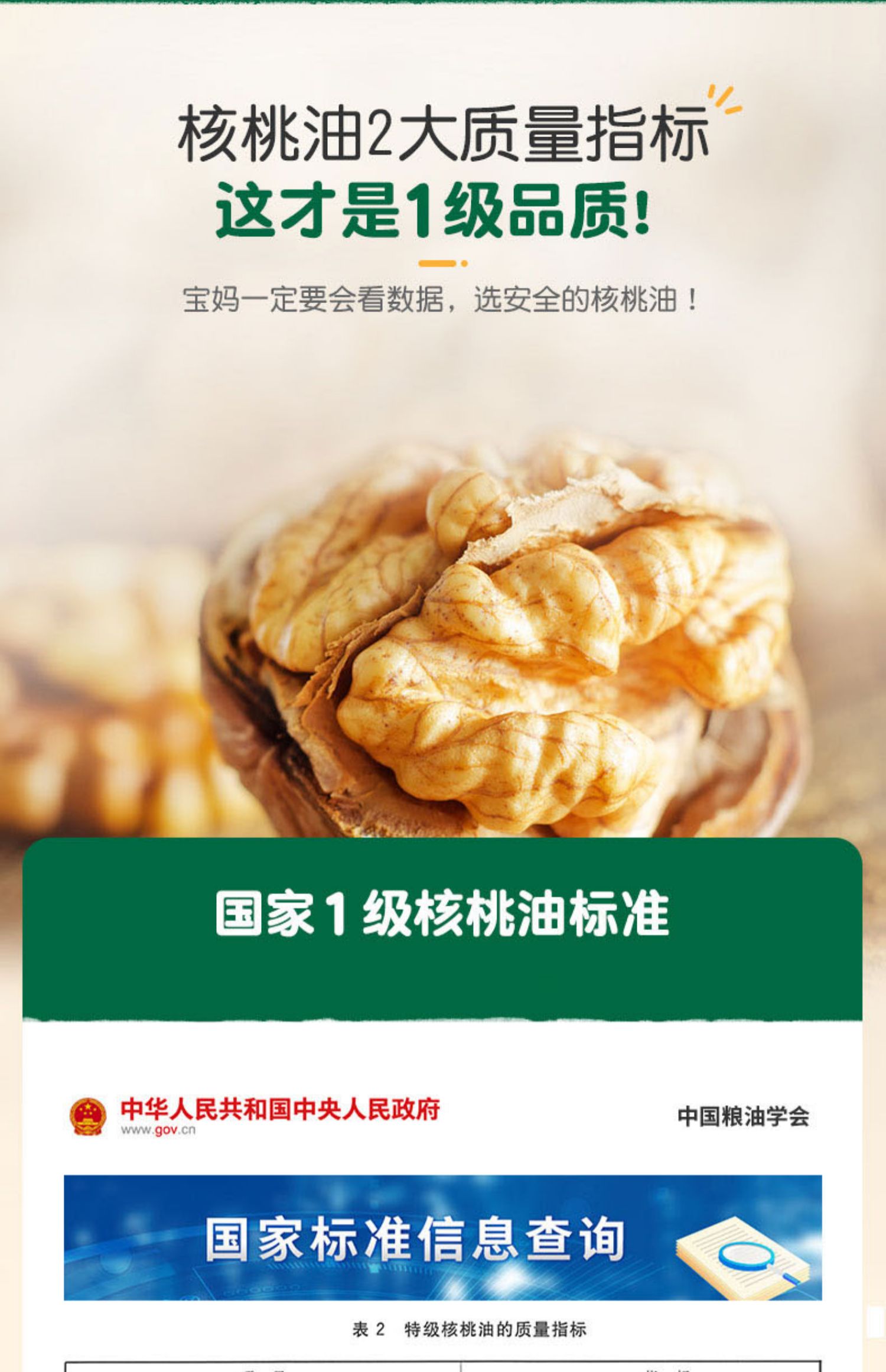 法国原装进口,纯核桃低温冷榨,富含多不饱和脂肪酸,专属宝宝的一瓶好油。易吸收、不上火,宝宝好吸收。辅食加一滴,美味吃饭香。