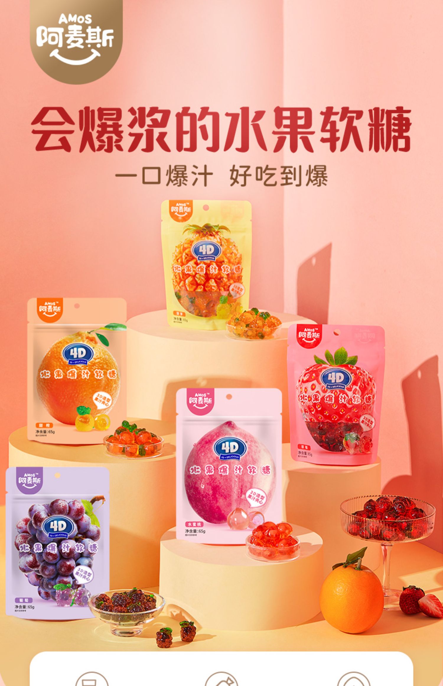 【阿麦斯】4d爆浆爆汁水果果汁夹心软糖,超多口味可选,浓郁的水果味,口感是软的,咬破之后中间是爆浆的,超级好吃!