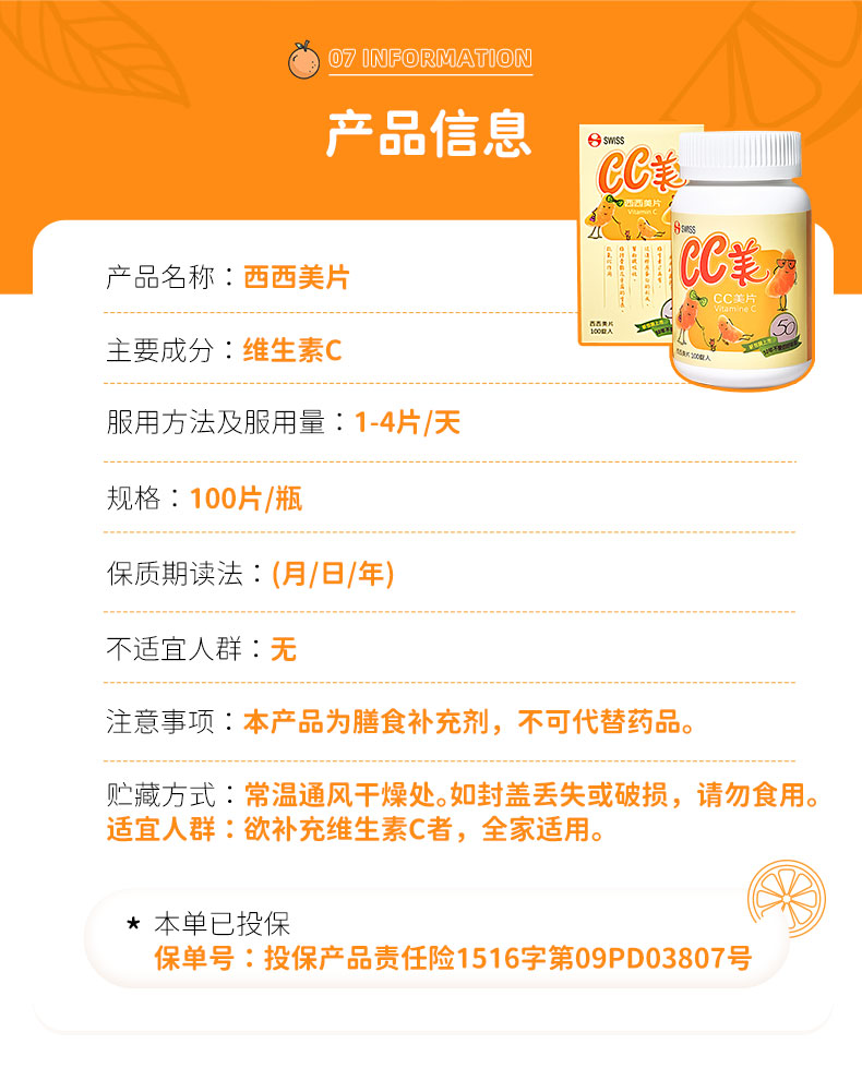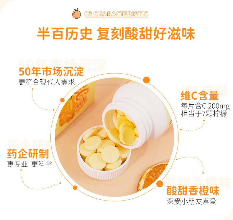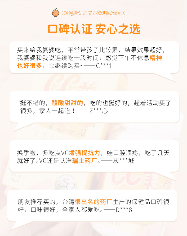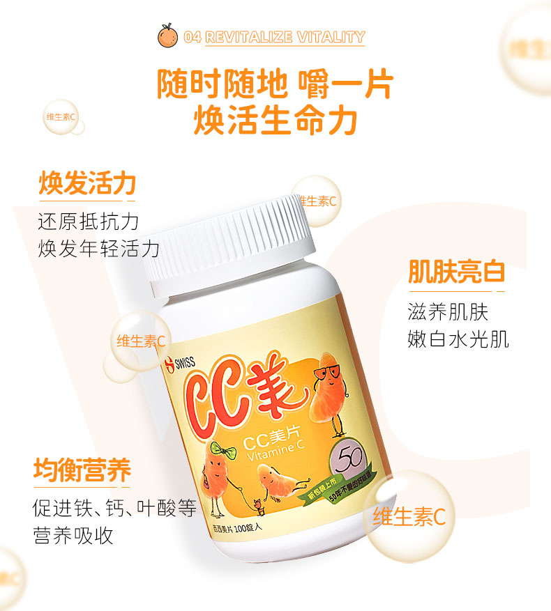 每片含维生素C200mg,嚼着吃的vc,含量丰富,酸甜好滋味,提高免疫力!每天1粒,更有活力,经常补充维C,还能美容养颜!