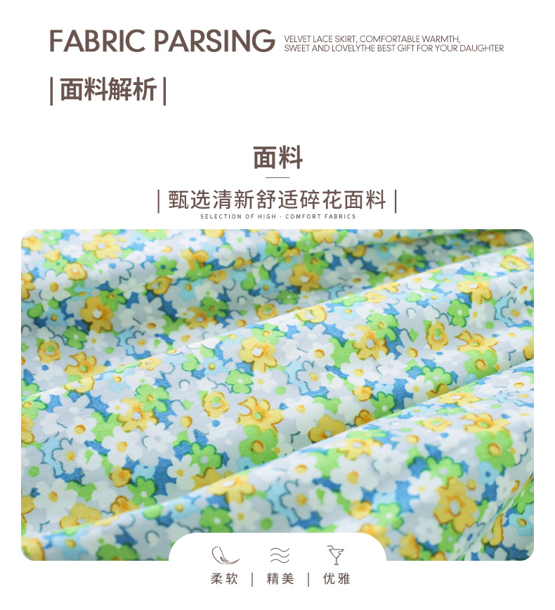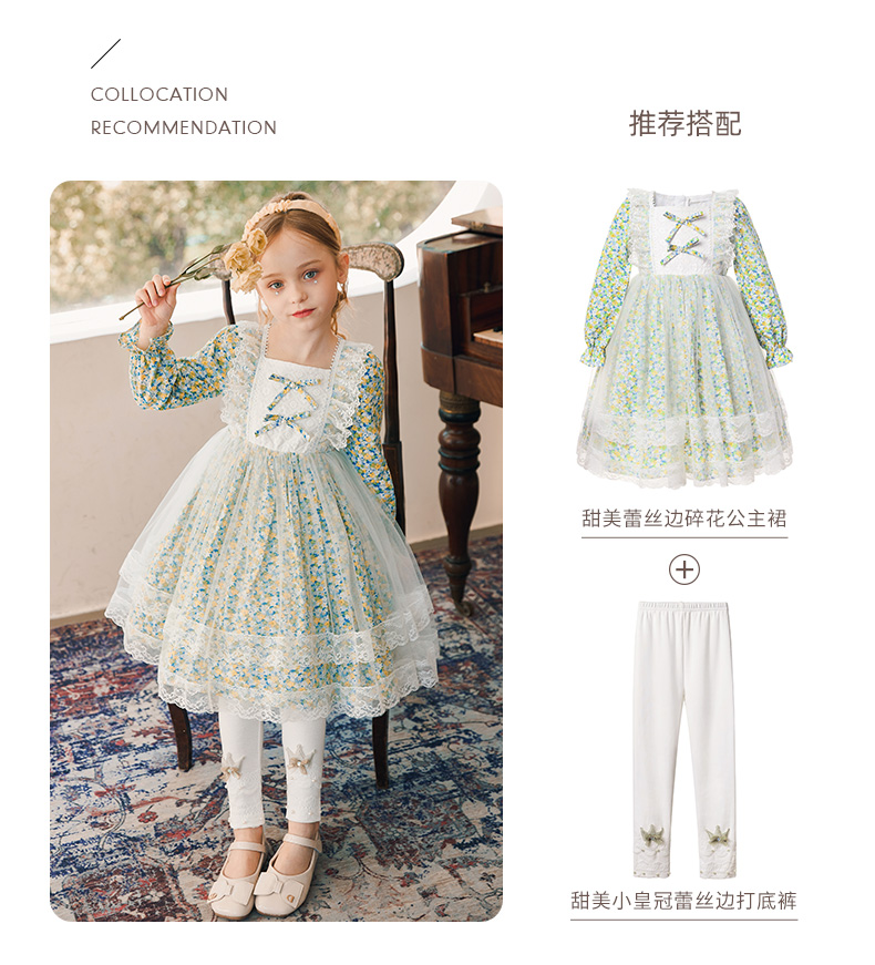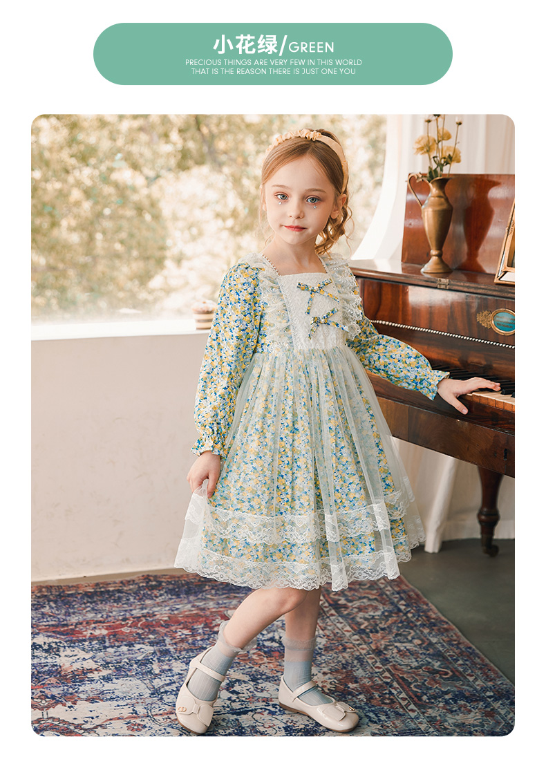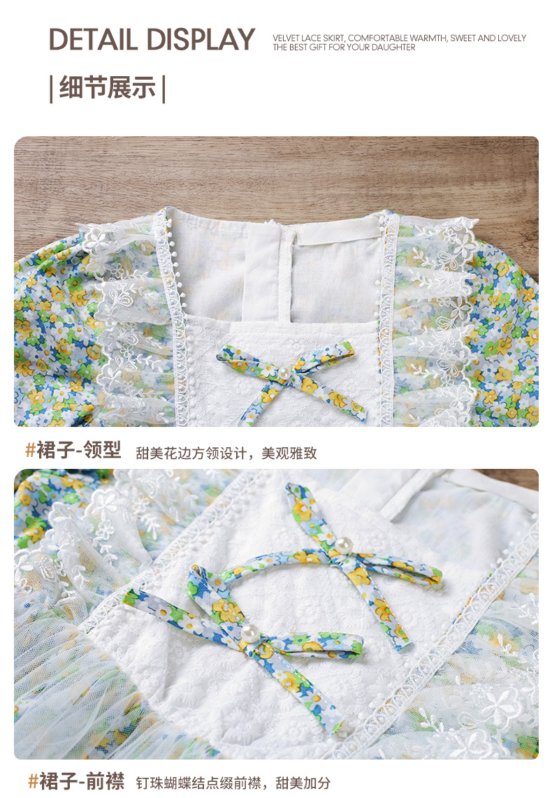甜美蕾丝花边领口,浪漫碎花网纱裙摆,清新淡雅的碎花绿色调,别致优雅,俏皮可爱又不失公主风,仿佛行走在人间的小仙子~