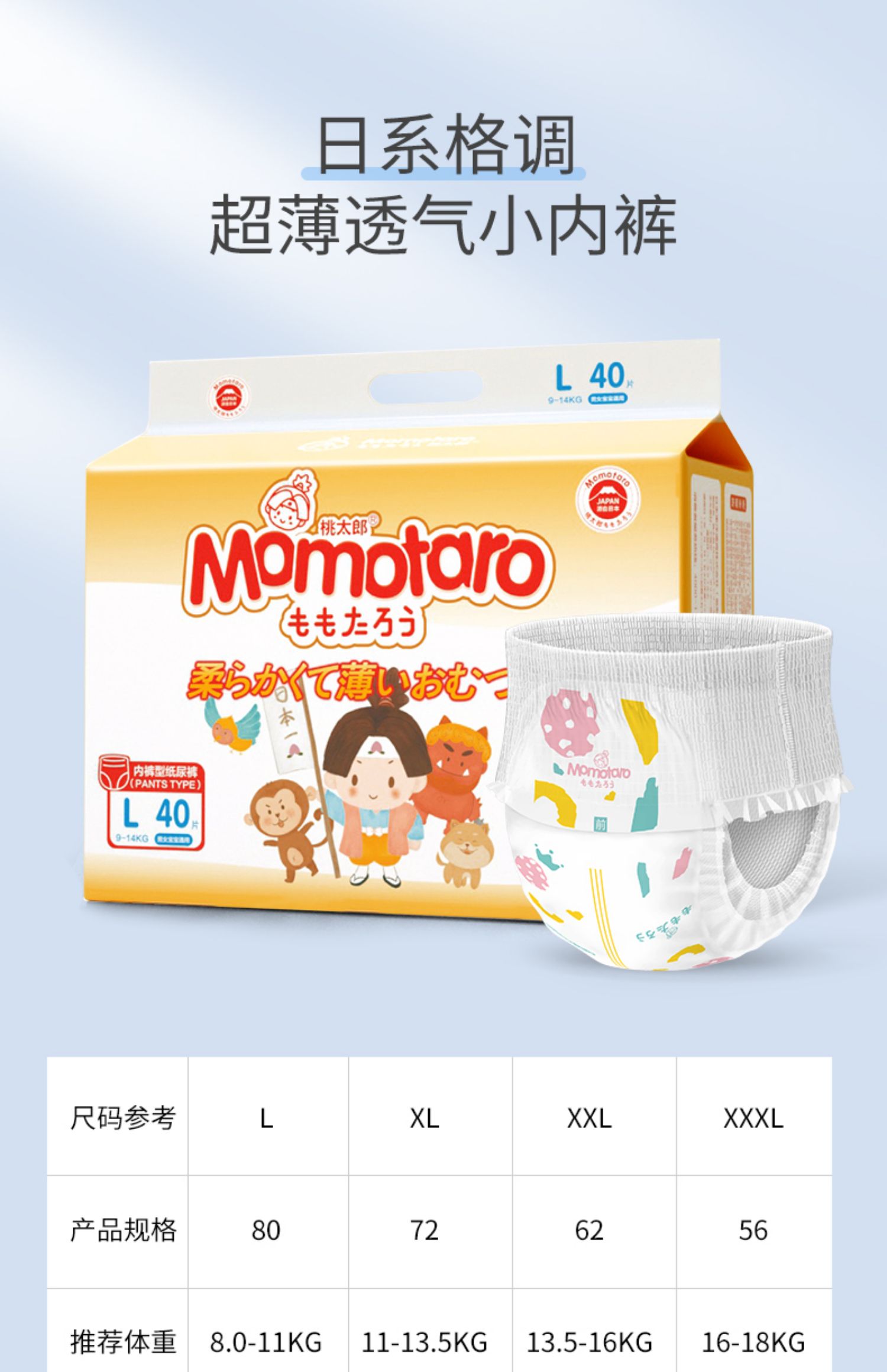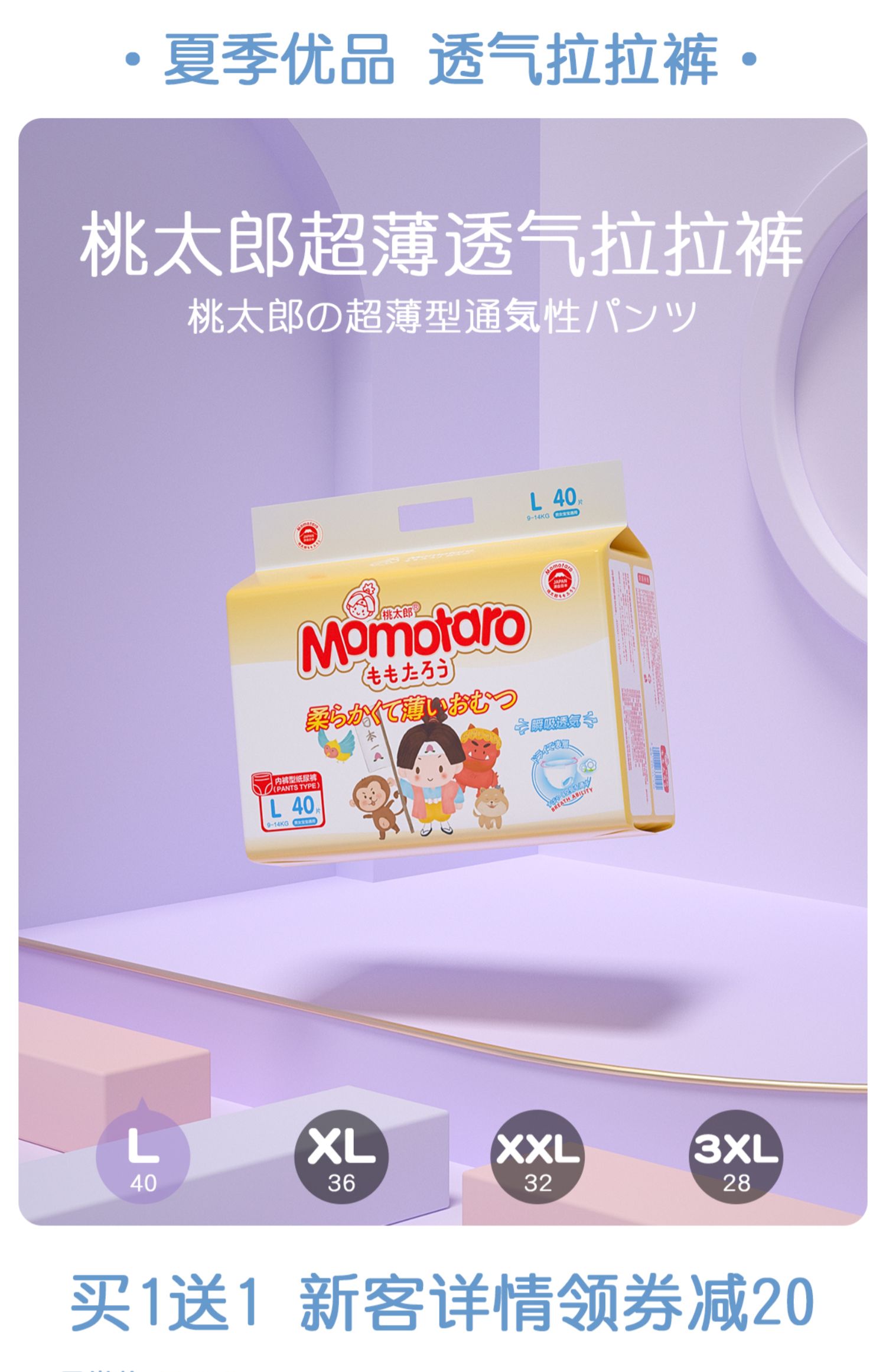 【买一送一!下单备注尺码款式】桃太郎纸尿裤/拉拉裤,贴身不漏,360度弹性腰围符合人体工学立体设计,薄的刚好不黏腻,瞬吸干爽,拒绝红屁屁!一拉即穿,宝妈安心买宝宝放心穿~【赠运费险】